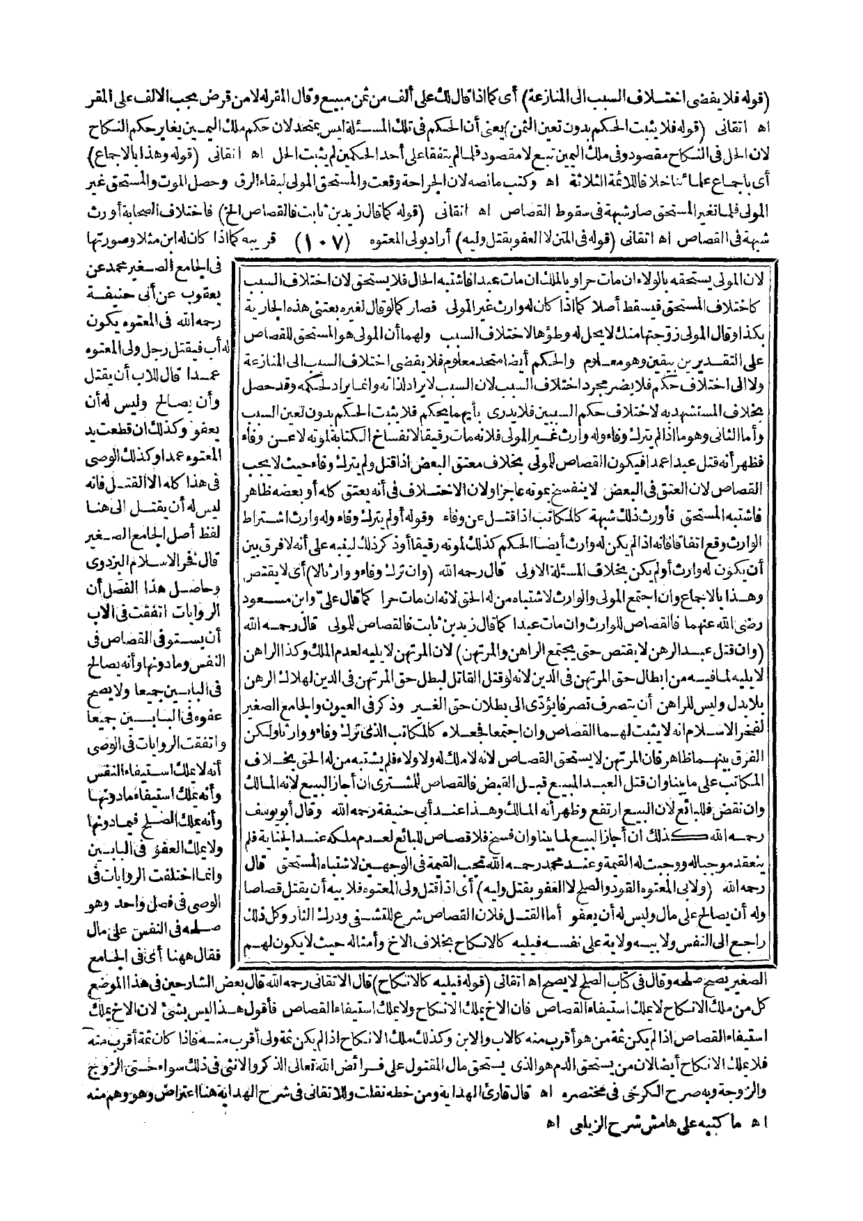 ـــــــــــــــــــــــــــــQقَوْلُهُ فَلَا يُفْضِي اخْتِلَافُ السَّبَبِ إلَى الْمُنَازَعَةِ) أَيْ كَمَا إذَا قَالَ لَك عَلَيَّ أَلْفٌ مِنْ ثَمَنِ مَبِيعٍ وَقَالَ الْمُقَرُّ لَهُ لَا مِنْ قَرْضٍ يَجِبُ الْأَلْفُ عَلَى الْمُقِرِّ اهـ أَتْقَانِيٌّ (قَوْلُهُ فَلَا يَثْبُتُ الْحُكْمُ بِدُونِ تَعَيُّنِ الثَّمَنِ) يَعْنِي أَنَّ الْحُكْمَ فِي تِلْكَ الْمَسْأَلَةِ لَيْسَ بِمُتَّحِدٍ؛ لِأَنَّ حُكْمَ مِلْكِ الْيَمِينِ يُغَايِرُ حُكْمَ النِّكَاحِ؛ لِأَنَّ الْحِلَّ فِي النِّكَاحِ مَقْصُودٌ وَفِي مِلْكِ الْيَمِينِ تَبَعٌ لَا مَقْصُودَ فَلَمَّا لَمْ يَتَّفِقَا عَلَى أَحَدِ الْحُكْمَيْنِ لَمْ يَثْبُتْ الْحِلُّ. اهـ. أَتْقَانِيٌّ (قَوْلُهُ، وَهَذَا بِالْإِجْمَاعِ) أَيْ بِإِجْمَاعِ عُلَمَائِنَا خِلَافًا لِلْأَئِمَّةِ الثَّلَاثَةِ اهـ وَكَتَبَ مَا نَصُّهُ؛ لِأَنَّ الْجِرَاحَةَ وَقَعَتْ وَالْمُسْتَحِقُّ الْمَوْلَى لِبَقَاءِ الرِّقِّ وَحَصَلَ الْمَوْتُ وَالْمُسْتَحِقُّ غَيْرُ الْمَوْلَى فَلَمَّا تَغَيَّرَ الْمُسْتَحِقُّ صَارَ شُبْهَةً فِي سُقُوطِ الْقِصَاصِ اهـ أَتْقَانِيٌّ (قَوْلُهُ كَمَا قَالَ زَيْدُ بْنُ ثَابِتٍ فَالْقِصَاصُ إلَخْ) فَاخْتِلَافُ الصَّحَابَةِ أَوْرَثَ شُبْهَةً فِي الْقِصَاصِ. اهـ. أَتْقَانِيٌّ