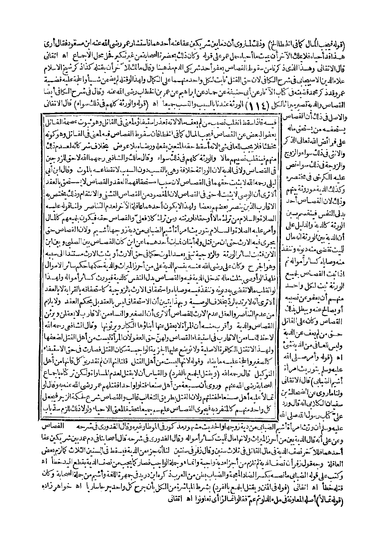 وَقَالَ الْقُدُورِيُّ فِي شَرْحِهِ قَالَ أَصْحَابُنَا فِي دَمِ عَمْدٍ بَيْنَ شَرِيكَيْنِ عَفَا أَحَدُهُمَا فَلِلْآخَرِ نِصْفُ الدِّيَةِ فِي مَالِ الْقَاتِلِ فِي ثَلَاثِ سِنِينَ، وَقَالَ زُفَرُ فِي سَنَتَيْنِ لَنَا أَنَّهُ جُزْءٌ مِنْ الدِّيَةِ فَيَسْقُطُ فِي السِّنِينَ الثَّلَاثِ كَمَا لَزِمَ بَعْضَ الْعَاقِلَةِ وَجْهُ قَوْلِ زُفَرَ أَنَّ نِصْفَ الدِّيَةِ لَمْ تَلْزَمْ مِنْ أَجْزَاءِ دِيَةٍ وَاجِبَةٍ وَإِنَّمَا هُوَ جُمْلَةُ الْوَاجِبِ فَصَارَ كَمَا يَجِبُ مِنْ نِصْفِ الدِّيَةِ بِقَطْعِ الْيَدِ خَطَأً اهـ وَكَتَبَ عَلَى قَوْلِهِ الضِّبَابِيُّ مَا نَصُّهُ بِكَسْرِ الضَّادِ الْمُعْجَمَةِ وَالضِّبَابُ بَطْنٌ مِنْ الْعَرَبِ ذَكَرَهُ ابْنُ دُرَيْدٍ فِي جَمْهَرَةِ اللُّغَةِ وَأَشْيَمَ مِنْ جُمْلَةِ الصَّحَابَةِ وَكَانَ قَتَلَهُ خَطَأً. اهـ. أَتْقَانِيٌّ.