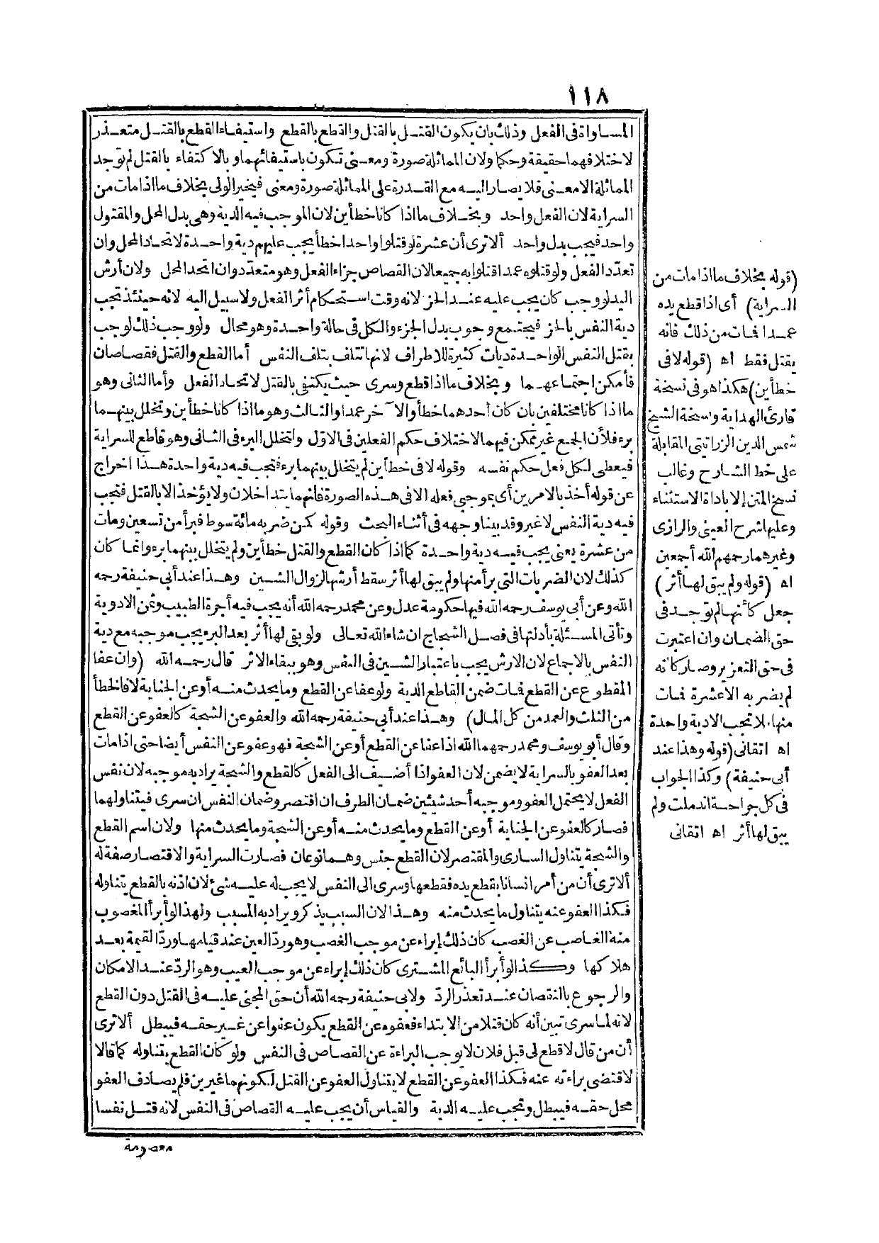 الْمُسَاوَاةَ فِي الْفِعْلِ وَذَلِكَ بِأَنْ يَكُونَ الْقَتْلُ بِالْقَتْلِ وَالْقَطْعُ بِالْقَطْعِ وَاسْتِيفَاءُ الْقَطْعِ بِالْقَتْلِ مُتَعَذِّرٌ لِاخْتِلَافِهِمَا حَقِيقَةً وَحُكْمًا؛ وَلِأَنَّ الْمُمَاثَلَةَ صُورَةً وَمَعْنًى تَكُونُ بِاسْتِيفَائِهِمَا وَبِالِاكْتِفَاءِ بِالْقَتْلِ لَمْ تُوجَدْ الْمُمَاثَلَةُ إلَّا مَعْنًى فَلَا يُصَارُ إلَيْهِ مَعَ الْقُدْرَةِ عَلَى الْمُمَاثَلَةِ صُورَةً وَمَعْنًى فَيُخَيَّرُ الْوَلِيُّ بِخِلَافِ مَا إذَا مَاتَ مِنْ السِّرَايَةِ؛ لِأَنَّ الْفِعْلَ وَاحِدٌ وَبِخِلَافِ مَا إذَا كَانَا خَطَأَيْنِ؛ لِأَنَّ الْمُوجِبَ فِيهِ الدِّيَةُ وَهِيَ بَدَلُ الْمَحَلِّ وَالْمَقْتُولُ وَاحِدٌ فَيَجِبُ بَدَلٌ وَاحِدٌ أَلَا تَرَى أَنَّ عَشَرَةً لَوْ قَتَلُوا وَاحِدًا خَطَأً يَجِبُ عَلَيْهِمْ دِيَةٌ وَاحِدَةٌ لِاتِّحَادِ الْمَحَلِّ وَإِنْ تَعَدَّدَ الْفِعْلُ، وَلَوْ قَتَلُوهُ عَمْدًا قُتِلُوا بِهِ جَمِيعًا؛ لِأَنَّ الْقِصَاصَ جَزَاءُ الْفِعْلِ وَهُوَ مُتَعَدِّدٌ وَإِنْ اتَّحَدَ الْمَحَلُّ؛ وَلِأَنَّ أَرْشَ الْيَدِ لَوْ وَجَبَ كَانَ يَجِبُ عَلَيْهِ عِنْدَ الْحَزِّ؛ لِأَنَّهُ وَقْتُ اسْتِحْكَامِ أَثَرِ الْفِعْلِ وَلَا سَبِيلَ إلَيْهِ؛ لِأَنَّهُ حِينَئِذٍ تَجِبُ دِيَةُ النَّفْسِ بِالْحَزِّ فَيَجْتَمِعُ وُجُوبُ بَدَلِ الْجُزْءِ وَالْكُلِّ فِي حَالَةٍ وَاحِدَةٍ وَهُوَ مُحَالٌ، وَلَوْ وَجَبَ ذَلِكَ لَوَجَبَ بِقَتْلِ النَّفْسِ الْوَاحِدَةِ دِيَاتٌ كَثِيرَةٌ لِلْأَطْرَافِ؛ لِأَنَّهَا تَتْلَفُ بِتَلَفِ النَّفْسِ، أَمَّا الْقَطْعُ وَالْقَتْلُ فَقِصَاصَانِ فَأَمْكَنَ اجْتِمَاعُهُمَا وَبِخِلَافِ مَا إذَا قُطِعَ وَسَرَى حَيْثُ يُكْتَفَى بِالْقَتْلِ لِاتِّحَادِ الْفِعْلِ، وَأَمَّا الثَّانِي وَهُوَ مَا إذَا كَانَا مُخْتَلِفَيْنِ بِأَنْ كَانَ أَحَدُهُمَا خَطَأً وَالْآخَرُ عَمْدًا وَالثَّالِثُ وَهُوَ مَا إذَا كَانَا خَطَأَيْنِ وَتَخَلَّلَ بَيْنَهُمَا بُرْءٌ فَلِأَنَّ الْجَمْعَ غَيْرُ مُمْكِنٍ فِيهِمَا لِاخْتِلَافِ حُكْمِ الْفِعْلَيْنِ فِي الْأَوَّلِ وَلِتَخَلُّلِ الْبُرْءِ فِي الثَّانِي وَهُوَ قَاطِعٌ لِلسِّرَايَةِ فَيُعْطَى لِكُلِّ فِعْلٍ حُكْمُ نَفْسِهِ، وَقَوْلُهُ لَا فِي خَطَأَيْنِ لَمْ يَتَخَلَّلْ بَيْنَهُمَا بُرْءٌ فَتَجِبُ فِيهِ دِيَةٌ وَاحِدَةٌ هَذَا إخْرَاجٌ عَنْ قَوْلِهِ أُخِذَ بِالْأَمْرَيْنِ أَيْ بِمُوجِبَيْ فِعْلِهِ إلَّا فِي هَذِهِ الصُّورَةِ فَإِنَّهُمَا يَتَدَاخَلَانِ وَلَا يُؤْخَذُ إلَّا بِالْقَتْلِ فَتَجِبُ فِيهِ دِيَةُ النَّفْسِ لَا غَيْرُ، وَقَدْ بَيَّنَّا وَجْهَهُ فِي أَثْنَاءِ الْبَحْثِ، وَقَوْلُهُ كَمَنْ ضَرَبَهُ مِائَةَ سَوْطٍ فَبَرَأَ مِنْ تِسْعِينَ وَمَاتَ مِنْ عَشَرَةٍ يَعْنِي يَجِبُ فِيهِ دِيَةٌ وَاحِدَةٌ كَمَا إذَا كَانَ الْقَطْعُ وَالْقَتْلُ خَطَأَيْنِ وَلَمْ يَتَخَلَّلْ بَيْنَهُمَا بُرْءٌ وَإِنَّمَا كَانَ كَذَلِكَ؛ لِأَنَّ الضَّرَبَاتِ الَّتِي بَرَأَ مِنْهَا وَلَمْ يَبْقَ لَهَا أَثَرٌ سَقَطَ أَرْشُهَا لِزَوَالِ الشَّيْنِ، وَهَذَا عِنْدَ أَبِي حَنِيفَةَ - رَحِمَهُ اللَّهُ -، وَعَنْ أَبِي يُوسُفَ - رَحِمَهُ اللَّهُ - فِيهَا حُكُومَةُ عَدْلٍ، وَعَنْ مُحَمَّدٍ - رَحِمَهُ اللَّهُ - أَنَّهُ يَجِبُ فِيهِ أُجْرَةُ الطَّبِيبِ وَثَمَنُ الْأَدْوِيَةِ وَتَأْتِي الْمَسْأَلَةُ بِأَدِلَّتِهَا فِي فَصْلِ الشِّجَاجِ إنْ شَاءَ اللَّهُ تَعَالَى، وَلَوْ بَقِيَ لَهَا أَثَرٌ بَعْدَ الْبُرْءِ يَجِبُ مُوجِبُهُ مَعَ دِيَةِ النَّفْسِ بِالْإِجْمَاعِ؛ لِأَنَّ الْأَرْشَ يَجِبُ بِاعْتِبَارِ الشَّيْنِ فِي النَّفْسِ وَهُوَ بِبَقَاءِ الْأَثَرِ