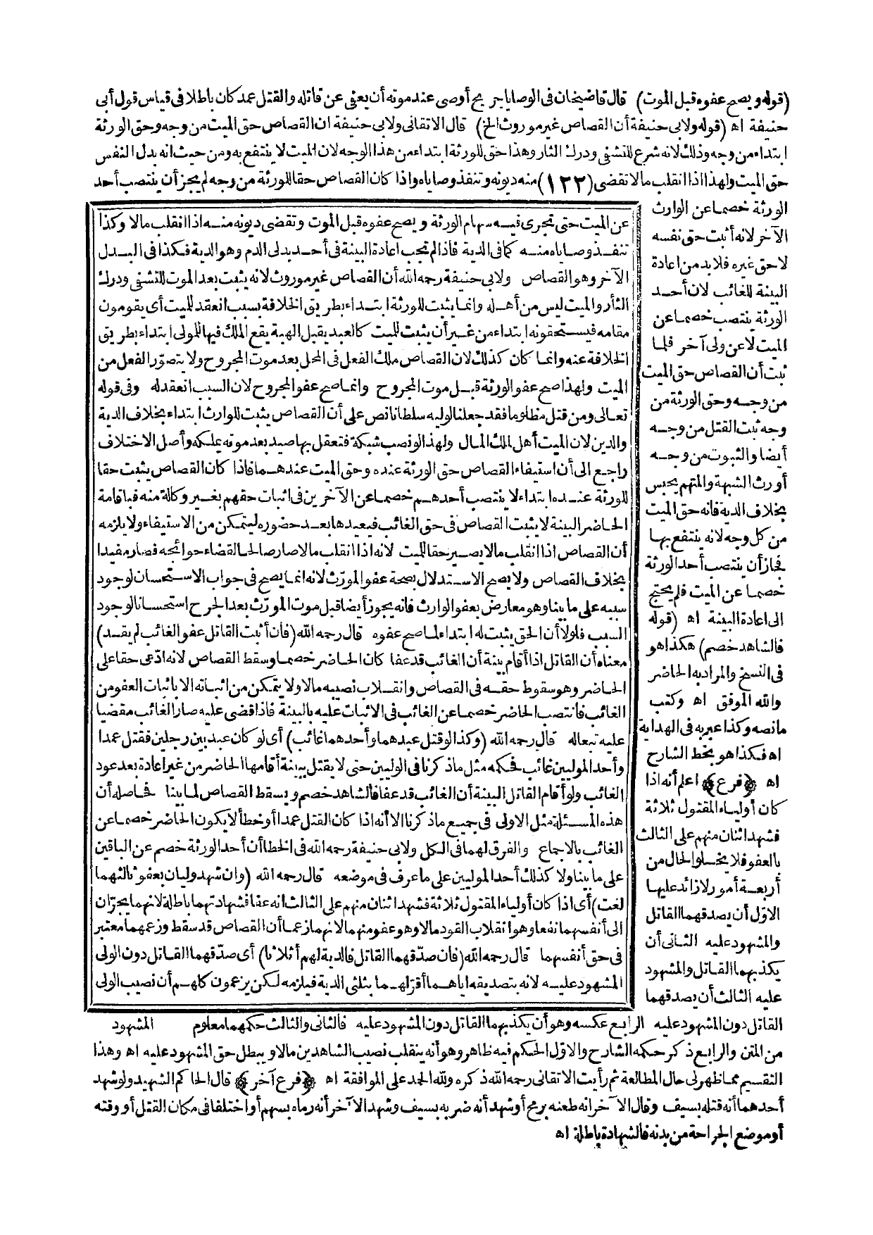 (فَرْعٌ). اعْلَمْ أَنَّهُ إذَا كَانَ أَوْلِيَاءُ الْمَقْتُولِ ثَلَاثَةً فَشَهِدَ اثْنَانِ مِنْهُمْ عَلَى الثَّالِثِ بِالْعَفْوِ فَلَا يَخْلُو الْحَالُ مِنْ أَرْبَعَةِ أُمُورٍ لَا زَائِدَ عَلَيْهَا الْأَوَّلُ أَنْ يُصَدِّقَهُمَا الْقَاتِلُ وَالْمَشْهُودُ عَلَيْهِ، الثَّانِي أَنْ يُكَذِّبَهُمَا الْقَاتِلُ وَالْمَشْهُودُ عَلَيْهِ، الثَّالِثُ أَنْ يُصَدِّقَهُمَا الْقَاتِلُ دُونَ الْمَشْهُودِ عَلَيْهِ، الرَّابِعُ عَكْسُهُ وَهُوَ أَنْ يُكَذِّبَهُمَا الْقَاتِلُ دُونَ الْمَشْهُودِ عَلَيْهِ، فَالثَّانِي وَالثَّالِثُ حُكْمُهُمَا مَعْلُومٌ مِنْ الْمَتْنِ وَالرَّابِعُ ذَكَرَ حُكْمَهُ الشَّارِحُ وَالْأَوَّلُ الْحُكْمُ فِيهِ ظَاهِرٌ وَهُوَ أَنَّهُ يَنْقَلِبُ نَصِيبُ الشَّاهِدَيْنِ مَالًا وَيَبْطُلُ حَقُّ الْمَشْهُودِ عَلَيْهِ اهـ. وَهَذَا التَّقْسِيمُ مِمَّا ظَهَرَ لِي حَالَ الْمُطَالَعَةِ، ثُمَّ رَأَيْت الْأَتْقَانِيَّ - رَحِمَهُ اللَّهُ - ذَكَرَهُ وَلِلَّهِ الْحَمْدُ عَلَى الْمُوَافَقَةِ اهـ. (فَرْعٌ آخَرُ). قَالَ الْحَاكِمُ الشَّهِيدُ وَلَوْ شَهِدَ أَحَدُهُمَا أَنَّهُ قَتَلَهُ بِسَيْفٍ، وَقَالَ الْآخَرُ إنَّهُ طَعَنَهُ بِرُمْحٍ أَوْ شَهِدَ أَنَّهُ ضَرَبَهُ بِسَيْفٍ وَشَهِدَ الْآخَرُ أَنَّهُ رَمَاهُ بِسَهْمٍ أَوْ اخْتَلَفَا فِي مَكَانِ الْقَتْلِ أَوْ وَقْتِهِ أَوْ مَوْضِعِ الْجِرَاحَةِ مِنْ بَدَنِهِ فَالشَّهَادَةُ بَاطِلَةٌ اهـ