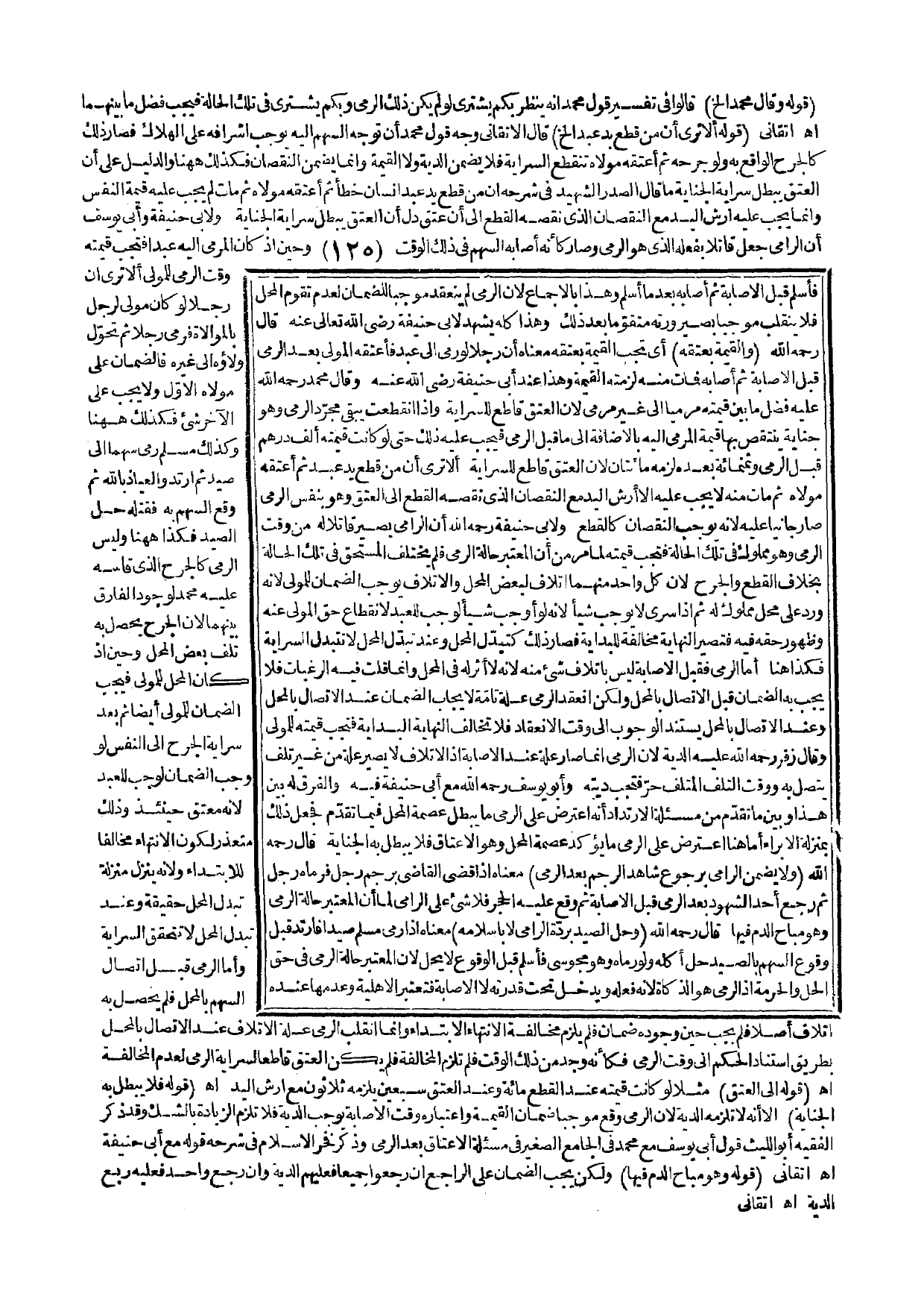 ـــــــــــــــــــــــــــــQقَوْلُهُ: وَقَالَ مُحَمَّدٌ إلَخْ) قَالُوا فِي تَفْسِيرِ قَوْلِ مُحَمَّدٍ إنَّهُ يُنْظَرُ بِكَمْ يُشْتَرَى لَوْ لَمْ يَكُنْ ذَلِكَ الرَّمْيُ وَبِكَمْ يُشْتَرَى فِي تِلْكَ الْحَالَةِ فَيَجِبُ فَضْلُ مَا بَيْنَهُمَا. اهـ. أَتْقَانِيٌّ (قَوْلُهُ: أَلَا تَرَى أَنَّ مَنْ قَطَعَ يَدَ عَبْدٍ إلَخْ) قَالَ الْأَتْقَانِيُّ وَجْهُ قَوْلِ مُحَمَّدٍ أَنَّ تَوَجُّهَ السَّهْمِ إلَيْهِ يُوجِبُ إشْرَافَهُ عَلَى الْهَلَاكِ فَصَارَ ذَلِكَ كَالْجَرْحِ الْوَاقِعِ بِهِ، وَلَوْ جَرَحَهُ، ثُمَّ أَعْتَقَهُ مَوْلَاهُ تَنْقَطِعُ السِّرَايَةُ فَلَا يَضْمَنُ الدِّيَةَ وَلَا الْقِيمَةَ وَإِنَّمَا يَضْمَنُ النُّقْصَانَ فَكَذَلِكَ هَاهُنَا وَالدَّلِيلُ عَلَى أَنَّ الْعِتْقَ يُبْطِلُ سِرَايَةَ الْجِنَايَةِ مَا قَالَ الصَّدْرُ الشَّهِيدُ فِي شَرْحِهِ إنَّ مَنْ قَطَعَ يَدَ عَبْدِ إنْسَانٍ خَطَأً، ثُمَّ أَعْتَقَهُ مَوْلَاهُ، ثُمَّ مَاتَ لَمْ يَجِبْ عَلَيْهِ قِيمَةُ النَّفْسِ وَإِنَّمَا يَجِبُ عَلَيْهِ أَرْشُ الْيَدِ مَعَ النُّقْصَانِ الَّذِي نَقَصَهُ الْقَطْعُ إلَى أَنْ عَتَقَ دَلَّ أَنَّ الْعِتْقَ يُبْطِلُ سِرَايَةَ الْجِنَايَةِ وَلِأَبِي حَنِيفَةَ وَأَبِي يُوسُفَ أَنَّ الرَّامِيَ جُعِلَ قَاتِلًا بِفِعْلِهِ الَّذِي هُوَ الرَّمْيُ.