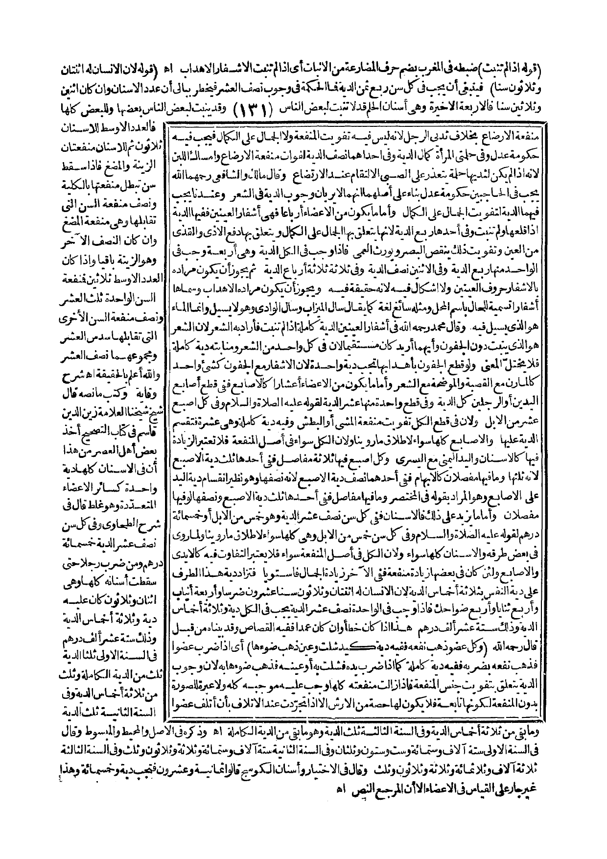 وَاَللَّهُ أَعْلَمُ بِالْحَقِيقَةِ اهـ. شَرْحُ وِقَايَةٍ وَكَتَبَ مَا نَصُّهُ قَالَ شَيْخُ شَيْخِنَا الْعَلَّامَةُ زَيْنُ الدِّينِ قَاسِمٌ فِي كِتَابِ التَّصْحِيحِ أَخَذَ بَعْضُ أَهْلِ الْعَصْرِ مِنْ هَذَا أَنَّ فِي الْأَسْنَانِ كُلِّهَا دِيَةً وَاحِدَةً كَسَائِرِ الْأَعْضَاءِ الْمُتَعَدِّدَةِ وَهُوَ غَلَطٌ قَالَ فِي شَرْحِ الطَّحَاوِيِّ وَفِي كُلِّ سِنٍّ نِصْفُ عُشْرِ الدِّيَةِ خَمْسُمِائَةِ دِرْهَمٍ، وَمَنْ ضَرَبَ رَجُلًا حَتَّى سَقَطَتْ أَسْنَانُهُ كُلُّهَا وَهِيَ اثْنَانِ وَثَلَاثُونَ كَانَ عَلَيْهِ دِيَةٌ وَثَلَاثَةُ أَخْمَاسِ الدِّيَةِ وَذَلِكَ سِتَّةَ عَشَرَ أَلْفَ دِرْهَمٍ فِي السَّنَةِ الْأُولَى ثُلُثَا الدِّيَةِ ثُلُثٌ مِنْ الدِّيَةِ الْكَامِلَةِ وَثُلُثٌ مِنْ ثَلَاثَةِ أَخْمَاسِ الدِّيَةِ وَفِي السَّنَةِ الثَّانِيَةِ ثُلُثُ الدِّيَةِ وَمَا بَقِيَ مِنْ ثَلَاثَةِ أَخْمَاسِ الدِّيَةِ وَفِي السَّنَةِ الثَّالِثَةِ ثُلُثُ الدِّيَةِ وَهُوَ مَا بَقِيَ مِنْ الدِّيَةِ الْكَامِلَةِ اهـ، وَذَكَرَهُ فِي الْأَصْلِ وَالْمُحِيطِ وَالْمَبْسُوطِ، وَقَالَ فِي السَّنَةِ الْأُولَى سِتَّةُ آلَافٍ وَسِتُّمِائَةٍ وَسِتَّةٌ وَسِتُّونَ وَثُلُثَانِ وَفِي السَّنَةِ الثَّانِيَةِ سِتَّةُ آلَافٍ وَسِتُّمِائَةٍ وَثَلَاثَةٌ وَثَلَاثُونَ وَثُلُثٌ وَفِي السَّنَةِ الثَّالِثَةِ ثَلَاثَةُ آلَافٍ وَثَلَاثُمِائَةٍ وَثَلَاثَةٌ وَثَلَاثُونَ وَثُلُثٌ وَقَالَ فِي الِاخْتِيَارِ وَأَسْنَانُ الْكَوْسَجِ قَالُوا ثَمَانِيَةٌ وَعِشْرُونَ فَتَجِبُ دِيَةٌ وَخَمْسُمِائَةٍ، وَهَذَا غَيْرُ جَارٍ عَلَى الْقِيَاسِ فِي الْأَعْضَاءِ إلَّا أَنَّ الْمَرْجِعَ النَّصُّ. اهـ.