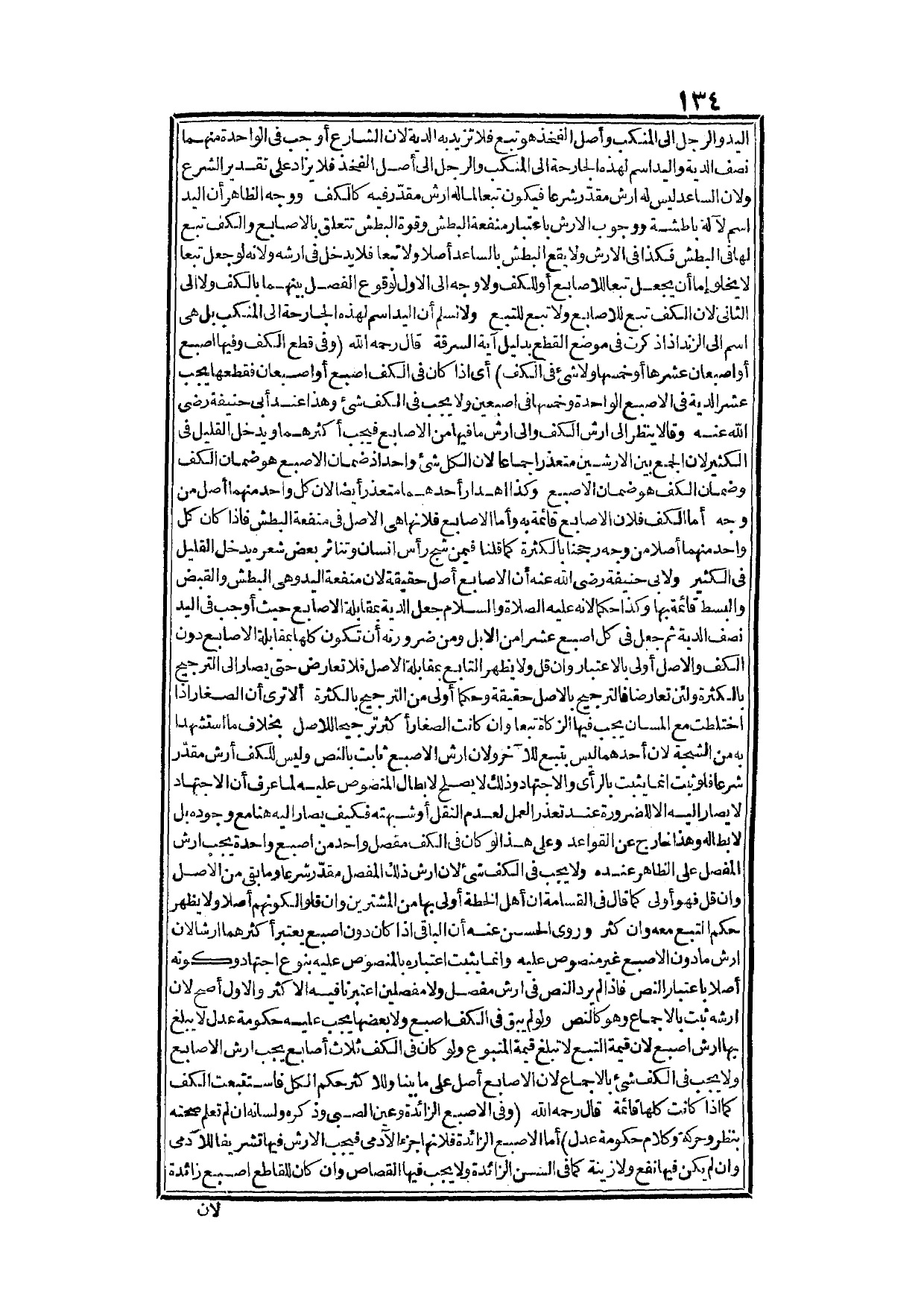 . قَالَ - رَحِمَهُ اللَّهُ - (وَفِي قَطْعِ الْكَفِّ وَفِيهَا أُصْبُعٌ أَوْ أُصْبُعَانِ عُشْرُهَا أَوْ خُمْسُهَا وَلَا شَيْءَ فِي الْكَفِّ) أَيْ إذَا كَانَ فِي الْكَفِّ أُصْبُعٌ أَوْ أُصْبُعَانِ فَقَطَعَهَا يَجِبُ عُشْرُ الدِّيَةِ فِي الْأُصْبُعِ الْوَاحِدَةِ وَخُمْسُهَا فِي أُصْبُعَيْنِ وَلَا يَجِبُ فِي الْكَفِّ شَيْءٌ، وَهَذَا عِنْدَ أَبِي حَنِيفَةَ - رَضِيَ اللَّهُ عَنْهُ -، وَقَالَا يُنْظَرُ إلَى أَرْشِ الْكَفِّ وَإِلَى أَرْشِ مَا فِيهَا مِنْ الْأَصَابِعِ فَيَجِبُ أَكْثَرُهُمَا وَيَدْخُلُ الْقَلِيلُ فِي الْكَثِيرِ؛ لِأَنَّ الْجَمْعَ بَيْنَ الْأَرْشَيْنِ مُتَعَذِّرٌ إجْمَاعًا؛ لِأَنَّ الْكُلَّ شَيْءٌ وَاحِدٌ إذْ ضَمَانُ الْأُصْبُعِ هُوَ ضَمَانُ الْكَفِّ وَضَمَانُ الْكَفِّ هُوَ ضَمَانُ الْأُصْبُعِ، وَكَذَا إهْدَارُ أَحَدِهِمَا مُتَعَذِّرٌ أَيْضًا؛ لِأَنَّ كُلَّ وَاحِدٍ مِنْهُمَا أَصْلٌ مِنْ وَجْهٍ، أَمَّا الْكَفُّ فَلِأَنَّ الْأَصَابِعَ قَائِمَةٌ بِهِ، وَأَمَّا الْأَصَابِعُ فَلِأَنَّهَا هِيَ الْأَصْلُ فِي مَنْفَعَةِ الْبَطْشِ، فَإِذَا كَانَ كُلُّ وَاحِدٍ مِنْهُمَا أَصْلًا مِنْ وَجْهٍ رَجَّحْنَا بِالْكَثْرَةِ كَمَا قُلْنَا فِيمَنْ شَجَّ رَأْسَ إنْسَانٍ وَتَنَاثَرَ بَعْضُ شَعْرِهِ يَدْخُلُ الْقَلِيلُ فِي الْكَثِيرِ وَلِأَبِي حَنِيفَةَ - رَضِيَ اللَّهُ عَنْهُ - أَنَّ الْأَصَابِعَ أَصْلٌ حَقِيقَةً؛ لِأَنَّ مَنْفَعَةَ الْيَدِ وَهِيَ الْبَطْشُ وَالْقَبْضُ وَالْبَسْطُ قَائِمَةٌ بِهَا، وَكَذَا حُكْمًا؛ لِأَنَّهُ - رَضِيَ اللَّهُ عَنْهُ - جَعَلَ الدِّيَةَ بِمُقَابَلَةِ الْأَصَابِعِ حَيْثُ أَوْجَبَ فِي الْيَدِ نِصْفَ الدِّيَةِ، ثُمَّ جَعَلَ فِي كُلِّ أُصْبُعٍ عَشْرًا مِنْ الْإِبِلِ وَمِنْ ضَرُورَتُهُ أَنْ تَكُونَ كُلُّهَا بِمُقَابَلَةِ الْأَصَابِعِ دُونَ الْكَفِّ وَالْأَصْلُ أَوْلَى بِالِاعْتِبَارِ وَإِنْ قَلَّ وَلَا يَظْهَرُ التَّابِعُ بِمُقَابَلَةِ الْأَصْلِ فَلَا يَتَعَارَضُ حَتَّى يُصَارَ إلَى التَّرْجِيحِ بِالْكَثْرَةِ وَلَئِنْ تَعَارَضَا فَالتَّرْجِيحُ بِالْأَصْلِ حَقِيقَةً وَحُكْمًا أَوْلَى مِنْ التَّرْجِيحِ بِالْكَثْرَةِ أَلَا تَرَى أَنَّ الصِّغَارَ إذَا اخْتَلَطَتْ مَعَ الْمَسَانِّ يَجِبُ فِيهَا الزَّكَاةُ تَبَعًا وَإِنْ كَانَتْ الصِّغَارُ أَكْثَرَ تَرْجِيحًا لِلْأَصْلِ بِخِلَافِ مَا اسْتَشْهَدَا بِهِ مِنْ الشَّجَّةِ؛ لِأَنَّ أَحَدَهُمَا لَيْسَ بِتَبَعٍ لِلْآخَرِ؛ وَلِأَنَّ أَرْشَ الْأُصْبُعِ ثَابِتٌ بِالنَّصِّ، وَلَيْسَ لِلْكَفِّ أَرْشٌ مُقَدَّرٌ شَرْعًا فَلَوْ ثَبَتَ إنَّمَا يَثْبُتُ بِالرَّأْيِ وَالِاجْتِهَادِ وَذَلِكَ لَا يَصْلُحُ لِإِبْطَالِ الْمَنْصُوصِ عَلَيْهِ لِمَا عُرِفَ أَنَّ الِاجْتِهَادَ لَا يُصَارُ إلَيْهِ إلَّا لِلضَّرُورَةِ عِنْدَ تَعَذُّرِ الْعَمَلِ لِعَدَمِ النَّقْلِ أَوْ شُبْهَتِهِ فَكَيْفَ يُصَارُ إلَيْهِ هُنَا مَعَ وُجُودِهِ، بَلْ لِإِبْطَالِهِ، وَهَذَا خَارِجٌ عَنْ الْقَوَاعِدِ وَعَلَى هَذَا لَوْ كَانَ فِي الْكَفِّ مِفْصَلٌ وَاحِدٌ مِنْ أُصْبُعٍ وَاحِدَةٍ يَجِبُ أَرْشُ الْمِفْصَلِ عَلَى الظَّاهِرِ عِنْدَهُ وَلَا يَجِبُ فِي الْكَفِّ شَيْءٌ؛ لِأَنَّ أَرْشَ ذَلِكَ الْمِفْصَلِ مُقَدَّرٌ شَرْعًا وَمَا بَقِيَ مِنْ الْأَصْلِ وَإِنْ قَلَّ فَهُوَ أَوْلَى كَمَا قَالَ فِي الْقَسَامَةِ إنَّ أَهْلَ الْخُطَّةِ أَوْلَى بِهَا مِنْ الْمُشْتَرِي وَإِنْ قَلُّوا لِكَوْنِهَا أَصْلًا وَلَا يَظْهَرُ حُكْمُ التَّبَعِ مَعَهُ وَإِنْ كَثُرَ وَرَوَى الْحَسَنُ عَنْهُ أَنَّ الْبَاقِيَ إذَا كَانَ دُونَ أُصْبُعٍ يُعْتَبَرُ أَكْثَرُهُمَا أَرْشًا؛ لِأَنَّ أَرْشَ مَا دُونَ الْأُصْبُعِ غَيْرُ مَنْصُوصٍ عَلَيْهِ وَإِنَّمَا يَثْبُتُ اعْتِبَارُهُ بِالْمَن