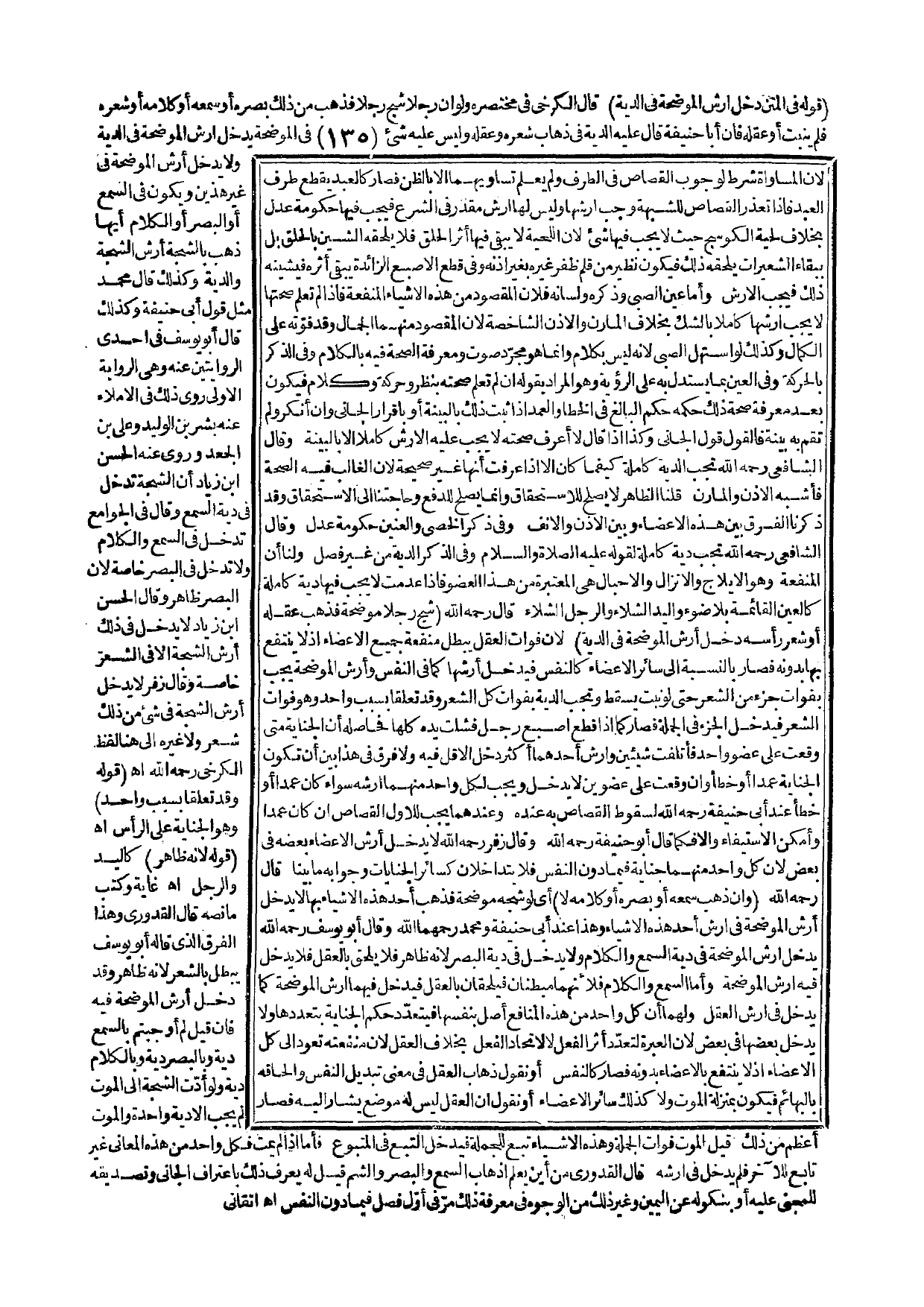 ـــــــــــــــــــــــــــــQقَوْلُهُ فِي الْمَتْنِ: دَخَلَ أَرْشُ الْمُوضِحَةِ فِي الدِّيَةِ) قَالَ الْكَرْخِيُّ فِي مُخْتَصَرِهِ: وَلَوْ أَنَّ رَجُلًا شَجَّ رَجُلًا فَذَهَبَ مِنْ ذَلِكَ بَصَرُهُ أَوْ سَمْعُهُ أَوْ كَلَامُهُ أَوْ شَعْرُهُ فَلَمْ يَنْبُتْ أَوْ عَقْلُهُ فَإِنَّ أَبَا حَنِيفَةَ قَالَ عَلَيْهِ الدِّيَةُ فِي ذَهَابِ شَعْرِهِ وَعَقْلِهِ، وَلَيْسَ عَلَيْهِ شَيْءٌ فِي الْمُوضِحَةِ يَدْخُلُ أَرْشُ الْمُوضِحَةِ فِي الدِّيَةِ وَلَا يَدْخُلُ أَرْشُ الْمُوضِحَةِ فِي غَيْرِ هَذَيْنِ وَيَكُونُ فِي السَّمْعِ أَوْ الْبَصَرِ أَوْ الْكَلَامِ أَيُّهَا ذَهَبَ بِالشَّجَّةِ أَرْشُ الشَّجَّةِ وَالدِّيَةُ، وَكَذَلِكَ قَالَ مُحَمَّدٌ مِثْلَ قَوْلِ أَبِي حَنِيفَةَ، وَكَذَلِكَ قَالَ أَبُو يُوسُفَ فِي إحْدَى الرِّوَايَتَيْنِ عَنْهُ وَهِيَ الرِّوَايَةُ الْأُولَى رَوَى ذَلِكَ فِي الْإِمْلَاءِ عَنْهُ بِشْرُ بْنُ الْوَلِيدِ وَعَلِيُّ بْنُ الْجَعْدِ وَرَوَى عَنْهُ الْحَسَنُ بْنُ زِيَادٍ أَنَّ الشَّجَّةَ تَدْخُلُ فِي دِيَةِ السَّمْعِ، وَقَالَ فِي الْجَوَامِعِ تَدْخُلُ فِي السَّمْعِ وَالْكَلَامِ وَلَا تَدْخُلُ فِي الْبَصَرِ خَاصَّةً؛ لِأَنَّ الْبَصَرَ ظَاهِرٌ، وَقَالَ الْحَسَنُ بْنُ زِيَادٍ لَا يَدْخُلُ فِي ذَلِكَ أَرْشُ الشَّجَّةِ إلَّا فِي الشَّعْرِ خَاصَّةً، وَقَالَ زُفَرُ لَا يَدْخُلُ أَرْشُ الشَّجَّةِ فِي شَيْءٍ مِنْ ذَلِكَ شَعْرٍ وَلَا غَيْرِهِ إلَى هُنَا لَفْظُ الْكَرْخِيِّ - رَحِمَهُ اللَّهُ -. اهـ. (قَوْلُهُ: وَقَدْ تَعَلَّقَا بِسَبَبٍ وَاحِدٍ) وَهُوَ الْجِنَايَةُ عَلَى الرَّأْسِ. اهـ. .