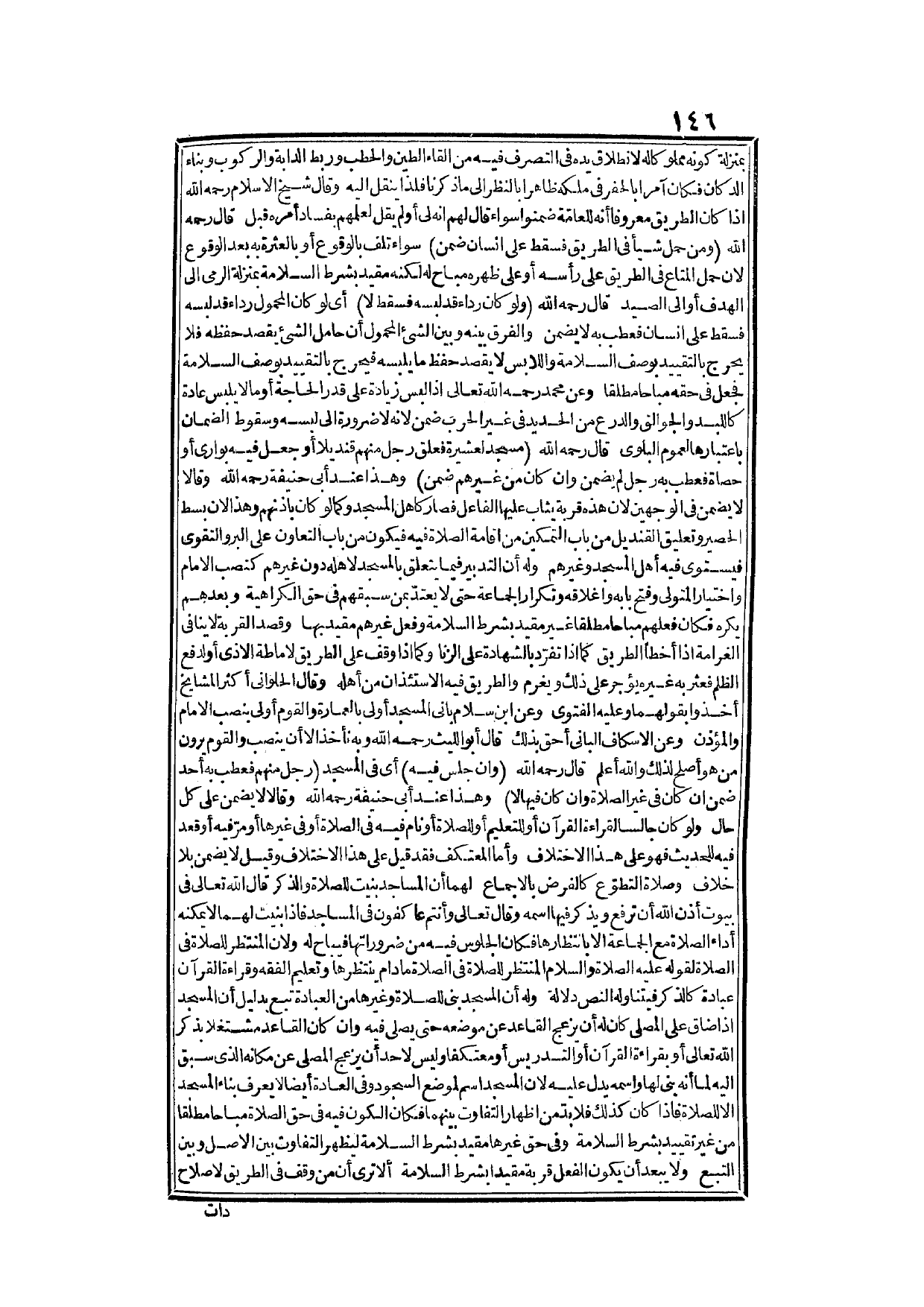 . قَالَ - رَحِمَهُ اللَّهُ - (مَسْجِدٌ لِعَشِيرَةٍ فَعَلَّقَ رَجُلٌ مِنْهُمْ قِنْدِيلًا أَوْ جَعَلَ فِيهِ بَوَارِي أَوْ حَصَاةً فَعَطِبَ بِهِ رَجُلٌ لَمْ يَضْمَنْ وَإِنْ كَانَ مِنْ غَيْرِهِمْ ضَمِنَ)، وَهَذَا عِنْدَ أَبِي حَنِيفَةَ - رَحِمَهُ اللَّهُ -، وَقَالَا لَا يَضْمَنُ فِي الْوَجْهَيْنِ؛ لِأَنَّ هَذِهِ قُرْبَةٌ يُثَابُ عَلَيْهَا الْفَاعِلُ فَصَارَ كَأَهْلِ الْمَسْجِدِ وَكَمَا لَوْ كَانَ بِإِذْنِهِمْ وَهَذَا لِأَنَّ بَسْطَ الْحَصِيرِ وَتَعْلِيقَ الْقِنْدِيلِ مِنْ بَابِ التَّمْكِينِ مِنْ إقَامَةِ الصَّلَاةِ فِيهِ، فَيَكُونُ مِنْ بَابِ التَّعَاوُنِ عَلَى الْبِرِّ وَالتَّقْوَى فَيَسْتَوِي فِيهِ أَهْلُ الْمَسْجِدِ وَغَيْرُهُمْ وَلَهُ أَنَّ التَّدْبِيرَ فِيمَا يَتَعَلَّقُ بِالْمَسْجِدِ لِأَهْلِهِ دُونَ غَيْرِهِمْ كَنَصْبِ الْإِمَامِ وَاخْتِيَارِ الْمُتَوَلِّي وَفَتْحِ بَابِهِ وَإِغْلَاقِهِ وَتَكْرَارِ الْجَمَاعَةِ حَتَّى لَا يُعْتَدَّ بِمَنْ سَبَقَهُمْ فِي حَقِّ الْكَرَاهِيَةِ وَبَعْدَهُمْ يُكْرَهُ فَكَانَ فِعْلُهُمْ مُبَاحًا مُطْلَقًا غَيْرَ مُقَيَّدٍ بِشَرْطِ السَّلَامَةِ وَفِعْلُ غَيْرِهِمْ مُقَيَّدٌ بِهَا وَقَصْدُ الْقُرْبَةِ لَا يُنَافِي الْغَرَامَةَ إذَا أَخْطَأَ الطَّرِيقَ كَمَا إذَا تَفَرَّدَ بِالشَّهَادَةِ عَلَى الزِّنَا وَكَمَا إذَا وَقَفَ عَلَى الطَّرِيقِ لِإِمَاطَةِ الْأَذَى أَوْ لِدَفْعِ الظُّلْمِ فَعَثَرَ بِهِ غَيْرُهُ يُؤْجَرُ عَلَى ذَلِكَ وَيَغْرَمُ وَالطَّرِيقُ فِيهِ الِاسْتِئْذَانُ مِنْ أَهْلِهِ، وَقَالَ الْحَلْوَانِيُّ أَكْثَرُ الْمَشَايِخِ أَخَذُوا بِقَوْلِهِمَا وَعَلَيْهِ الْفَتْوَى، وَعَنْ ابْنِ سَلَّامٍ بَانِي الْمَسْجِدِ أَوْلَى بِالْعِمَارَةِ وَالْقَوْمُ أَوْلَى بِنَصْبِ الْإِمَامِ وَالْمُؤَذِّنِ، وَعَنْ الْإِسْكَافِ الْبَانِي أَحَقُّ بِذَلِكَ. قَالَ أَبُو اللَّيْثِ - رَحِمَهُ اللَّهُ - وَبِهِ نَأْخُذُ إلَّا أَنْ يُنَصِّبَ وَالْقَوْمُ يَرَوْنَ مَنْ هُوَ أَصْلَحُ لِذَلِكَ وَاَللَّهُ أَعْلَمُ