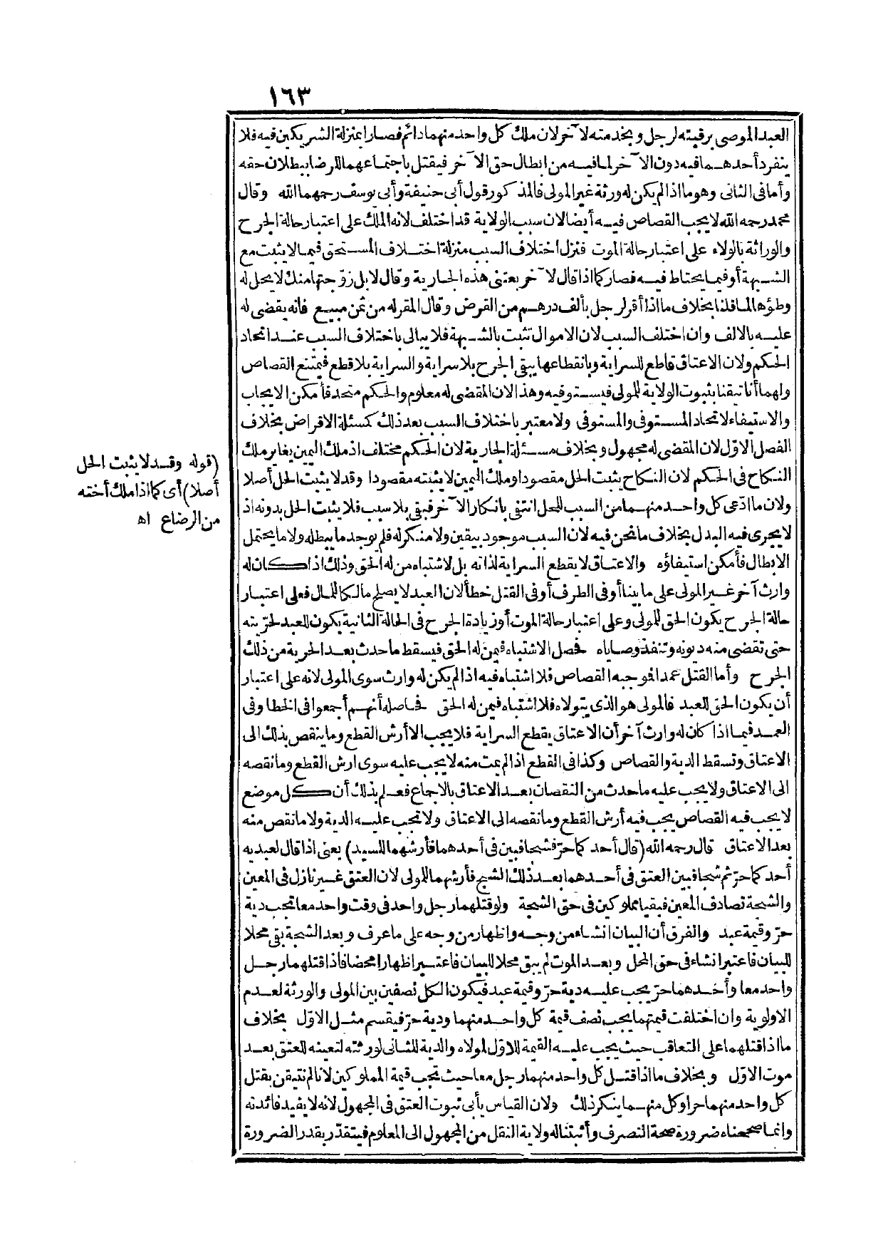 الْعَبْدِ الْمُوصَى بِرَقَبَتِهِ لِرَجُلٍ وَبِخِدْمَتِهِ لِآخَرَ؛ لِأَنَّ مِلْكَ كُلِّ وَاحِدٍ مِنْهُمَا دَائِمٌ فَصَارَا بِمَنْزِلَةِ الشَّرِيكَيْنِ فِيهِ فَلَا يَنْفَرِدُ أَحَدُهُمَا فِيهِ دُونَ الْآخَرِ لِمَا فِيهِ مِنْ إبْطَالِ حَقِّ الْآخَرِ فَيُقْتَلُ بِاجْتِمَاعِهِمَا لِلرِّضَا بِبُطْلَانِ حَقِّهِ، وَأَمَّا فِي الثَّانِي وَهُوَ مَا إذَا لَمْ يَكُنْ لَهُ وَرَثَةٌ غَيْرُ الْمَوْلَى فَالْمَذْكُورُ قَوْلُ أَبِي حَنِيفَةَ وَأَبِي يُوسُفَ رَحِمَهُمَا اللَّهُ، وَقَالَ مُحَمَّدٌ - رَحِمَهُ اللَّهُ - لَا يَجِبُ الْقِصَاصُ فِيهِ أَيْضًا؛ لِأَنَّ سَبَبَ الْوِلَايَةِ قَدْ اخْتَلَفَ؛ لِأَنَّهُ الْمِلْكُ عَلَى اعْتِبَارِ حَالَةِ الْجَرْحِ وَالْوِرَاثَةُ بِالْوَلَاءِ عَلَى اعْتِبَارِ حَالَةِ الْمَوْتِ فَنُزِّلَ اخْتِلَافُ السَّبَبِ مَنْزِلَةَ اخْتِلَافِ الْمُسْتَحِقِّ فِيمَا لَا يَثْبُتُ مَعَ الشُّبْهَةِ أَوْ فِيمَا يُحْتَاطُ فِيهِ فَصَارَ كَمَا إذَا قَالَ لِآخَرَ بِعْتنِي هَذِهِ الْجَارِيَةَ، وَقَالَ لَا بَلْ زَوَّجْتهَا مِنْك لَا يَحِلُّ لَهُ وَطْؤُهَا لِمَا قُلْنَا بِخِلَافِ مَا إذَا أَقَرَّ لِرَجُلٍ بِأَلْفِ دِرْهَمٍ مِنْ الْقَرْضِ، وَقَالَ الْمُقَرُّ لَهُ مِنْ ثَمَنِ مَبِيعٍ فَإِنَّهُ يُقْضَى لَهُ عَلَيْهِ بِالْأَلْفِ وَإِنْ اخْتَلَفَ السَّبَبُ؛ لِأَنَّ الْأَمْوَالَ تَثْبُتُ بِالشُّبْهَةِ فَلَا يُبَالَى بِاخْتِلَافِ السَّبَبِ عِنْدَ اتِّحَادِ الْحُكْمِ؛ وَلِأَنَّ الْإِعْتَاقَ قَاطِعٌ لِلسِّرَايَةِ وَبِانْقِطَاعِهَا يَبْقَى الْجَرْحُ بِلَا سِرَايَةٍ وَالسِّرَايَةُ بِلَا قَطْعٍ فَيَمْتَنِعُ الْقِصَاصُ وَلَهُمَا أَنَّا تَيَقَّنَّا بِثُبُوتِ الْوِلَايَةِ لِلْمَوْلَى فَيَسْتَوْفِيهِ، وَهَذَا لِأَنَّ الْمُقْضَى لَهُ مَعْلُومٌ وَالْحُكْمُ مُتَّحِدٌ فَأَمْكَنَ الْإِيجَابُ وَالِاسْتِيفَاءُ لِاتِّحَادِ الْمُسْتَوْفِي وَالْمُسْتَوْفَى وَلَا مُعْتَبَرَ بِاخْتِلَافِ السَّبَبِ بَعْدَ ذَلِكَ كَمَسْأَلَةِ الْإِقْرَاضِ بِخِلَافِ الْفَصْلِ الْأَوَّلِ؛ لِأَنَّ الْمُقْضَى لَهُ مَجْهُولٌ وَبِخِلَافِ مَسْأَلَةِ الْجَارِيَةِ؛ لِأَنَّ الْحُكْمَ مُخْتَلِفٌ إذْ مِلْكُ الْيَمِينِ يُغَايِرُ مِلْكَ النِّكَاحِ فِي الْحُكْمِ؛ لِأَنَّ النِّكَاحَ يُثْبِتُ الْحِلَّ مَقْصُودًا وَمِلْكُ الْيَمِينِ لَا يُثْبِتُهُ مَقْصُودًا، وَقَدْ لَا يُثْبِتُ الْحِلَّ أَصْلًا؛ وَلِأَنَّ مَا ادَّعَى كُلُّ وَاحِدٍ مِنْهُمَا مِنْ السَّبَبِ لِلْحِلِّ انْتَفَى بِإِنْكَارِ الْآخَرِ فَبَقِيَ بِلَا سَبَبٍ فَلَا يَثْبُتُ الْحِلُّ بِدُونِهِ إذْ لَا يَجْرِي فِيهِ الْبَدَلُ بِخِلَافِ مَا نَحْنُ فِيهِ؛ لِأَنَّ السَّبَبَ مَوْجُودٌ بِيَقِينٍ وَلَا مُنْكِرَ لَهُ فَلَمْ يُوجَدْ مَا يُبْطِلُهُ وَلَا مَا يَحْتَمِلُ الْإِبْطَالَ فَأَمْكَنَ اسْتِيفَاؤُهُ وَالْإِعْتَاقُ لَا يَقْطَعُ السِّرَايَةَ لِذَاتِهِ، بَلْ لِاشْتِبَاهِ مَنْ لَهُ الْحَقُّ وَذَلِكَ إذَا كَانَ لَهُ وَارِثٌ آخَرُ غَيْرُ الْمَوْلَى عَلَى مَا بَيَّنَّا أَوْ فِي الطَّرَفِ أَوْ فِي الْقَتْلِ خَطَأً؛ لِأَنَّ الْعَبْدَ لَا يَصْلُحُ مَالِكًا لِلْمَالِ فَعَلَى اعْتِبَارِ حَالَةِ الْجَرْحِ يَكُونُ الْحَقُّ لِلْمَوْلَى وَعَلَى اعْتِبَارِ حَالَةِ الْمَوْتِ أَوْ زِيَادَةِ الْجَرْحِ فِي الْحَالَةِ الثَّانِيَةِ يَكُونُ لِلْعَبْدِ لِحُرِّيَّتِهِ حَتَّى تُقْضَى مِنْهُ دُيُونُهُ وَتُنَفَّذَ وَصَايَاهُ فَحَصَلَ الِاشْتِبَاهُ فِيمَنْ لَهُ الْحَقُّ فَيَسْقُطُ مَا حَدَثَ بَعْدَ الْحُرِّيَّةِ مِنْ ذَلِكَ الْجَرْحِ، وَأَمَّا الْقَتْلُ عَمْدًا فَمُوجِبُهُ الْقِصَاصُ فَلَا اشْتِبَاهَ فِيهِ إذَا لَمْ يَكُنْ لَهُ وَارِثٌ سِوَى الْمَوْلَى؛ لِأَنَّهُ عَلَى اعْت
