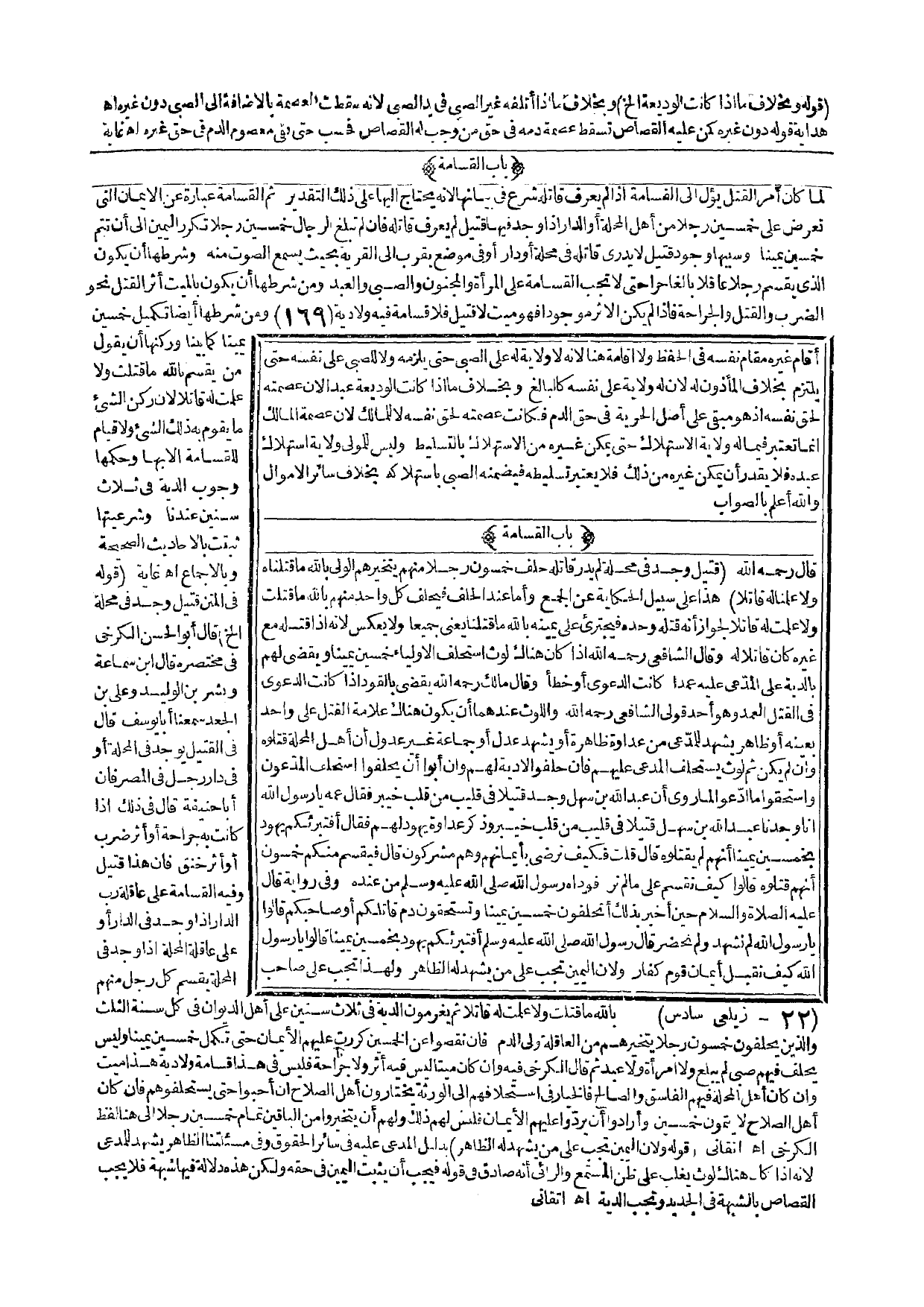 وَحُكْمُهَا وُجُوبُ الدِّيَةِ فِي ثَلَاثِ سِنِينَ عِنْدَنَا وَشَرْعِيَّتُهَا ثَبَتَتْ بِالْأَحَادِيثِ الصَّحِيحَةِ وَبِالْإِجْمَاعِ اهـ غَايَةٌ (قَوْلُهُ فِي الْمَتْنِ قَتِيلٌ وُجِدَ فِي مَحَلَّةٍ إلَخْ) قَالَ أَبُو الْحَسَنِ الْكَرْخِيُّ فِي مُخْتَصَرِهِ قَالَ ابْنُ سِمَاعَةَ وَبِشْرُ بْنُ الْوَلِيدِ وَعَلِيُّ بْنُ الْجَعْدِ سَمِعْنَا أَبَا يُوسُفَ قَالَ فِي الْقَتِيلِ يُوجَدُ فِي الْمَحَلَّةِ أَوْ فِي دَارِ رَجُلٍ فِي الْمِصْرِ فَإِنْ أَبَا حَنِيفَةَ قَالَ فِي ذَلِكَ إذَا كَانَتْ بِهِ جِرَاحَةٌ أَوْ أَثَرُ ضَرْبٍ أَوْ أَثَرُ خَنْقٍ فَإِنَّ هَذَا قَتِيلٌ وَفِيهِ الْقَسَامَةُ عَلَى عَاقِلَةِ رَبِّ الدَّارِ إذَا وُجِدَ فِي الْمَحَلَّةِ يَقْسِمُ كُلُّ رَجُلٍ مِنْهُمْ بِاَللَّهِ مَا قَتَلْت وَلَا عَلِمْت لَهُ قَاتِلًا ثُمَّ يَغْرَمُونَ الدِّيَةَ فِي ثَلَاثِ سِنِينَ عَلَى أَهْلِ الدِّيوَانِ فِي كُلِّ سَنَةٍ الثُّلُثُ وَاَلَّذِينَ يَحْلِفُونَ خَمْسُونَ رَجُلًا يَتَخَيَّرُهُمْ مِنْ الْعَاقِلَةِ وَلِيُّ الدَّمِ فَإِنْ نَقَصُوا عَنْ الْخَمْسِينَ كُرِّرَتْ عَلَيْهِمْ الْأَيْمَانُ حَتَّى تَكْمُلَ خَمْسِينَ يَمِينًا.