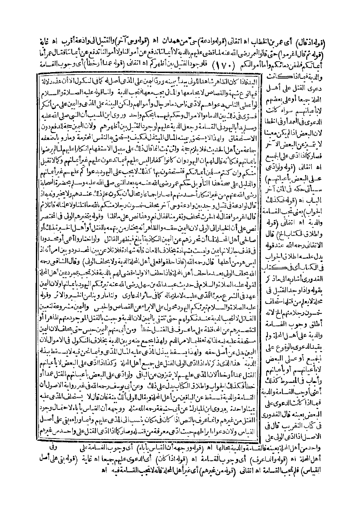 ـــــــــــــــــــــــــــــQقَوْلُهُ إذْ قَالَ) أَيْ عُمَرُ بْنُ الْخَطَّابِ اهـ أَتْقَانِيٌّ (قَوْلُهُ وَادِعَةَ) حَيٌّ مِنْ هَمْدَانَ. اهـ. (قَوْلُهُ وَحَيٍّ آخَرَ) وَالْقَتِيلُ إلَى وَادِعَةَ أَقْرَبُ. اهـ. غَايَةٌ (قَوْلُهُ ثُمَّ قَالَ اغْرَمُوا) حَتَّى قَالُوا لِعُمَرَ - رَضِيَ اللَّهُ عَنْهُ - لَمَّا قَضَى عَلَيْهِمْ بِالدِّيَةِ لَا أَيْمَانُنَا تَدْفَعُ عَنْ أَمْوَالِنَا وَلَا أَمْوَالُنَا تَدْفَعُ عَنْ أَيْمَانِنَا فَقَالَ عُمَرُ أَمَّا أَيْمَانُكُمْ فَلِحَقْنِ دِمَائِكُمْ وَأَمَّا أَمْوَالُكُمْ فَلِوُجُودِ الْقَتِيلِ بَيْنَ أَظْهُرِكُمْ اهـ أَتْقَانِيٌّ (قَوْلُهُ عَمْدًا أَوْ خَطَأً) أَيْ وُجُوبُ الْقَسَامَةِ وَالدِّيَةِ فِيمَا إذَا كَانَتْ دَعْوَى الْقَتْلِ عَلَى أَهْلِ الْمَحَلَّةِ جَمِيعًا أَوْ عَلَى بَعْضِهِمْ لَا بِأَعْيَانِهِمْ سَوَاءٌ كَانَتْ الدَّعْوَى فِي الْعَمْدِ أَوْ فِي الْخَطَأِ لِأَنَّ الْبَعْضَ إذَا لَمْ يَكُنْ مُعَيَّنًا لَا يَتَمَيَّزُ عَنْ الْبَعْضِ الْآخَرِ فَصَارَ كَمَا إذَا ادَّعَى عَلَى الْجَمِيعِ. اهـ. أَتْقَانِيٌّ (قَوْلُهُ وَلَوْ ادَّعَى عَلَى الْبَعْضِ بِأَعْيَانِهِمْ) سَيَأْتِي حُكْمُهُ فِي الْمَتْنِ آخِرَ الْبَابِ. اهـ. (قَوْلُهُ فَكَذَلِكَ الْجَوَابُ) يَعْنِي تَجِبُ الْقَسَامَةِ (قَوْلُهُ وَإِطْلَاقُ الْكِتَابِ إلَخْ) قَالَ الْأَتْقَانِيُّ - رَحِمَهُ اللَّهُ - عِنْدَ قَوْلِهِ يَدُلُّ عَلَيْهِ إطْلَاقُ الْجَوَابِ فِي الْكِتَابِ أَيْ فِي كِتَابِ الْقُدُورِيِّ أَشَارَ بِهِ إلَى مَا ذَكَرَ بِقَوْلِهِ وَإِذَا وُجِدَ الْقَتِيلُ فِي مَحَلَّةٍ لَا يُعْلَمُ مَنْ قَتَلَهُ اُسْتُحْلِفَ خَمْسُونَ رَجُلًا مِنْهُمْ إلَخْ لِأَنَّهُ أَطْلَقَ وُجُوبَ الْقَسَامَةِ وَالدِّيَةِ عَلَى أَهْلِ الْمَحَلَّةِ وَلَمْ يُقَيِّدْ الدَّعْوَى بِالْوُقُوعِ عَلَى الْجَمِيعِ أَوْ عَلَى الْبَعْضِ لَا بِأَعْيَانِهِمْ أَوْ بِأَعْيَانِهِمْ وَأَجَابَ فِي الْمَبْسُوطِ كَذَلِكَ أَعْنِي أَوْجَبَ الْقَسَامَةَ وَالدِّيَةَ فِيمَا إذَا كَانَتْ الدَّعْوَى عَلَى الْبَعْضِ بِعَيْنِهِ قَالَ الْقُدُورِيُّ فِي كِتَابِ التَّقْرِيبِ قَالَ فِي الْأَصْلِ إذَا ادَّعَى الْوَلِيُّ عَلَى وَاحِدٍ مِنْ أَهْلِ الْمَحَلَّةِ بِعَيْنِهِ فَالْقَسَامَةُ وَالدِّيَةُ بِحَالِهَا اهـ (قَوْلُهُ، وَوَجْهُهُ أَنَّ الْقِيَاسَ يَأْبَاهُ) أَيْ وُجُوبُ الْقَسَامَةِ عَلَى أَهْلِ الْمَحَلَّةِ. اهـ. (قَوْلُهُ وَإِنَّمَا عُرِفَ) أَيْ وُجُوبُ الْقَسَامَةِ. اهـ. (قَوْلُهُ إذَا كَانَ) أَيْ الدَّعْوَى عَلَيْهِمْ جَمِيعًا. اهـ. غَايَة (قَوْلُهُ بَقِيَ عَلَى أَصْلِ الْقِيَاسِ) فَلَمْ تَجِبْ الْقَسَامَةُ. اهـ. أَتْقَانِيٌّ (قَوْلُهُ مِنْ غَيْرِهِمْ) أَيْ غَيْرِ أَهْلِ الْمَحَلَّةِ فَإِنَّهُ لَا تَجِبُ الْقَسَامَةُ فِيهِ اهـ.