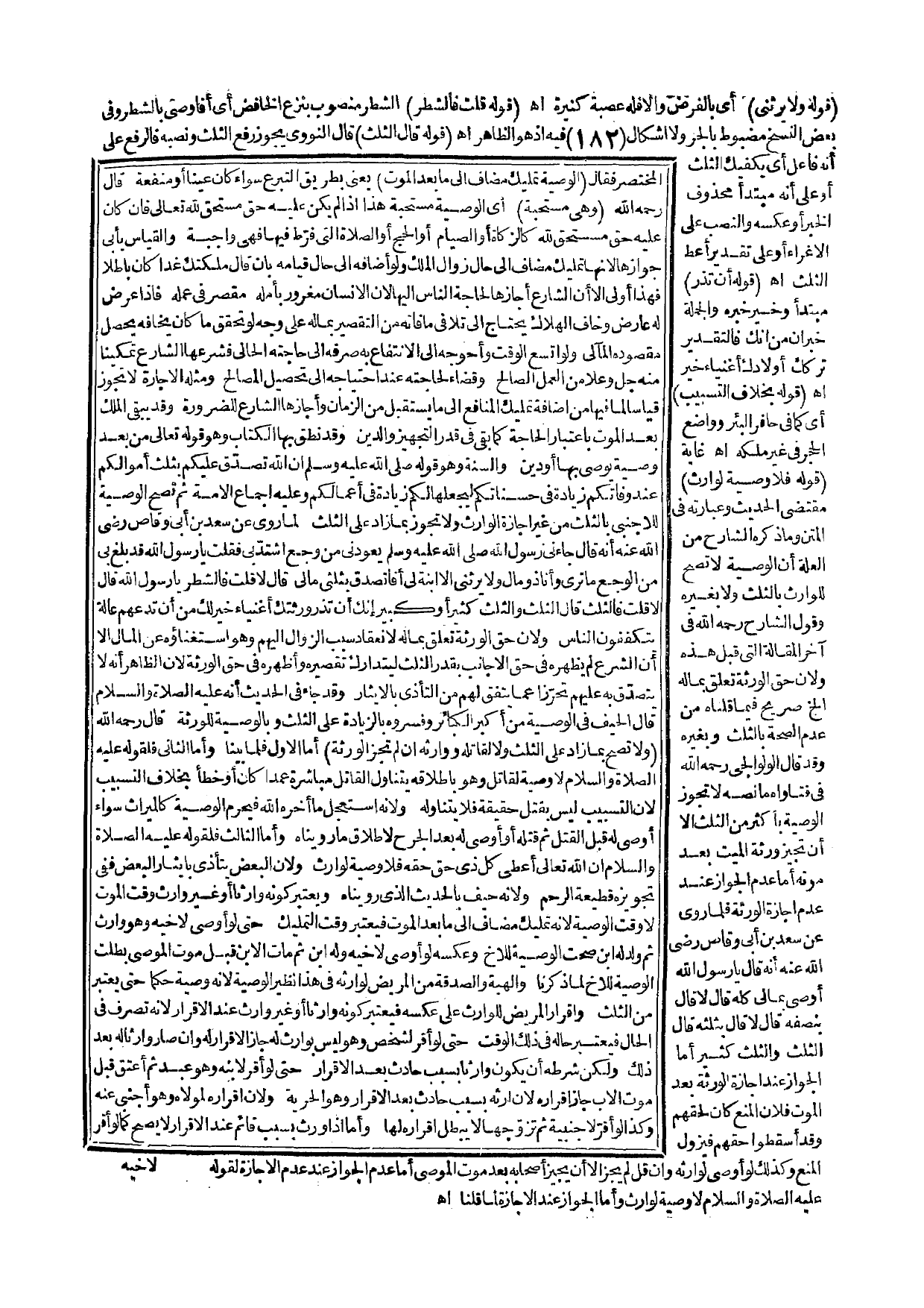 ـــــــــــــــــــــــــــــQقَوْلُهُ وَلَا يَرِثُنِي) أَيْ بِالْفَرْضِ وَإِلَّا فَلَهُ عَصَبَةٌ كَثِيرَةٌ. اهـ. (قَوْلُهُ قُلْت فَالشَّطْرَ) الشَّطْرُ مَنْصُوبٌ بِنَزْعِ الْخَافِضِ أَيْ أَفَأُوصِي بِالشَّطْرِ وَفِي بَعْضِ النُّسَخِ مَضْبُوطٌ بِالْجَرِّ وَلَا إشْكَالَ فِيهِ إذْ هُوَ الظَّاهِرُ. اهـ. (قَوْلُهُ قَالَ الثُّلُثُ) قَالَ النَّوَوِيُّ يَجُوزُ رَفْعُ الثُّلُثِ وَنَصْبُهُ فَالرَّفْعُ عَلَى أَنَّهُ فَاعِلٌ أَيْ يَكْفِيك الثُّلُثُ أَوْ عَلَى أَنَّهُ مُبْتَدَأٌ مَحْذُوفُ الْخَبَرِ أَوْ عَكْسُهُ وَالنَّصْبُ عَلَى الْإِغْرَاءِ أَوْ عَلَى تَقْدِيرِ أَعْطِ الثُّلُثَ. اهـ. (قَوْلُهُ إنْ تَذَرْ) مُبْتَدَأٌ وَخَيْرٌ خَبَرُهُ وَالْجُمْلَةُ خَبَرُ إنَّ مِنْ إنَّكَ فَالتَّقْدِيرُ تَرْكُك أَوْلَادَك أَغْنِيَاءَ خَيْرٌ اهـ.
