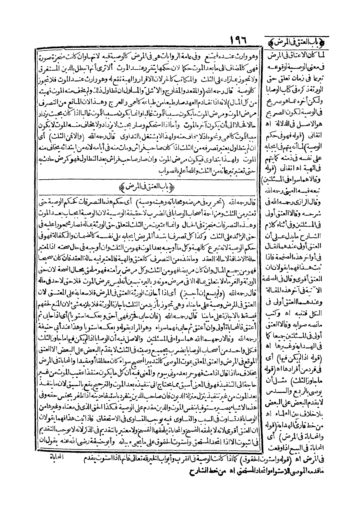 ـــــــــــــــــــــــــــــQبَابُ الْعِتْقِ فِي الْمَرَضِ) لَمَّا كَانَ الْإِعْتَاقُ فِي الْمَرَضِ فِي مَعْنَى الْوَصِيَّةِ لِوُقُوعِهِ تَبَرُّعًا فِي زَمَانِ تَعَلُّقِ حَقِّ الْوَرَثَةِ ذَكَرَهُ فِي كِتَابِ الْوَصَايَا وَلَكِنْ أَخَّرَهُ عَمَّا هُوَ صَرِيحٌ فِي الْوَصِيَّةِ لِكَوْنِ الصَّرِيحِ هُوَ الْأَصْلُ فِي الدَّلَالَةِ. اهـ. أَتْقَانِيٌّ (قَوْلُهُ فَهُوَ فِي حُكْمِ الْوَصِيَّةِ) لِمَا أَنَّهُ يُتَّهَمُ فِي إيجَابِهِ عَلَى نَفْسِهِ فِي ذِمَّتِهِ كَمَا يُتَّهَمُ فِي الْهِبَةِ اهـ أَتْقَانِيٌّ