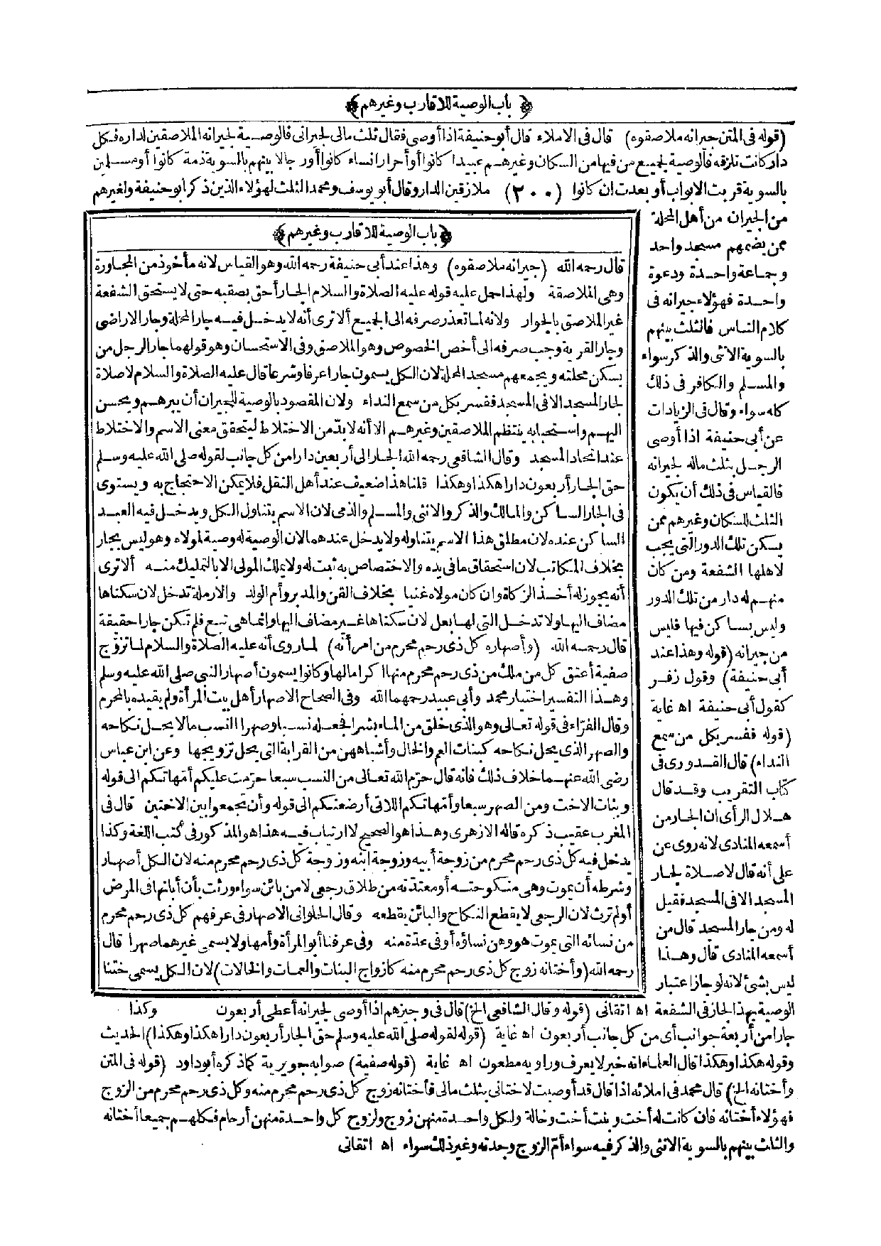 (بَابُ الْوَصِيَّةِ لِلْأَقَارِبِ وَغَيْرِهِمْ) قَالَ - رَحِمَهُ اللَّهُ - (جِيرَانُهُ مُلَاصِقُوهُ)، وَهَذَا عِنْدَ أَبِي حَنِيفَةَ - رَحِمَهُ اللَّهُ - وَهُوَ الْقِيَاسُ؛ لِأَنَّهُ مَأْخُوذٌ مِنْ الْمُجَاوَرَةِ وَهِيَ الْمُلَاصَقَةُ وَلِهَذَا حُمِلَ عَلَيْهِ قَوْلُهُ - عَلَيْهِ الصَّلَاةُ وَالسَّلَامُ - «الْجَارُ أَحَقُّ بِصَقَبِهِ» حَتَّى لَا يَسْتَحِقَّ الشُّفْعَةَ غَيْرُ الْمُلَاصِقِ بِالْجِوَارِ، وَلِأَنَّهُ لَمَّا تَعَذَّرَ صَرْفُهُ إلَى الْجَمِيعِ أَلَا تَرَى أَنَّهُ لَا يَدْخُلُ فِيهِ جَارُ الْمَحَلَّةِ وَجَارُ الْأَرَاضِيِ وَجَارُ الْقَرْيَةِ وَجَبَ صَرْفُهُ إلَى أَخَصِّ الْخُصُوصِ وَهُوَ الْمُلَاصِقُ وَفِي الِاسْتِحْسَانِ وَهُوَ قَوْلُهُمَا جَارُ الرَّجُلِ مَنْ يَسْكُنُ مَحَلَّتَهُ وَيَجْمَعُهُمْ مَسْجِدُ الْمَحَلَّةِ؛ لِأَنَّ الْكُلَّ يُسَمُّونَ جَارًا عُرْفًا وَشَرْعًا قَالَ - عَلَيْهِ الصَّلَاةُ وَالسَّلَامُ - «لَا صَلَاةَ لِجَارِ الْمَسْجِدِ إلَّا فِي الْمَسْجِدِ» فَفُسِّرَ بِكُلِّ مَنْ سَمِعَ النِّدَاءَ، وَلِأَنَّ الْمَقْصُودَ بِالْوَصِيَّةِ لِلْجِيرَانِ أَنْ يَبَرَّهُمْ وَيُحْسِنَ إلَيْهِمْ وَاسْتِحْبَابُهُ يَنْتَظِمُ الْمُلَاصِقِينَ وَغَيْرَهُمْ إلَّا أَنَّهُ لَا بُدَّ مِنْ الِاخْتِلَاطِ لِيَتَحَقَّقَ مَعْنَى الِاسْمِ وَالِاخْتِلَاطُ عِنْدَ اتِّحَادِ الْمَسْجِدِ، وَقَالَ الشَّافِعِيُّ - رَحِمَهُ اللَّهُ - الْجَارُ إلَى أَرْبَعِينَ دَارًا مِنْ كُلِّ جَانِبٍ لِقَوْلِهِ - صَلَّى اللَّهُ عَلَيْهِ وَسَلَّمَ - «حَقُّ الْجَارِ أَرْبَعُونَ دَارًا» هَكَذَا وَهَكَذَا قُلْنَا هَذَا ضَعِيفٌ عِنْدَ أَهْلِ النَّقْلِ فَلَا يُمْكِنُ الِاحْتِجَاجُ بِهِ وَيَسْتَوِي فِي الْجَارِ السَّاكِنِ وَالْمَالِكِ وَالذَّكَرِ وَالْأُنْثَى وَالْمُسْلِمِ وَالذِّمِّيِّ؛ لِأَنَّ الِاسْمَ يَتَنَاوَلُ الْكُلَّ وَيَدْخُلُ فِيهِ الْعَبْدُ السَّاكِنُ عِنْدَهُ؛ لِأَنَّ مُطْلَقَ هَذَا الِاسْمِ يَتَنَاوَلُهُ وَلَا يَدْخُلُ عِنْدَهُمَا؛ لِأَنَّ الْوَصِيَّةَ لَهُ وَصِيَّةٌ لِمَوْلَاهُ وَهُوَ لَيْسَ بِجَارٍ بِخِلَافِ الْمُكَاتَبِ؛ لِأَنَّ اسْتِحْقَاقَ مَا فِي يَدِهِ وَالِاخْتِصَاصَ بِهِ ثَبَتَ لَهُ وَلَا يَمْلِكُ الْمَوْلَى إلَّا بِالتَّمْلِيكِ مِنْهُ، أَلَا تَرَى أَنَّهُ يَجُوزُ لَهُ أَخْذُ الزَّكَاةِ وَإِنْ كَانَ مَوْلَاهُ غَنِيًّا بِخِلَافِ الْقِنِّ وَالْمُدَبَّرِ وَأُمِّ الْوَلَدِ وَالْأَرْمَلَةِ تَدْخُلُ؛ لِأَنَّ سُكْنَاهَا مُضَافٌ إلَيْهَا وَلَا تَدْخُلُ الَّتِي لَهَا بَعْلٌ؛ لِأَنَّ سُكْنَاهَا غَيْرُ مُضَافٍ إلَيْهَا، وَإِنَّمَا هِيَ تَبَعٌ فَلَمْ تَكُنْ جَارًا حَقِيقَةً.