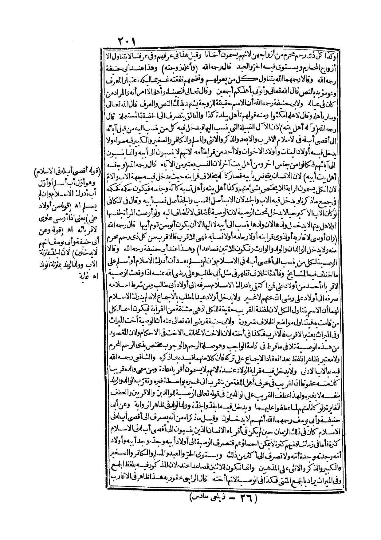 قَالَ - رَحِمَهُ اللَّهُ - (وَإِنْ أَوْصَى لِأَقَارِبِهِ وَلِذَوِي قَرَابَتِهِ أَوْ لِأَرْحَامِهِ أَوْ لِأَنْسَابِهِ فَهِيَ لِلْأَقْرَبِ فَالْأَقْرَبِ مِنْ كُلِّ ذِي رَحِمٍ مَحْرَمٍ مِنْهُ وَلَا يَدْخُلُ الْوَالِدَانِ وَالْوَلَدُ وَالْوَارِثُ وَتَكُونُ لِلِاثْنَيْنِ فَصَاعِدًا)، وَهَذَا عِنْدَ أَبِي حَنِيفَةَ - رَحِمَهُ اللَّهُ -، وَقَالَا الْوَصِيَّةُ لِكُلِّ مَنْ يُنْسَبُ إلَى أَقْصَى أَبٍ لَهُ فِي الْإِسْلَامِ وَإِنْ لَمْ يُسْلِمْ بَعْدَ أَنْ أَدْرَكَ الْإِسْلَامَ أَوْ أَسْلَمَ عَلَى مَا اخْتَلَفَ فِيهِ الْمَشَايِخُ. وَفَائِدَةُ الْخِلَافِ تَظْهَرُ فِي مِثْلِ أَبِي طَالِبٍ وَعَلِيٍّ - رَضِيَ اللَّهُ عَنْهُ - إذَا وَقَعَتْ الْوَصِيَّةُ لِأَقْرِبَاءِ أَحَدٍ مِنْ أَوْلَادِ عَلِيٍّ فَمَنْ اكْتَفَى بِإِدْرَاكِ الْإِسْلَامِ صَرَفَهُ إلَى أَوْلَادِ أَبِي طَالِبٍ وَمَنْ شَرَطَ إسْلَامَهُ صَرَفَهُ إلَى أَوْلَادِ عَلِيٍّ لَا غَيْرُ وَلَا يَدْخُلُ أَوْلَادُ عَبْدِ الْمُطَّلِبِ بِالْإِجْمَاعِ؛ لِأَنَّهُ لَمْ يُدْرِكْ الْإِسْلَامَ لَهُمَا أَنَّ الِاسْمَ يَتَنَاوَلُ الْكُلَّ.