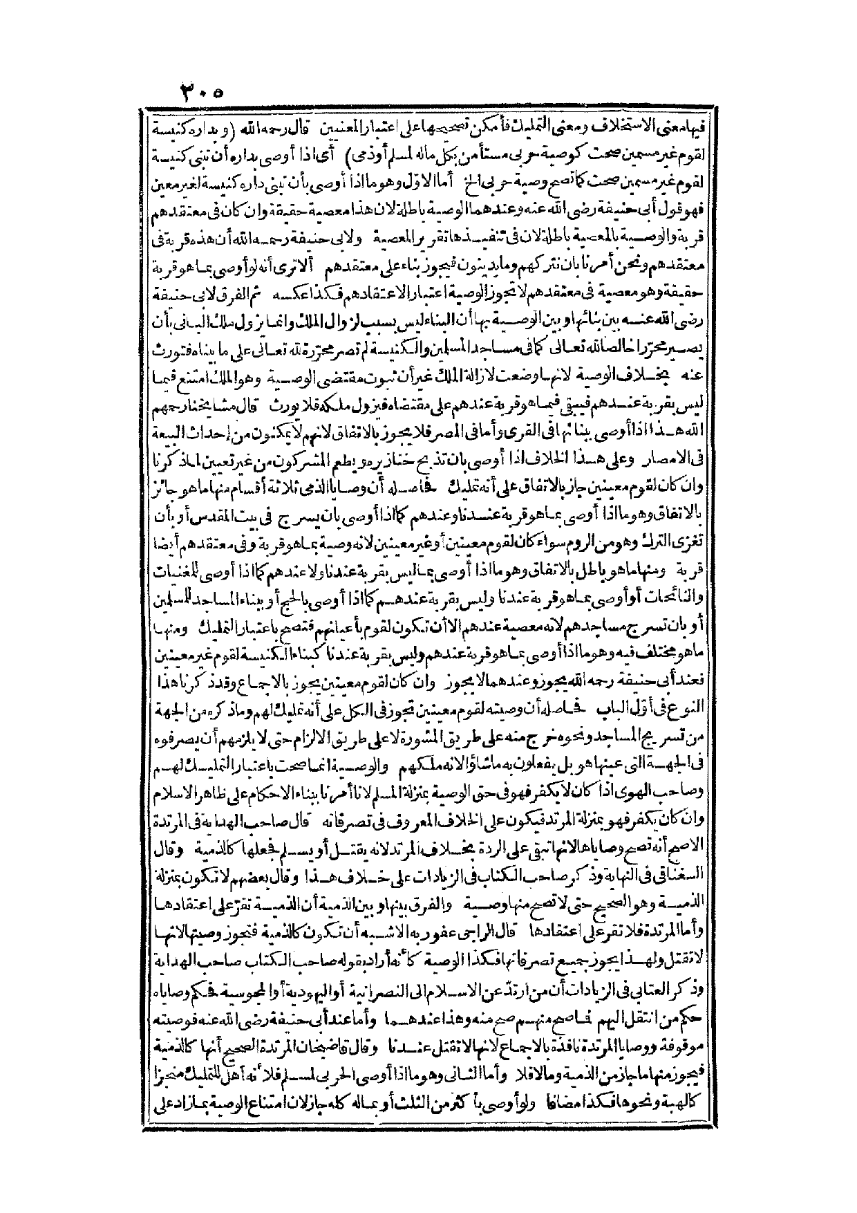 وَمِنْهَا مَا هُوَ بَاطِلٌ بِالِاتِّفَاقِ وَهُوَ مَا إذَا أَوْصَى بِمَا لَيْسَ بِقُرْبَةٍ عِنْدَنَا وَلَا عِنْدَهُمْ كَمَا إذَا أَوْصَى لِلْمُغَنِّيَاتِ وَالنَّائِحَاتِ أَوْ أَوْصَى بِمَا هُوَ قُرْبَةٌ عِنْدَنَا وَلَيْسَ بِقُرْبَةٍ عِنْدَهُمْ كَمَا إذَا أَوْصَى بِالْحَجِّ أَوْ بِبِنَاءِ الْمَسَاجِدِ لِلْمُسْلِمِينَ أَوْ بِأَنْ تُسْرَجَ مَسَاجِدُهُمْ؛ لِأَنَّهُ مَعْصِيَةٌ عِنْدَهُمْ إلَّا أَنْ تَكُونَ لِقَوْمٍ بِأَعْيَانِهِمْ فَتَصِحَّ بِاعْتِبَارِ التَّمْلِيكِ وَمِنْهَا مَا هُوَ مُخْتَلَفٌ فِيهِ وَهُوَ مَا إذَا أَوْصَى بِمَا هُوَ قُرْبَةٌ عِنْدَهُمْ وَلَيْسَ بِقُرْبَةٍ عِنْدَنَا كَبِنَاءِ الْكَنِيسَةِ لِقَوْمٍ غَيْرِ مُعَيَّنِينَ فَعِنْدَ أَبِي حَنِيفَةَ - رَحِمَهُ اللَّهُ - يَجُوزُ وَعِنْدَهُمَا لَا يَجُوزُ وَإِنْ كَانَ لِقَوْمٍ مُعَيَّنِينَ يَجُوزُ بِالْإِجْمَاعِ، وَقَدْ ذَكَرْنَا هَذَا النَّوْعَ فِي أَوَّلِ الْبَابِ فَحَاصِلُهُ أَنَّ وَصِيَّتَهُ لِقَوْمٍ مُعَيَّنِينَ تَجُوزُ فِي الْكُلِّ عَلَى أَنَّهُ تَمْلِيكٌ لَهُمْ وَمَا ذَكَرَهُ مِنْ الْجِهَةِ مِنْ تَسْرِيجِ الْمَسَاجِدِ وَنَحْوِهِ خَرَجَ مِنْهُ عَلَى طَرِيقِ الْمَشُورَةِ لَا عَلَى طَرِيقِ الْإِلْزَامِ حَتَّى لَا يَلْزَمَهُمْ أَنْ يَصْرِفُوهُ فِي الْجِهَةِ الَّتِي عَيَّنَهَا هُوَ بَلْ يَفْعَلُونَ بِهِ مَا شَاءُوا.