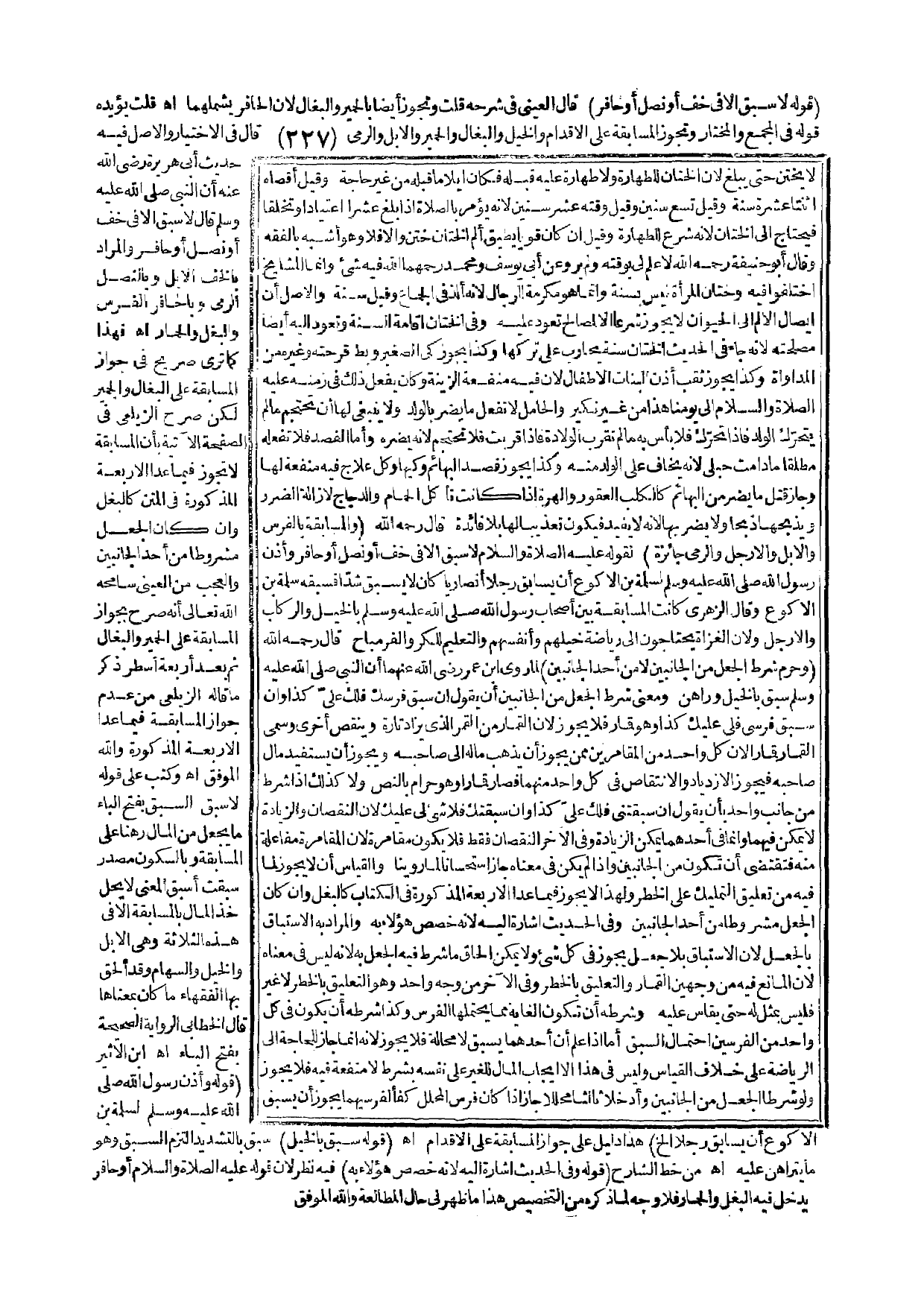 وَالْمُرَادُ بِالْخُفِّ الْإِبِلُ وَبِالنَّصْلِ الرَّمْيُ وَبِالْحَافِرِ الْفَرَسُ وَالْبَغْلُ وَالْحِمَارُ اهـ فَهَذَا كَمَا تَرَى صَرِيحٌ فِي جَوَازِ الْمُسَابَقَةِ عَلَى الْبِغَالِ وَالْحَمِيرِ لَكِنْ صَرَّحَ الزَّيْلَعِيُّ فِي الصَّفْحَةِ الْآتِيَةِ بِأَنَّ الْمُسَابَقَةَ لَا تَجُوزُ فِيمَا عَدَا الْأَرْبَعَةَ الْمَذْكُورَةَ فِي الْمَتْنِ كَالْبَغْلِ وَإِنْ كَانَ الْجُعْلُ مَشْرُوطًا مِنْ أَحَدِ الْجَانِبَيْنِ وَالْعَجَبُ مِنْ الْعَيْنِيِّ سَامَحَهُ اللَّهُ تَعَالَى أَنَّهُ صَرَّحَ بِجَوَازِ الْمُسَابَقَةِ عَلَى الْحَمِيرِ وَالْبِغَالِ ثُمَّ بَعْدَ أَرْبَعَةِ أَسْطُرٍ ذَكَرَ مَا قَالَهُ الزَّيْلَعِيُّ مِنْ عَدَمِ جَوَازِ الْمُسَابَقَةِ فِيمَا عَدَا الْأَرْبَعَةَ الْمَذْكُورَةَ وَاَللَّهُ الْمُوَفِّقُ اهـ.