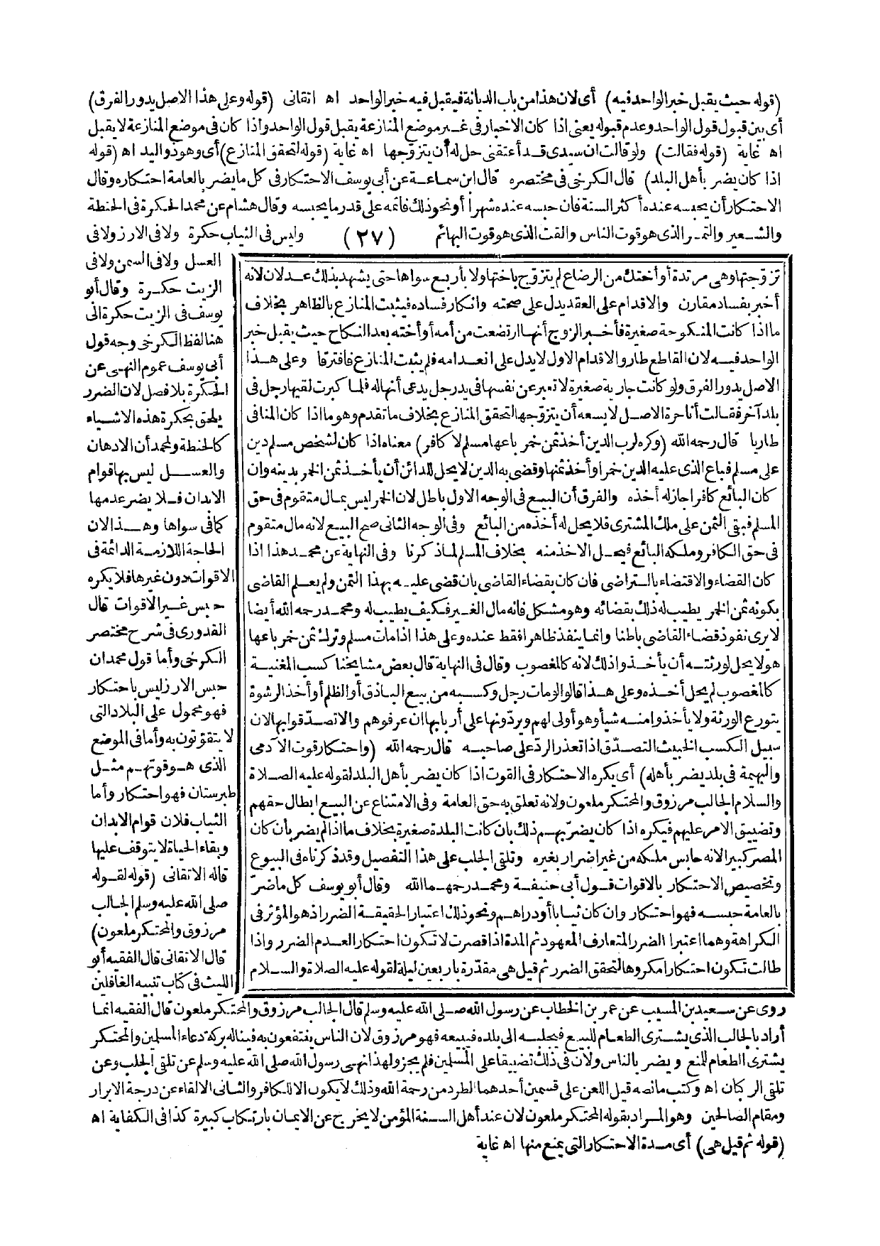 (قَوْلُهُ: لِقَوْلِهِ - صَلَّى اللَّهُ عَلَيْهِ وَسَلَّمَ - الْجَالِبُ مَرْزُوقٌ وَالْمُحْتَكِرُ مَلْعُونٌ) قَالَ الْأَتْقَانِيُّ قَالَ الْفَقِيهُ أَبُو اللَّيْثِ فِي كِتَابِ تَنْبِيهِ الْغَافِلِينَ رُوِيَ عَنْ سَعِيدِ بْنِ الْمُسَيِّبِ عَنْ عُمَرَ بْنِ الْخَطَّابِ عَنْ رَسُولِ اللَّهِ - صَلَّى اللَّهُ عَلَيْهِ وَسَلَّمَ - قَالَ «الْجَالِبُ مَرْزُوقٌ وَالْمُحْتَكِرُ مَلْعُونٌ» قَالَ الْفَقِيهُ إنَّمَا أَرَادَ بِالْجَالِبِ الَّذِي يَشْتَرِي الطَّعَامَ لِلْبَيْعِ فَيَجْلِبُهُ إلَى بَلَدِهِ فَيَبِيعُهُ فَهُوَ مَرْزُوقٌ؛ لِأَنَّ النَّاسَ يَنْتَفِعُونَ بِهِ فَيَنَالُهُ بَرَكَةُ دُعَاءِ الْمُسْلِمِينَ وَالْمُحْتَكِرُ يَشْتَرِي الطَّعَامَ لِلْمَنْعِ، وَيَضُرُّ بِالنَّاسِ؛ وَلِأَنَّ فِي ذَلِكَ تَضْيِيقًا عَلَى الْمُسْلِمِينَ فَلَمْ يَجُزْ وَلِهَذَا «نَهَى رَسُولُ اللَّهِ - صَلَّى اللَّهُ عَلَيْهِ وَسَلَّمَ - عَنْ تَلَقِّي الْجَلْبِ، وَعَنْ تَلَقِّي الرُّكْبَانِ». اهـ. وَكَتَبَ مَا نَصُّهُ قِيلَ اللَّعْنُ عَلَى قِسْمَيْنِ أَحَدِهِمَا الطَّرْدُ مِنْ رَحْمَةِ اللَّهِ، وَذَلِكَ لَا يَكُونُ إلَّا لِلْكَافِرِ وَالثَّانِي الْإِلْقَاءُ عَنْ دَرَجَةِ الْأَبْرَارِ، وَمَقَامِ الصَّالِحِينَ، وَهُوَ الْمُرَادُ بِقَوْلِهِ الْمُحْتَكِرُ مَلْعُونٌ؛ لِأَنَّ عِنْدَ أَهْلِ السُّنَّةِ الْمُؤْمِنُ لَا يَخْرُجُ عَنْ الْإِيمَانِ بِارْتِكَابِ كَبِيرَةٍ كَذَا فِي الْكِفَايَةِ. اهـ.
