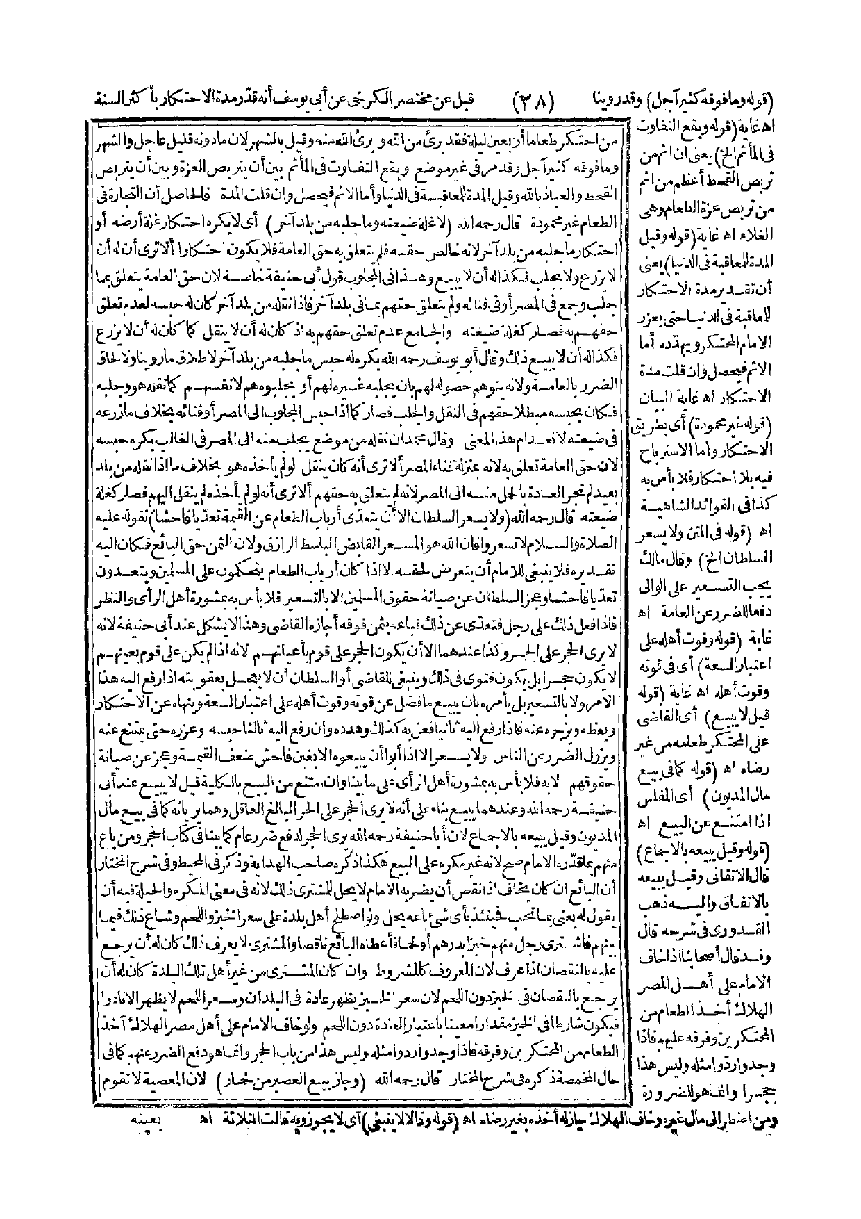 «مَنْ احْتَكَرَ طَعَامًا أَرْبَعِينَ لَيْلَةً فَقَدْ بَرِئَ مِنْ اللَّهِ وَبَرِئَ اللَّهُ مِنْهُ»، وَقِيلَ بِالشَّهْرِ؛ لِأَنَّ مَا دُونَهُ قَلِيلٌ عَاجِلٌ وَالشَّهْرُ، وَمَا فَوْقَهُ كَثِيرٌ آجِلٌ، وَقَدْ مَرَّ فِي غَيْرِ مَوْضِعٍ، وَيَقَعُ التَّفَاوُتُ فِي الْمَأْثَمِ بَيْنَ أَنْ يَتَرَبَّصَ الْعِزَّةَ وَبَيْنَ أَنْ يَتَرَبَّصَ الْقَحْطَ وَالْعِيَاذُ بِاَللَّهِ، وَقِيلَ الْمُدَّةُ لِلْمُعَاقَبَةِ فِي الدُّنْيَا، وَأَمَّا الْإِثْمُ فَيَحْصُلُ، وَإِنْ قَلَّتْ الْمُدَّةُ فَالْحَاصِلُ أَنَّ التِّجَارَةَ فِي الطَّعَامِ غَيْرُ مَحْمُودَةٍ.