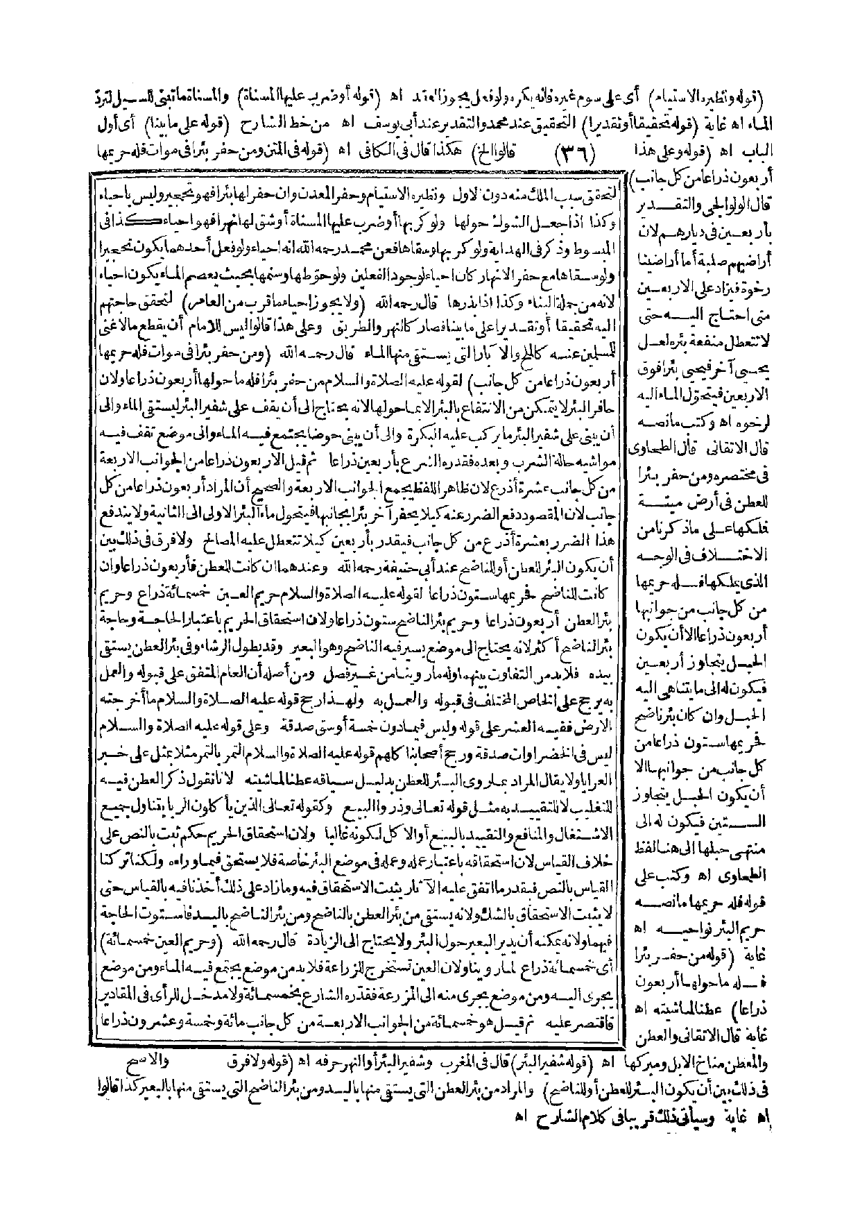 (قَوْلُهُ فِي الْمَتْنِ: وَمَنْ حَفَرَ بِئْرًا فِي مَوَاتٍ فَلَهُ حَرِيمُهَا أَرْبَعُونَ ذِرَاعًا مِنْ كُلِّ جَانِبٍ) قَالَ الْوَلْوَالِجِيُّ وَالتَّقْدِيرُ بِأَرْبَعِينَ فِي دِيَارِهِمْ؛ لِأَنَّ أَرَاضِيَهُمْ صَلْبَةٌ أَمَّا أَرَاضِيُنَا رَخْوَةٌ فَيُزَادُ عَلَى الْأَرْبَعِينَ مَتَى احْتَاجَ إلَيْهِ حَتَّى لَا تَتَعَطَّلَ مَنْفَعَةُ بِئْرِهِ لَعَلَّ يُحْيِيَ آخَرَ فَيُحْيِيَ بِئْرًا فَوْقَ الْأَرْبَعِينَ فَيَتَحَوَّلُ الْمَاءُ إلَيْهِ لِرِخْوِهِ. اهـ.، وَكَتَبَ مَا نَصُّهُ قَالَ الْأَتْقَانِيُّ قَالَ الطَّحَاوِيُّ فِي مُخْتَصَرِهِ، وَمَنْ حَفَرَ بِئْرًا لِلْعَطَنِ فِي أَرْضٍ مَيِّتَةٍ فَمِلْكُهَا عَلَى مَا ذَكَرْنَا مِنْ الِاخْتِلَافِ فِي الْوَجْهِ الَّذِي يَمْلِكُهَا فَلَهُ حَرِيمُهَا مِنْ كُلِّ جَانِبٍ مِنْ جَوَانِبِهَا أَرْبَعُونَ ذِرَاعًا إلَّا أَنْ يَكُونَ الْحَبْلُ يَتَجَاوَزُ أَرْبَعِينَ فَيَكُونُ لَهُ إلَى مَا يَتَنَاهَى إلَيْهِ الْحَبْلُ، وَإِنْ كَانَ بِئْرٌ نَاضِحٌ فَحَرِيمُهَا سِتُّونَ ذِرَاعًا مِنْ كُلِّ جَانِبٍ مِنْ جَوَانِبِهَا إلَّا أَنْ يَكُونَ الْحَبْلُ يَتَجَاوَزُ السِّتِّينَ فَيَكُونُ لَهُ إلَى مُنْتَهَى حَبْلِهَا إلَى هُنَا لَفْظُ الطَّحَاوِيِّ. اهـ.، وَكَتَبَ عَلَى قَوْلِهِ فَلَهُ حَرِيمُهَا مَا نَصُّهُ حَرِيمُ الْبِئْرِ نَوَاحِيهِ. اهـ. غَايَةٌ (قَوْلُهُ: مَنْ حَفَرَ بِئْرًا فَلَهُ مَا حَوْلَهَا أَرْبَعُونَ ذِرَاعًا) عَطَنًا لِمَاشِيَتِهِ. اهـ. غَايَةٌ قَالَ الْأَتْقَانِيُّ وَالْعَطَنُ وَالْمَعْطَنُ مُنَاخُ الْإِبِلِ، وَمَبْرَكُهَا. اهـ. (قَوْلُهُ: شَفِيرُ الْبِئْرِ) قَالَ فِي الْمُغْرِبِ وَشَفِيرُ الْبِئْرِ أَوْ النَّهْرِ حَرْفُهُ. اهـ. (قَوْلُهُ: وَلَا فَرْقَ فِي ذَلِكَ بَيْنَ أَنْ يَكُونَ الْبِئْرُ لِلْعَطَنِ أَوْ لِلنَّاضِحِ) وَالْمُرَادُ مِنْ بِئْرِ الْعَطَنِ الَّتِي يُسْتَقَى مِنْهَا بِالْيَدِ، وَمِنْ بِئْرِ النَّاضِحِ الَّتِي يُسْتَقَى مِنْهَا بِالْبَعِيرِ كَذَا قَالُوا. اهـ غَايَةٌ وَسَيَأْتِي ذَلِكَ قَرِيبًا فِي كَلَامِ الشَّارِحِ. اهـ