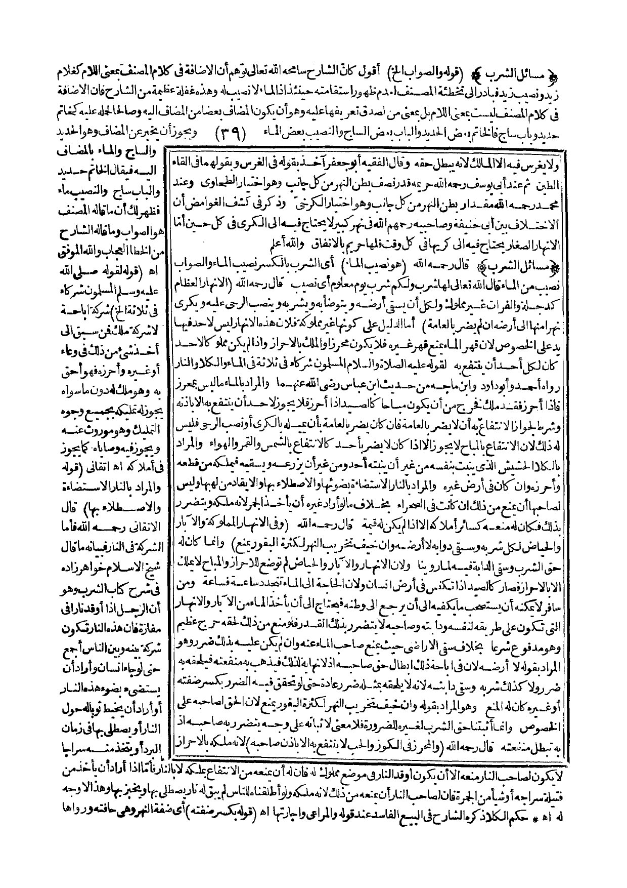 (مَسَائِلُ الشِّرْبِ) (قَوْلُهُ: وَالصَّوَابُ إلَخْ) أَقُولُ كَانَ الشَّارِحُ سَامَحَهُ اللَّهُ تَعَالَى تَوَهَّمَ أَنَّ الْإِضَافَةَ فِي كَلَامِ الْمُصَنِّفِ بِمَعْنَى اللَّامِ كَغُلَامِ زَيْدٍ وَنَصِيبِ زَيْدٍ فَبَادَرَ إلَى تَخْطِئَةِ الْمُصَنِّفِ لِعَدَمِ ظُهُورِ اسْتِقَامَتِهِ حِينَئِذٍ إذْ الْمَاءُ لَا نَصِيبَ لَهُ، وَهَذِهِ غَفْلَةٌ عَظِيمَةٌ مِنْ الشَّارِحِ فَإِنَّ الْإِضَافَةَ فِي كَلَامِ الْمُصَنِّفِ لَيْسَتْ بِمَعْنَى اللَّامِ بَلْ بِمَعْنَى مِنْ لِصِدْقِ تَعْرِيفِهَا عَلَيْهِ، وَهُوَ أَنْ يَكُونَ الْمُضَافُ بَعْضًا مِنْ الْمُضَافِ إلَيْهِ وَصَالِحًا لِحَمْلِهِ عَلَيْهِ كَخَاتَمِ حَدِيدٍ وَبَابِ سَاجٍ فَالْخَاتَمُ بَعْضُ الْحَدِيدِ وَالْبَابُ بَعْضُ السَّاجِ وَالنَّصِيبُ بَعْضُ الْمَاءِ، وَيَجُوزُ أَنْ يُخْبِرَ عَنْ الْمُضَافِ، وَهُوَ الْحَدِيدُ وَالسَّاجُ وَالْمَاءُ بِالْمُضَافِ إلَيْهِ فَيُقَالُ الْخَاتَمُ حَدِيدٌ وَالْبَابُ سَاجٌ وَالنَّصِيبُ مَاءٌ فَظَهَرَ لَك أَنَّ مَا قَالَهُ الْمُصَنِّفُ هُوَ الصَّوَابُ، وَمَا قَالَهُ الشَّارِحُ مِنْ الْخَطَأِ الْعُجَابِ وَاَللَّهُ الْمُوَفِّقُ. اهـ. (قَوْلُهُ: لِقَوْلِهِ - صَلَّى اللَّهُ عَلَيْهِ وَسَلَّمَ - «الْمُسْلِمُونَ شُرَكَاءُ فِي ثَلَاثَةٍ» إلَخْ) شَرِكَةُ إبَاحَةٍ لَا شَرِكَةُ مِلْكٍ فَمَنْ سَبَقَ إلَى أَخْذِ شَيْءٍ مِنْ ذَلِكَ فِي وِعَاءٍ أَوْ غَيْرِهِ، وَأَحْرَزَهُ فَهُوَ أَحَقُّ بِهِ، وَهُوَ مِلْكٌ لَهُ دُونَ مَا سِوَاهُ يَجُوزُ لَهُ تَمْلِيكُهُ بِجَمِيعِ وُجُوهِ التَّمْلِيكِ، وَهُوَ مَوْرُوثٌ عَنْهُ، وَيَجُوزُ فِيهِ وَصَايَاهُ كَمَا يَجُوزُ فِي أَمْلَاكِهِ. اهـ. أَتْقَانِيٌّ (قَوْلُهُ: وَالْمُرَادُ بِالنَّارِ الِاسْتِضَاءَةُ وَالِاصْطِلَاءُ بِهَا) قَالَ الْأَتْقَانِيُّ - رَحِمَهُ اللَّهُ - فَأَمَّا الشَّرِكَةُ فِي النَّارِ فَبَيَانُهُ مَا قَالَ شَيْخُ الْإِسْلَامِ خُوَاهَرْزَادَهْ فِي شَرْحِ كِتَابِ الشِّرْبِ، وَهُوَ أَنَّ الرَّجُلَ إذَا أَوْقَدَ نَارًا فِي مَفَازَةٍ فَإِنَّ هَذِهِ النَّارَ تَكُونُ شَرِكَةً بَيْنَهُ وَبَيْنَ النَّاسِ أَجْمَعَ حَتَّى لَوْ جَاءَ إنْسَانٌ، وَأَرَادَ أَنْ يَسْتَضِيءَ بِضَوْءِ هَذِهِ النَّارِ أَوْ أَرَادَ أَنْ يَخِيطَ ثَوْبًا لَهُ حَوْلَ النَّارِ أَوْ يَصْطَلِيَ بِهَا فِي زَمَانِ الْبَرْدِ أَوْ يَتَّخِذَ مِنْهُ سِرَاجًا لَا يَكُونُ لِصَاحِبِ النَّارِ مَنْعُهُ إلَّا أَنْ يَكُونَ أَوْقَدَ النَّارَ فِي مَوْضِعٍ مَمْلُوكٍ لَهُ فَإِنَّ لَهُ أَنْ يَمْنَعَهُ مِنْ الِانْتِفَاعِ بِمِلْكِهِ لَا بِالنَّارِ فَأَمَّا إذَا أَرَادَ أَنْ يَأْخُذَ مِنْ فَتِيلَةِ سِرَاجِهِ أَوْ شَيْئًا مِنْ الْجَمْرَةِ فَإِنَّ لِصَاحِبِ النَّارِ أَنْ يَمْنَعَهُ مِنْ ذَلِكَ؛ لِأَنَّهُ مِلْكُهُ، وَلَوْ أَطْلَقْنَاهُ لِلنَّاسِ لَمْ يَبْقَ لَهُ نَارٌ يَصْطَلِي بِهَا، وَيَخْبِزُ بِهَا، وَهَذَا الْأَوْجَهُ لَهُ. اهـ. حُكْمُ الْكَلَأِ ذَكَرَهُ الشَّارِحُ فِي الْبَيْعِ الْفَاسِدِ عِنْدَ قَوْلِهِ وَالْمَرَاعِي، وَإِجَارَتِهَا. اهـ.