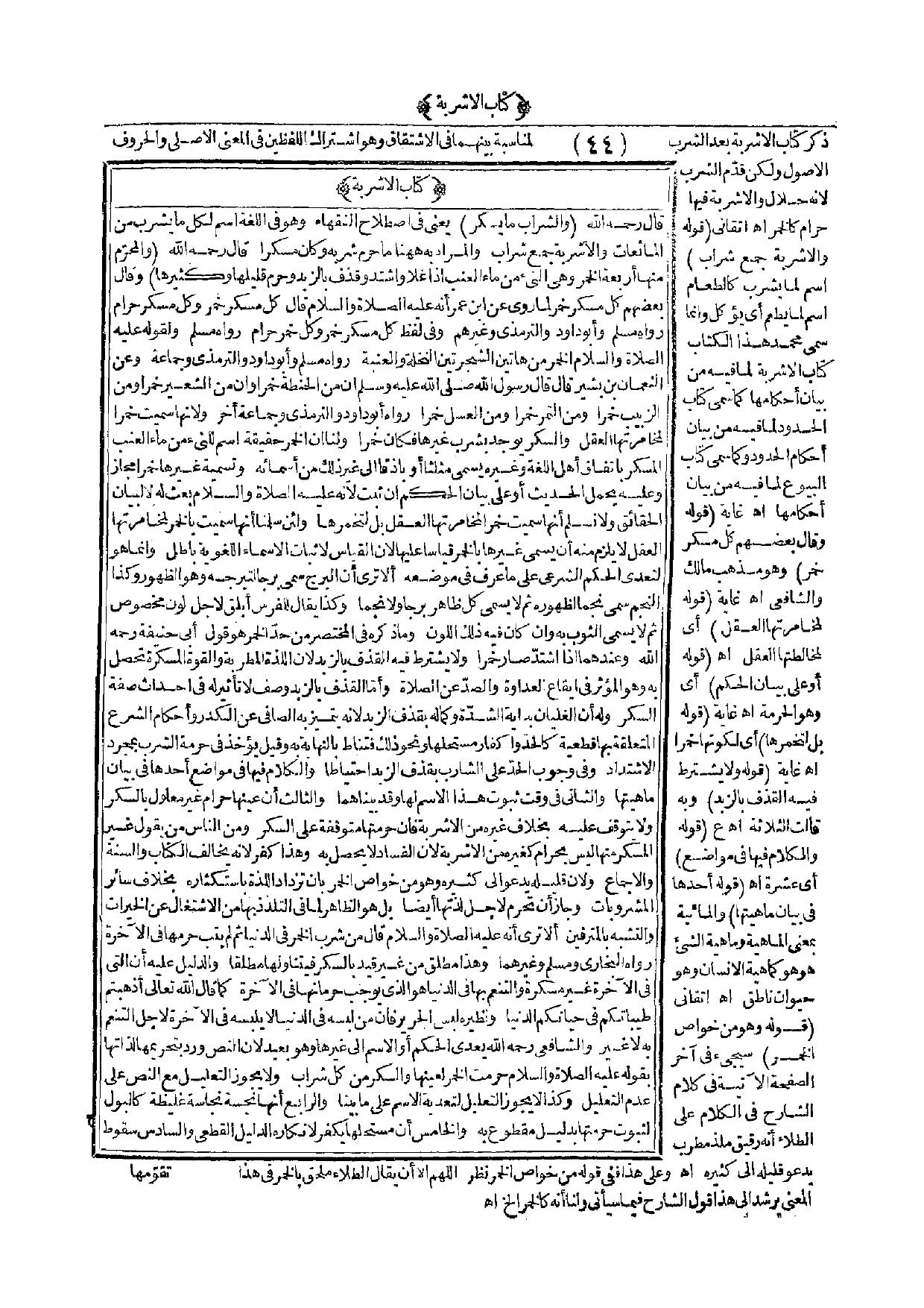 ـــــــــــــــــــــــــــــQكِتَابُ الْأَشْرِبَةِ} ذَكَرَ كِتَابَ الْأَشْرِبَةِ بَعْدَ الشُّرْبِ لِمُنَاسَبَةٍ بَيْنَهُمَا فِي الِاشْتِقَاقِ، وَهُوَ اشْتِرَاكُ اللَّفْظَيْنِ فِي الْمَعْنَى الْأَصْلِيِّ وَالْحُرُوفِ الْأُصُولِ وَلَكِنْ قَدَّمَ الشُّرْبَ؛ لِأَنَّهُ حَلَالٌ وَالْأَشْرِبَةُ فِيهَا حَرَامٌ كَالْخَمْرِ. اهـ. أَتْقَانِيٌّ (قَوْلُهُ وَالْأَشْرِبَةُ جَمْعُ شَرَابٍ) اسْمٌ لِمَا يُشْرَبُ كَالطَّعَامِ اسْمٌ لِمَا يُطْعَمُ أَيْ يُؤْكَلُ، وَإِنَّمَا سَمَّى مُحَمَّدٌ هَذَا الْكِتَابَ كِتَابَ الْأَشْرِبَةِ لِمَا فِيهِ مِنْ بَيَانِ أَحْكَامِهَا كَمَا سَمَّى كِتَابَ الْحُدُودِ لِمَا فِيهِ مِنْ بَيَانِ أَحْكَامِ الْحُدُودِ وَكَمَا سَمَّى كِتَابَ الْبُيُوعِ لِمَا فِيهِ مِنْ بَيَانِ أَحْكَامِهَا. اهـ. غَايَةٌ (قَوْلُهُ وَقَالَ بَعْضُهُمْ: كُلُّ مُسْكِرٍ خَمْرٌ)، وَهُوَ مَذْهَبُ مَالِكٍ وَالشَّافِعِيِّ. اهـ. غَايَةٌ (قَوْلُهُ لِمُخَامَرَتِهَا الْعَقْلَ) أَيْ لِمُخَالَطَتِهَا الْعَقْلَ اهـ (قَوْلُهُ أَوْ عَلَى بَيَانِ الْحُكْمِ) أَيْ، وَهُوَ الْحُرْمَةُ اهـ غَايَةٌ (قَوْلُهُ بَلْ لِتَخَمُّرِهَا) أَيْ لِكَوْنِهَا خَمْرًا. اهـ. غَايَةٌ (قَوْلُهُ وَلَا يُشْتَرَطُ فِيهِ الْقَذْفُ بِالزَّبَدِ) وَبِهِ قَالَتْ الثَّلَاثَةُ اهـ ع (قَوْلُهُ وَالْكَلَامُ فِيهَا فِي مَوَاضِعَ) أَيْ عَشَرَةٍ. اهـ. (قَوْلُهُ أَحَدُهَا فِي بَيَانِ مَاهِيَّتِهَا) وَالْمَائِيَّةُ بِمَعْنَى الْمَاهِيَّةِ وَمَاهِيَّةُ الشَّيْءِ هُوَ هُوَ كَمَاهِيَّةِ الْإِنْسَانِ، وَهُوَ حَيَوَانٌ نَاطِقٌ. اهـ. أَتْقَانِيٌّ (قَوْلُهُ، وَهُوَ مِنْ خَوَاصِّ الْخَمْرِ) سَيَجِيءُ فِي آخِرِ الصَّفْحَةِ الْآتِيَةِ فِي كَلَامِ الشَّارِحِ فِي الْكَلَامِ عَلَى الطِّلَاءِ أَنَّهُ رَقِيقٌ مُلِذٌّ مُطْرِبٌ يَدْعُو قَلِيلُهُ إلَى كَثِيرِهِ اهـ وَعَلَى هَذَا فَفِي قَوْلِهِ مِنْ خَوَاصِّ الْخَمْرِ نَظَرٌ اللَّهُمَّ إلَّا أَنْ يُقَالَ الطِّلَاءُ مُلْحَقٌ بِالْخَمْرِ فِي هَذَا الْمَعْنَى يُرْشِدُ إلَى هَذَا قَوْلُ الشَّارِحِ فِيمَا سَيَأْتِي وَلَنَا أَنَّهُ كَالْخَمْرِ إلَخْ اهـ