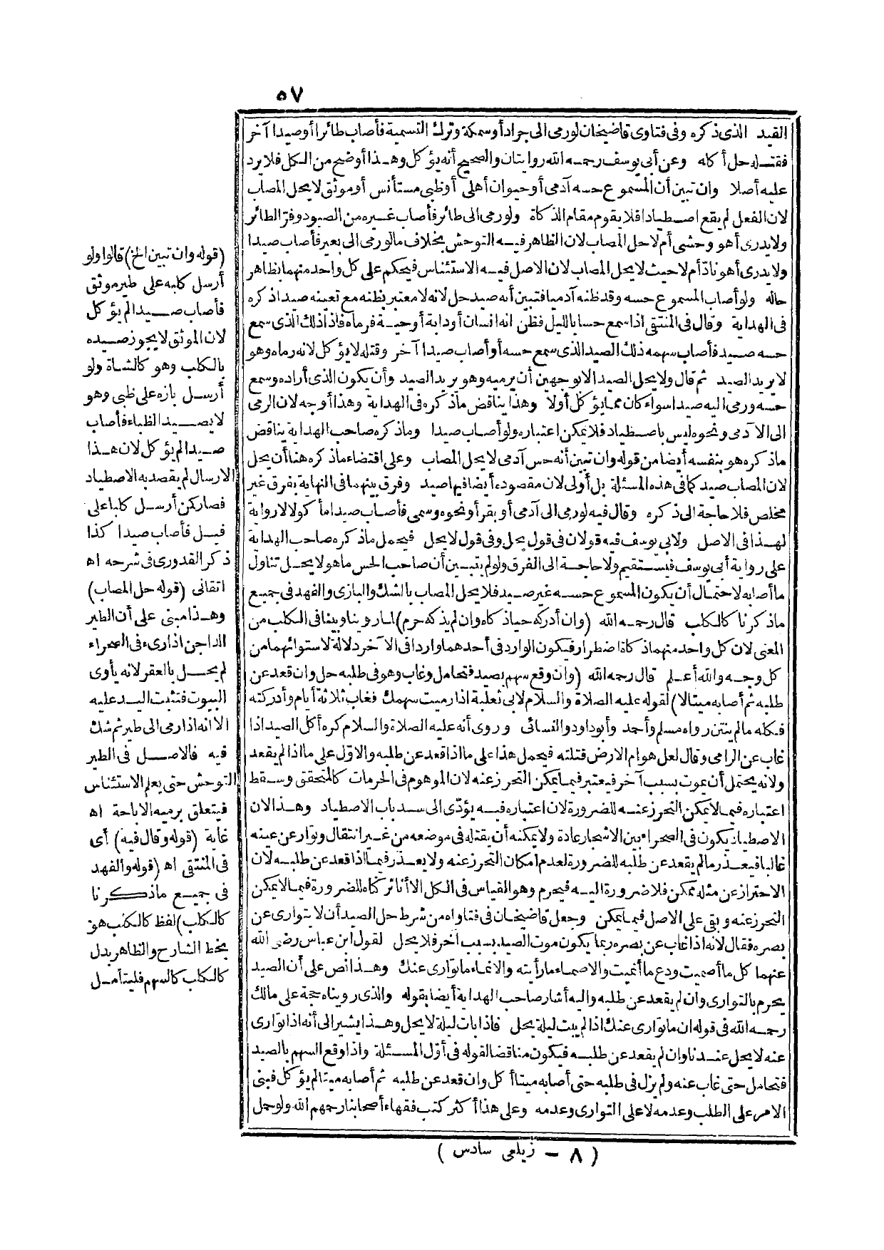 ـــــــــــــــــــــــــــــQقَوْلُهُ، وَإِنْ تَبَيَّنَ إلَخْ) قَالُوا وَلَوْ أَرْسَلَ كَلْبَهُ عَلَى طَيْرٍ مُوثَقٍ فَأَصَابَ صَيْدًا لَمْ يُؤْكَلْ؛ لِأَنَّ الْمُوثَقَ لَا يَجُوزُ صَيْدُهُ بِالْكَلْبِ، وَهُوَ كَالشَّاةِ وَلَوْ أَرْسَلَ بَازَهُ عَلَى ظَبْيٍ، وَهُوَ لَا يَصِيدُ الظِّبَاءَ فَأَصَابَ صَيْدًا لَمْ يُؤْكَلْ لِأَنَّ هَذَا الْإِرْسَالَ لَمْ يُقْصَدْ بِهِ الِاصْطِيَادُ فَصَارَ كَمَنْ أَرْسَلَ كَلْبًا عَلَى فِيلٍ فَأَصَابَ صَيْدًا كَذَا ذَكَرَ الْقُدُورِيُّ فِي شَرْحِهِ. اهـ. أَتْقَانِيٌّ (قَوْلُهُ حَلَّ الْمُصَابُ)، وَهَذَا مَبْنِيٌّ عَلَى أَنَّ الطَّيْرَ الدَّاجِنَ إذَا رُئِيَ فِي الصَّحْرَاءِ لَمْ يَحِلَّ بِالْعَقْرِ؛ لِأَنَّهُ يَأْوِي الْبُيُوتَ فَتَثْبُتُ الْيَدُ عَلَيْهِ إلَّا أَنَّهُ إذَا رَمَى إلَى طَيْرٍ ثُمَّ شَكَّ فِيهِ فَالْأَصْلُ فِي الطَّيْرِ التَّوَحُّشُ حَتَّى يُعَلَّمَ الِاسْتِئْنَاسَ فَيَتَعَلَّقُ بِرَمْيِهِ الْإِبَاحَةُ. اهـ. غَايَةٌ (قَوْلُهُ وَقَالَ فِيهِ) أَيْ فِي الْمُنْتَقَى. اهـ. (قَوْلُهُ وَالْفَهْدُ فِي جَمِيعِ مَا ذَكَرْنَا كَالْكَلْبِ) لَفْظُ كَالْكَلْبِ هُوَ بِخَطِّ الشَّارِحِ وَالظَّاهِرُ بَدَلُ كَالْكَلْبِ كَالسَّهْمِ فَلْيُتَأَمَّلْ