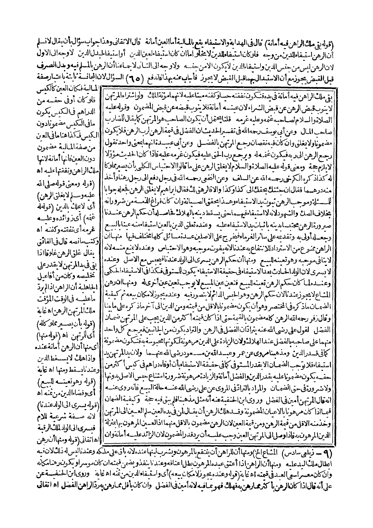 وَمِنْهَا أَنَّ رَهْنَ الْمُشَاعِ لَا يَجُوزُ عِنْدَنَا؛ لِأَنَّ حُكْمَ الرَّهْنِ، وَهُوَ الْحَبْسُ الدَّائِمُ لَا يُتَصَوَّرُ فِيهِ وَعِنْدَهُ يَجُوزُ لِإِمْكَانِ بَيْعِهِ ثُمَّ كَيْفِيَّةُ الضَّمَانِ مَا ذَكَرَهُ فِي الْمُخْتَصَرِ، وَهُوَ أَنْ يَكُونَ مَضْمُونًا بِالْأَقَلِّ مِنْ قِيمَتِهِ وَمِنْ الدَّيْنِ إلَى آخِرِ مَا ذَكَرَهُ عَلَى مَا بَيَّنَّا وَقَالَ زُفَرُ: - رَحِمَهُ اللَّهُ - الرَّهْنُ كُلُّهُ مَضْمُونٌ بِالْقِيمَةِ حَتَّى إذَا كَانَ قِيمَتُهُ أَكْثَرَ مِنْ الدَّيْنِ يَجِبُ عَلَى الْمُرْتَهِنِ ضَمَانُ الْفَضْلِ لِقَوْلِ عَلِيٍّ - رَضِيَ اللَّهُ عَنْهُ - يَتَرَادَّانِ الْفَضْلَ فِي الرَّهْنِ وَالتَّرَادُّ يَكُونُ مِنْ الْجَانِبَيْنِ فَيَرْجِعُ كُلُّ وَاحِدٍ مِنْهُمَا عَلَى صَاحِبِهِ بِالْفَضْلِ عِنْدَ الْهَلَاكِ؛ وَلِأَنَّ الزِّيَادَةَ عَلَى الدَّيْنِ مَرْهُونَةٌ؛ لِكَوْنِهَا مَحْبُوسَةً بِهِ فَتَكُونُ مَضْمُونَةً كَمَا فِي قَدْرِ الدَّيْنِ وَمَذْهَبُنَا مَرْوِيٌّ عَنْ عُمَرَ وَعَبْدِ اللَّهِ بْنِ مَسْعُودٍ - رَضِيَ اللَّهُ عَنْهُمَا -؛ وَلِأَنَّ يَدَ الْمُرْتَهِنِ يَدُ اسْتِيفَاءٍ فَلَا تُوجِبُ الضَّمَانَ إلَّا بِقَدْرِ الْمُسْتَوْفَى كَمَا فِي حَقِيقَةِ الِاسْتِيفَاءِ بِأَنْ أَوْفَاهُ دَرَاهِمَ فِي كِيسٍ أَكْثَرَ مِنْ حَقِّهِ يَكُونُ مَضْمُونًا عَلَيْهِ بِقَدْرِ الدَّيْنِ وَالْفَضْلُ أَمَانَةٌ وَالزِّيَادَةُ مَرْهُونَةٌ ضَرُورَةَ امْتِنَاعِ حَبْسِ الْأَصْلِ بِدُونِهَا وَلَا ضَرُورَةَ فِي حَقِّ الضَّمَانِ وَالْمُرَادُ بِالتَّرَادِّ فِي الْمَرْوِيِّ عَنْ عَلِيٍّ - رَضِيَ اللَّهُ عَنْهُ - حَالَةَ الْبَيْعِ، فَإِنَّهُ رُوِيَ عَنْهُ أَنَّهُ قَالَ الْمُرْتَهِنُ أَمِينٌ فِي الْفَضْلِ وَرَوَى ابْنُ الْحَنَفِيَّةِ عَنْهُ أَنَّهُ مِثْلُ مَذْهَبِنَا فَلَمْ يَبْقَ فِيهِ حُجَّةٌ وَكَيْفِيَّةُ الضَّمَانِ فِيمَا إذَا كَانَ مَرْهُونًا بِالْأَعْيَانِ الْمَضْمُونَةِ، وَقَدْ هَلَكَ الرَّهْنُ أَنْ يُقَالَ لِمَنْ فِي يَدِهِ الْعَيْنُ سَلِّمْ الْعَيْنَ إلَى الْمُرْتَهِنِ وَخُذْ مِنْهُ الْأَقَلَّ مِنْ قِيمَةِ الرَّهْنِ وَمِنْ قِيمَةِ الْعَيْنِ؛ لِأَنَّ الرَّهْنَ مَضْمُونٌ بِالْأَقَلِّ مِنْهُمَا إذْ الْعَيْنُ الْمَرْهُونُ بِهَا بِمَنْزِلَةِ الدَّيْنِ الْمَرْهُونِ بِهِ، فَإِذَا وَصَلَ إلَى الْمُرْتَهِنِ الْعَيْنُ وَجَبَ عَلَيْهِ أَنْ يَرُدَّ قَدْرَ الْمَضْمُونِ؛ لِأَنَّ الزَّائِدَ عَلَيْهِ أَمَانَةٌ، وَإِنْ