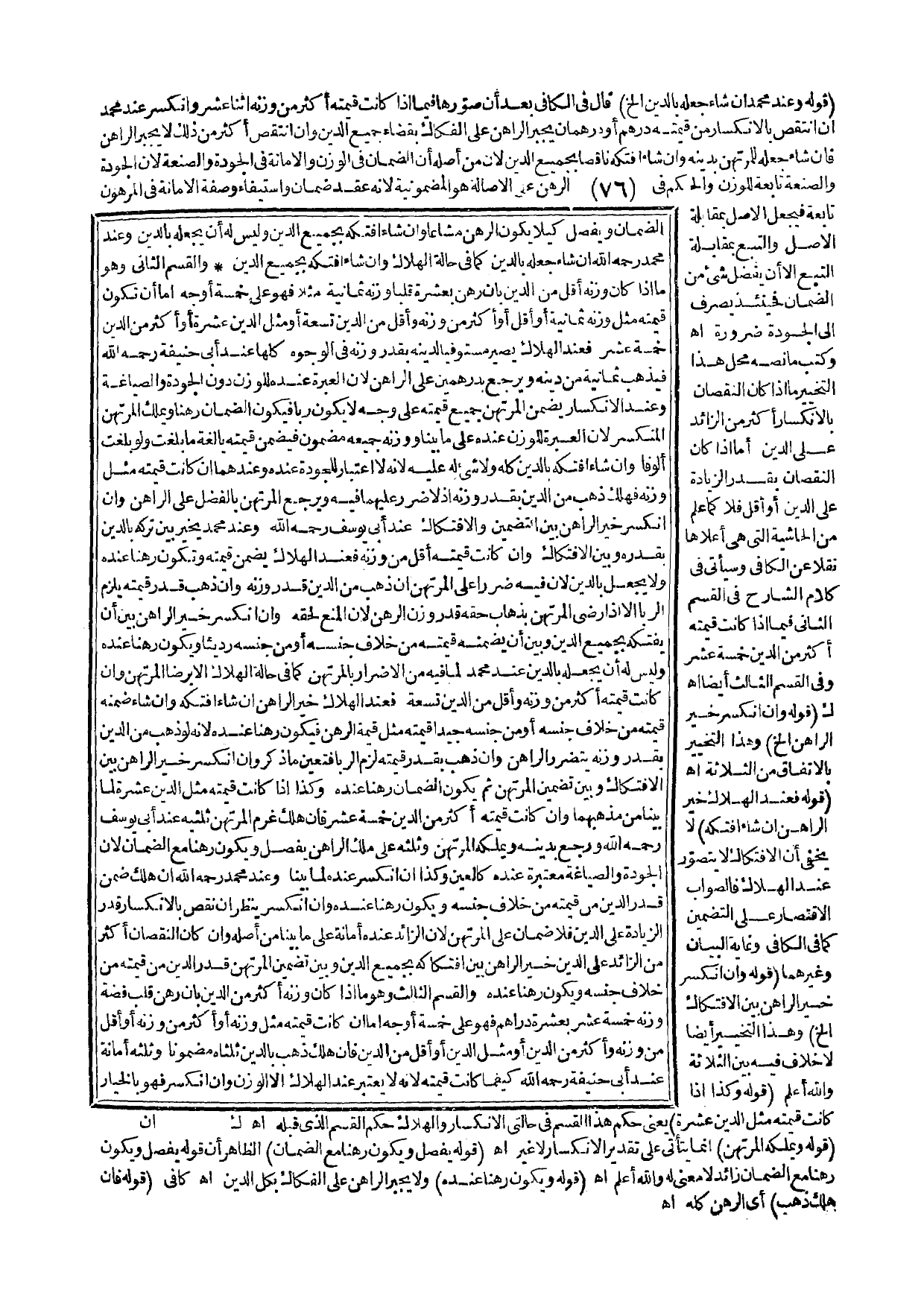 ـــــــــــــــــــــــــــــQقَوْلُهُ وَعِنْدَ مُحَمَّدٍ إنْ شَاءَ جَعَلَهُ بِالدَّيْنِ إلَخْ) قَالَ فِي الْكَافِي بَعْدَ أَنْ صَوَّرَهَا فِيمَا إذَا كَانَتْ قِيمَتُهُ أَكْثَرَ مِنْ وَزْنِهِ اثْنَا عَشَرَ وَانْكَسَرَ عِنْدَ مُحَمَّدٍ إنْ انْتَقَصَ بِالِانْكِسَارِ مِنْ قِيمَتِهِ دِرْهَمٌ أَوْ دِرْهَمَانِ يُجْبَرُ الرَّاهِنُ عَلَى الْفِكَاكِ بِقَضَاءِ جَمِيعِ الدَّيْنِ، وَإِنْ انْتَقَصَ أَكْثَرُ مِنْ ذَلِكَ لَا يُجْبَرُ الرَّاهِنُ فَإِنْ شَاءَ جَعَلَهُ لِلْمُرْتَهِنِ بِدَيْنِهِ، وَإِنْ شَاءَ افْتَكَّهُ نَاقِصًا بِجَمِيعِ الدَّيْنِ؛ لِأَنَّ مِنْ أَصْلِهِ أَنَّ الضَّمَانَ فِي الْوَزْنِ وَالْأَمَانَةَ فِي الْجَوْدَةِ وَالصَّنْعَةِ؛ لِأَنَّ الْجَوْدَةَ وَالصَّنْعَةَ تَابِعَةٌ لِلْوَزْنِ وَالْحُكْمُ فِي الرَّهْنِ عَلَى الْأَصَالَةِ هُوَ الْمَضْمُونِيَّةُ؛ لِأَنَّهُ عَقْدُ ضَمَانٍ وَاسْتِيفَاءٍ وَصِفَةُ الْأَمَانَةِ فِي الْمَرْهُونِ تَابِعَةٌ فَيُجْعَلُ الْأَصْلُ بِمُقَابَلَةِ الْأَصْلِ وَالتَّبَعُ بِمُقَابَلَةِ التَّبَعِ إلَّا أَنْ يَفْضُلَ شَيْءٌ مِنْ الضَّمَانِ فَحِينَئِذٍ يُصْرَفُ إلَى الْجَوْدَةِ ضَرُورَةً اهـ وَكَتَبَ مَا نَصُّهُ مَحَلُّ هَذَا التَّخْيِيرِ مَا إذَا كَانَ النُّقْصَانُ بِالِانْكِسَارِ أَكْثَرَ مِنْ الزَّائِدِ عَلَى الدَّيْنِ أَمَّا إذَا كَانَ النُّقْصَانُ بِقَدْرِ الزِّيَادَةِ عَلَى الدَّيْنِ أَوْ أَقَلَّ فَلَا كَمَا عُلِمَ مِنْ الْحَاشِيَةِ الَّتِي هِيَ أَعْلَاهَا نَقْلًا عَنْ الْكَافِي وَسَيَأْتِي فِي كَلَامِ الشَّارِحِ فِي الْقِسْمِ الثَّانِي فِيمَا إذَا كَانَتْ قِيمَتُهُ أَكْثَرَ مِنْ الدَّيْنِ خَمْسَةَ عَشَرَ وَفِي الْقِسْمِ الثَّالِثِ أَيْضًا اهـ.