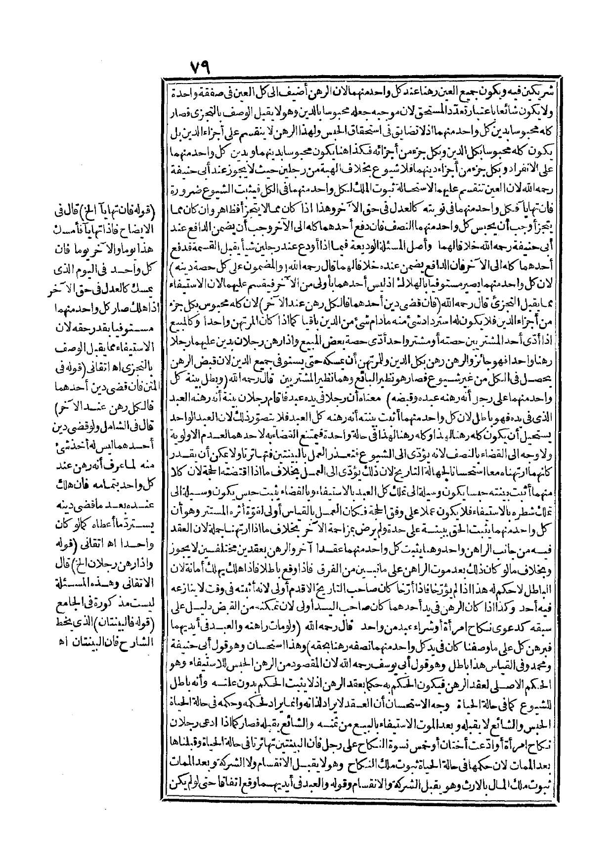 شَرِيكَيْنِ فِيهِ وَيَكُونُ جَمِيعُ الْعَيْنِ رَهْنًا عِنْدَ كُلِّ وَاحِدٍ مِنْهُمَا؛ لِأَنَّ الرَّهْنَ أُضِيفَ إلَى كُلِّ الْعَيْنِ فِي صَفْقَةٍ وَاحِدَةٍ وَلَا يَكُونُ شَائِعًا بِاعْتِبَارِ تَعَدُّدِ الْمُسْتَحِقِّ؛ لِأَنَّ مُوجِبَهُ جَعَلَهُ مَحْبُوسًا بِالدَّيْنِ، وَهُوَ لَا يَقْبَلُ الْوَصْفَ بِالتَّجَزِّي فَصَارَ كُلُّهُ مَحْبُوسًا بِدَيْنِ كُلِّ وَاحِدٍ مِنْهُمَا إذْ لَا تَضَايُقَ فِي اسْتِحْقَاقِ الْحَبْسِ؛ وَلِهَذَا الرَّهْنُ لَا يَنْقَسِمُ عَلَى أَجْزَاءِ الدَّيْنِ بَلْ يَكُونُ كُلُّهُ مَحْبُوسًا بِكُلِّ الدَّيْنِ وَبِكُلِّ جُزْءٍ مِنْ أَجْزَائِهِ فَكَذَا هُنَا يَكُونُ مَحْبُوسًا بِدَيْنِهِمَا وَبِدَيْنِ كُلِّ وَاحِدٍ مِنْهُمَا عَلَى الِانْفِرَادِ وَبِكُلِّ جُزْءٍ مِنْ أَجْزَاءِ دَيْنِهِمَا فَلَا شُيُوعَ بِخِلَافِ الْهِبَةِ مِنْ رَجُلَيْنِ حَيْثُ لَا تَجُوزُ عِنْدَ أَبِي حَنِيفَةَ - رَحِمَهُ اللَّهُ -؛ لِأَنَّ الْعَيْنَ تَنْقَسِمُ عَلَيْهِمَا لِاسْتِحَالَةِ ثُبُوتِ الْمِلْكِ لِكُلِّ وَاحِدٍ مِنْهُمَا فِي الْكُلِّ فَيَثْبُتُ الشُّيُوعُ ضَرُورَةً، فَإِنْ تَهَايَآ فَكُلُّ وَاحِدٍ مِنْهُمَا فِي نَوْبَتِهِ كَالْعِدْلِ فِي حَقِّ الْآخَرِ، وَهَذَا إذَا كَانَ مِمَّا لَا يَتَجَزَّأُ فَظَاهِرٌ، وَإِنْ كَانَ مِمَّا يَتَجَزَّأُ وَجَبَ أَنْ يَحْبِسَ كُلُّ وَاحِدٍ مِنْهُمَا النِّصْفَ، فَإِنْ دَفَعَ أَحَدُهُمَا كُلَّهُ إلَى الْآخَرِ وَجَبَ أَنْ يَضْمَنَ الدَّافِعُ عِنْدَ أَبِي حَنِيفَةَ - رَحِمَهُ اللَّهُ - خِلَافًا لَهُمَا وَأَصْلُ الْمَسْأَلَةِ الْوَدِيعَةُ فِيمَا إذَا أَوْدَعَ عِنْدَ رَجُلَيْنِ شَيْئًا يَقْبَلُ الْقِسْمَةَ فَدَفَعَ أَحَدُهُمَا كُلَّهُ إلَى الْآخَرِ فَإِنَّ الدَّافِعَ يَضْمَنُ عِنْدَهُ خِلَافًا لَهُمَا قَالَ - رَحِمَهُ اللَّهُ - (وَالْمَضْمُونُ عَلَى كُلٍّ حِصَّةُ دَيْنِهِ)؛ لِأَنَّ كُلَّ وَاحِدٍ مِنْهُمَا يَصِيرُ مُسْتَوْفِيًا بِالْهَلَاكِ إذْ لَيْسَ أَحَدُهُمَا بِأَوْلَى مِنْ الْآخَرِ فَيَقْسِمُ عَلَيْهِمَا؛ لِأَنَّ الِاسْتِيفَاءَ مِمَّا يَقْبَلُ التَّجْزِيءَ قَالَ - رَحِمَهُ اللَّهُ - (فَإِنْ قَضَى دَيْنَ أَحَدِهِمَا فَالْكُلُّ رَهْنٌ عِنْدَ الْآخَرِ)؛ لِأَنَّ كُلَّهُ مَحْبُوسٌ بِكُلِّ جُزْءٍ مِنْ أَجْزَاءِ الدَّيْنِ فَلَا يَكُونُ لَهُ اسْتِرْدَادُ شَيْءٍ مِنْهُ مَا دَامَ شَيْءٌ مِنْ الدَّيْنِ بَاقِيًا كَمَا إذَا كَانَ الْمُرْتَهِنُ وَاحِدًا وَكَالْمَبِيعِ إذَا أَدَّى أَحَدُ الْمُشْتَرِيَيْنِ حِصَّتَهُ أَوْ مُشْتَرٍ وَاحِدٌ أَدَّى حِصَّةَ بَعْضِ الْمَبِيعِ