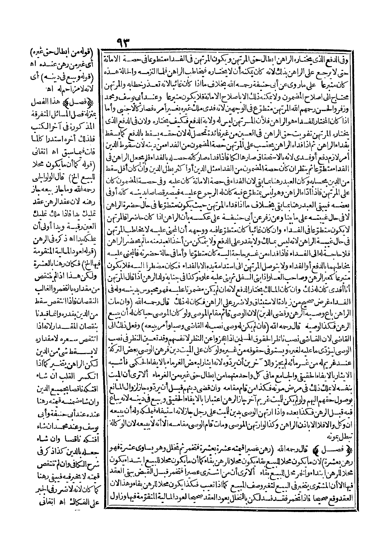 (فَصْلٌ) هَذَا الْفَصْلُ بِمَنْزِلَةِ فَصْلِ الْمَسَائِلِ الْمُتَفَرِّقَةِ الْمَذْكُورَةِ فِي آخِرِ الْكُتُبِ فَلِذَلِكَ أَخَّرَهُ اسْتِدْرَاكًا لِمَا فَاتَ فِيمَا سَبَقَ. اهـ. أَتْقَانِيٌّ (قَوْلُهُ كَمَا أَنَّ مَا يَكُونُ مَحَلًّا لِلْبَيْعِ إلَخْ) قَالَ الْوَلْوَالِجِيُّ - رَحِمَهُ اللَّهُ -: وَمَا جَازَ بَيْعُهُ جَازَ رَهْنُهُ:؛ لِأَنَّ عَقْدَ الرَّهْنِ عَقْدُ تَمْلِيكٍ يَدًا، فَإِذَا مَلَكَ تَمْلِيكَ الْعَيْنِ رَقَبَةً وَيَدًا أَوْلَى أَنْ يَمْلِكَهُ يَدًا اهـ ذَكَرَهُ فِي الرَّهْنِ (قَوْلُهُ لِعَوْدِ الْمَالِيَّةِ الْمُتَقَوِّمَةِ فِيهَا إلَخْ) فَكَانَ رَهْنًا بِالْعَشَرَةِ، وَلَكِنَّ هَذَا إذَا لَمْ يَنْتَقِصْ مِنْ مِقْدَارِهِ بِالتَّخَمُّرِ وَالْغَالِبُ النُّقْصَانُ، فَإِذَا انْتَقَصَ سَقَطَ مِنْ الدَّيْن بِقَدْرِهِ، وَإِنَّمَا قَيَّدْنَا بِنُقْصَانِ الْمِقْدَارِ؛ لِأَنَّهُ إذَا انْتَقَصَ سِعْرُهُ لَا مِقْدَارُهُ لَا يَسْقُطُ شَيْءٌ مِنْ الدَّيْنِ لَكِنَّ الرَّاهِنَ يَتَخَيَّرُ كَمَا إذَا انْكَسَرَ الْقُلْبُ إنْ شَاءَ افْتَكَّهُ نَاقِصًا بِجَمِيعِ الدَّيْنِ، وَإِنْ شَاءَ ضَمَّنَهُ قِيمَتَهُ رَهْنًا عِنْدَهُ عِنْدَ أَبِي حَنِيفَةَ وَأَبِي يُوسُفَ وَعِنْدَ مُحَمَّدٍ إنْ شَاءَ افْتَكَّهُ نَاقِصًا، وَإِنْ شَاءَ جَعَلَهُ بِالدَّيْنِ كَذَا ذَكَرَ فِي شَرْحِ الْكَافِي، وَإِنْ لَمْ تُنْتَقَصْ قِيمَتُهُ لَا يُخَيَّرُ فِيهِ فَيَبْقَى رَهْنًا كَمَا كَانَ؛ لِأَنَّهُ لَا ضَرَرَ فِي الْجَبْرِ عَلَى الْفِكَاكِ. اهـ. أَتْقَانِيٌّ