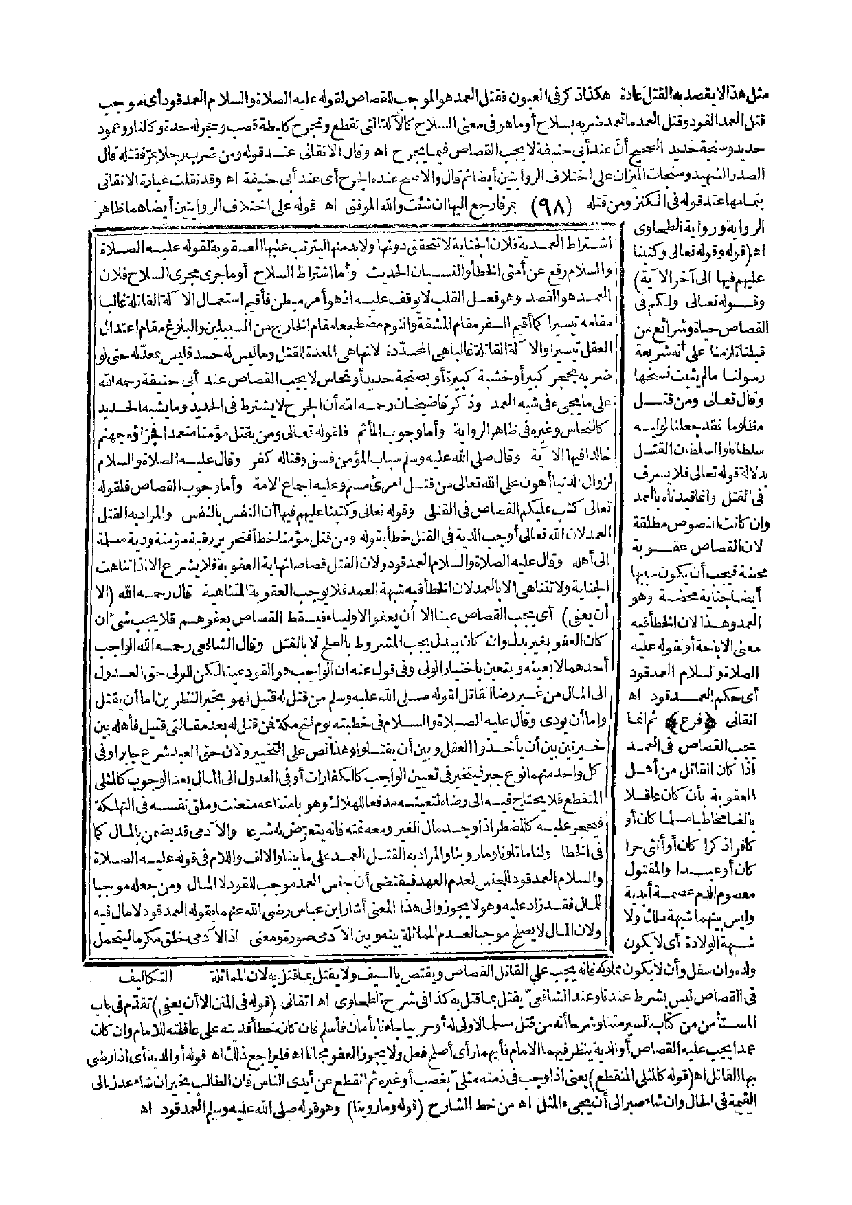 وَقَالَ الْأَتْقَانِيُّ: عِنْدَ قَوْلِهِ وَمَنْ ضَرَبَ رَجُلًا بِمَرٍّ فَقَتَلَهُ قَالَ الصَّدْرُ الشَّهِيدُ وَسَنَجَاتُ الْمِيزَانِ عَلَى اخْتِلَافِ الرِّوَايَتَيْنِ أَيْضًا ثُمَّ قَالَ وَالْأَصَحُّ عِنْدَهُ الْجُرْحُ أَيْ عِنْدَ أَبِي حَنِيفَةَ اهـ وَقَدْ نَقَلْت عِبَارَةَ الْأَتْقَانِيِّ بِتَمَامِهَا عِنْدَ قَوْلِهِ فِي الْكَنْزِ وَمَنْ قَتَلَهُ بِمَرٍّ فَارْجِعْ إلَيْهَا إنْ شِئْت وَاَللَّهُ الْمُوَفِّقُ اهـ قَوْلُهُ عَلَى اخْتِلَافِ الرِّوَايَتَيْنِ أَيْضًا هُمَا ظَاهِرُ الرِّوَايَةِ وَرِوَايَةُ الطَّحَاوِيِّ. اهـ. (قَوْلُهُ وقَوْله تَعَالَى {وَكَتَبْنَا عَلَيْهِمْ فِيهَا} [المائدة: 45] إلَى آخِرِ الْآيَةِ) وقَوْله تَعَالَى {وَلَكُمْ فِي الْقِصَاصِ حَيَاةٌ} [البقرة: 179] وَشَرَائِعُ مَنْ قَبْلَنَا تَلْزَمُنَا عَلَى أَنَّهُ شَرِيعَةُ رَسُولِنَا مَا لَمْ يَثْبُتْ نَسْخُهَا وَقَالَ تَعَالَى {وَمَنْ قُتِلَ مَظْلُومًا فَقَدْ جَعَلْنَا لِوَلِيِّهِ سُلْطَانًا} [الإسراء: 33] وَالسُّلْطَانُ الْقَتْلُ بِدَلَالَةِ قَوْله تَعَالَى {فَلا يُسْرِفْ فِي الْقَتْلِ} [الإسراء: 33] وَإِنَّمَا قَيَّدْنَاهُ بِالْعَمْدِ، وَإِنْ كَانَتْ النُّصُوصُ مُطْلَقَةً؛ لِأَنَّ الْقِصَاصَ عُقُوبَةٌ مَحْضَةٌ فَيَجِبُ أَنْ يَكُونَ سَبَبُهَا أَيْضًا جِنَايَةً مَحْضَةً، وَهُوَ الْعَمْدُ.