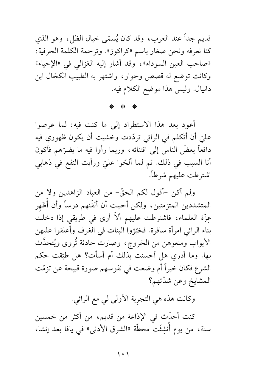 أعود بعد هذا الاستطراد إلى ما كنت فيه: لما عرضوا عليّ أن أتكلم في الرائي تردّدت وخشيت أن يكون ظهوري فيه دافعاً بعضَ الناس إلى اقتنائه، وربما رأوا فيه ما يضرّهم فأكون أنا السبب في ذلك. ثم لما ألحّوا عليّ ورأيت النفع في ذهابي اشترطت عليهم شرطاً.
