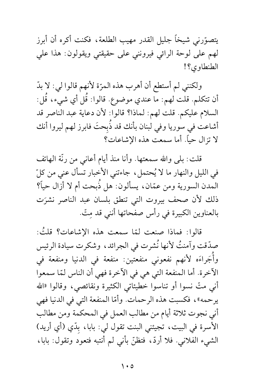 ولكنني لم أستطع أن أهرب هذه المرّة لأنهم قالوا لي: لا بدّ أن تتكلم. قلت لهم: ما عندي موضوع. قالوا: قُل أي شيء، قُل: السلام عليكم. قلت لهم: لماذا؟ قالوا: لأن دعاية عبد الناصر قد أشاعت في سوريا وفي لبنان بأنك قد ذُبِحتَ فابرز لهم ليروا أنك لا تزال حياً. أما سمعت هذه الإشاعات؟