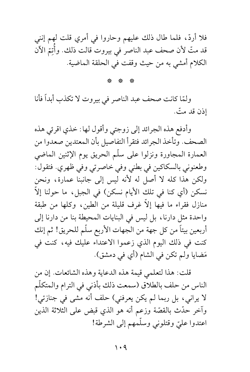 وأدفع هذه الجرائد إلى زوجتي وأقول لها: خذي اقرئي هذه الصحف. وتأخذ الجرائد فتقرأ التفاصيل بأن المعتدين صعدوا من العمارة المجاورة ونزلوا على سلّم الحريق يوم الإثنين الماضي وطعنوني بالسكاكين في بطني وفي خاصرتي وفي ظهري. فتقول: ولكن هذا كله لا أصل له لأنه ليس إلى جانبنا عمارة، ونحن نسكن (أي كنا في تلك الأيام نسكن) في الجبل، ما حولنا إلاّ منازل فقراء ما فيها إلاّ غرف قليلة من الطين، وكلها من طبقة واحدة مثل دارنا، بل ليس في البنايات المحيطة بنا من دارنا إلى أربعين بيتاً من كل جهة من الجهات الأربع سلّم للحريق! ثم إنك كنت في ذلك اليوم الذي زعموا الاعتداء عليك فيه، كنت في مَضايا ولم تكن في الشام (أي في دمشق).