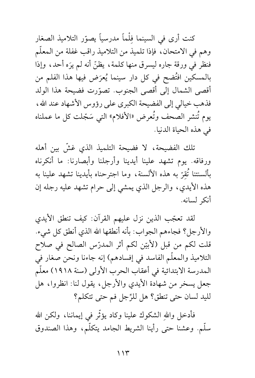 كنت أرى في السينما فِلْماً مدرسياً يصوّر التلاميذ الصغار وهم في الامتحان، فإذا تلميذ من التلاميذ راقب غفلة من المعلّم فنظر في ورقة جاره ليسرق منها كلمة، يظنّ أنه لم يرَه أحد، وإذا بالمسكين افتُضح في كل دار سينما يُعرَض فيها هذا الفلم من أقصى الشمال إلى أقصى الجنوب. تصوّرت فضيحة هذا الولد فذهب خيالي إلى الفضيحة الكبرى على رؤوس الأشهاد عند الله، يوم تُنشر الصحف وتُعرض «الأفلام» التي سَجّلت كل ما عملناه في هذه الحياة الدنيا.