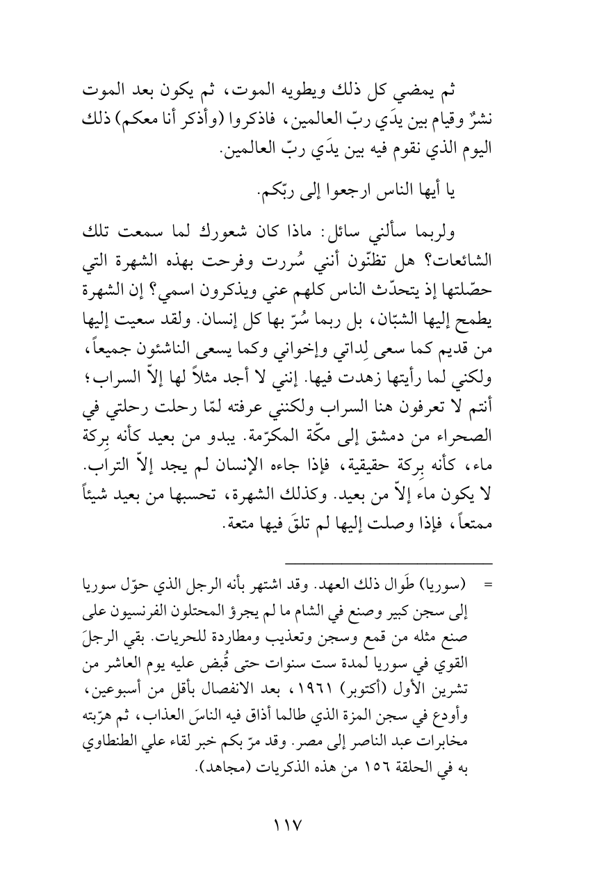 ولربما سألني سائل: ماذا كان شعورك لما سمعت تلك الشائعات؟ هل تظنّون أنني سُررت وفرحت بهذه الشهرة التي حصّلتها إذ يتحدّث الناس كلهم عني ويذكرون اسمي؟ إن الشهرة يطمح إليها الشبّان، بل ربما سُرّ بها كل إنسان. ولقد سعيت إليها من قديم كما سعى لِداتي وإخواني وكما يسعى الناشئون جميعاً، ولكني لما رأيتها زهدت فيها. إنني لا أجد مثلاً لها إلاّ السراب؛ أنتم لا تعرفون هنا السراب ولكنني عرفته لمّا رحلت رحلتي في الصحراء من دمشق إلى مكّة المكرّمة. يبدو من بعيد كأنه بِركة ماء، كأنه بِركة حقيقية، فإذا جاءه الإنسان لم يجد إلاّ التراب. لا يكون ماء إلاّ من بعيد. وكذلك الشهرة، تحسبها من بعيد شيئاً ممتعاً، فإذا وصلت إليها لم تلقَ فيها متعة.