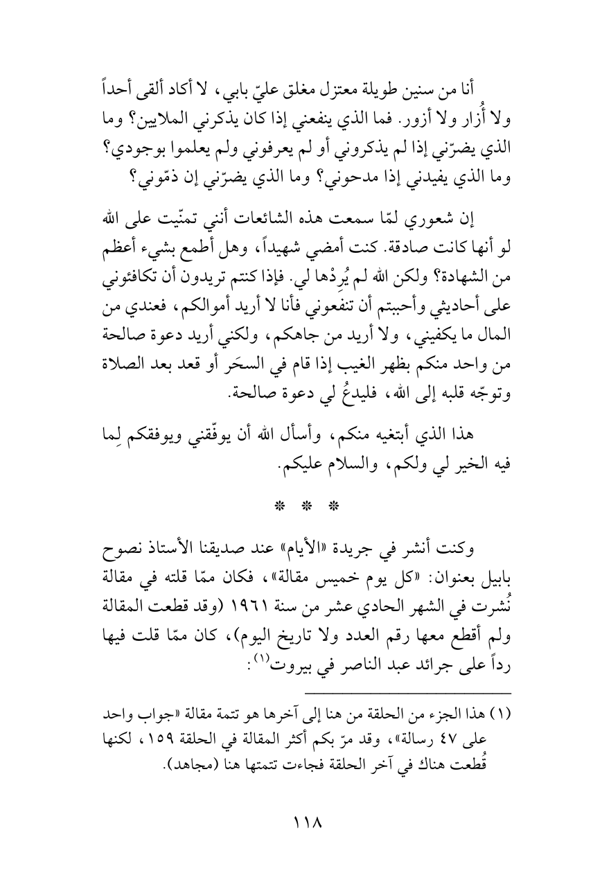 وكنت أنشر في جريدة «الأيام» عند صديقنا الأستاذ نصوح بابيل بعنوان: «كل يوم خميس مقالة»، فكان ممّا قلته في مقالة نُشرت في الشهر الحادي عشر من سنة 1961 (وقد قطعت المقالة ولم أقطع معها رقم العدد ولا تاريخ اليوم)، كان ممّا قلت فيها رداً على جرائد عبد الناصر في بيروت (¬1):