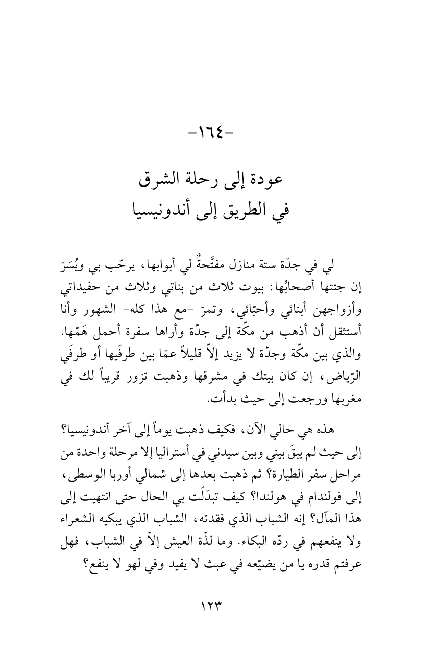 هذه هي حالي الآن، فكيف ذهبت يوماً إلى آخر أندونيسيا؟ إلى حيث لم يبقَ بيني وبين سيدني في أستراليا إلا مرحلة واحدة من مراحل سفر الطيارة؟ ثم ذهبت بعدها إلى شمالي أوربا الوسطى، إلى فولندام في هولندا؟ كيف تبدّلَت بي الحال حتى انتهيت إلى هذا المآل؟ إنه الشباب الذي فقدته، الشباب الذي يبكيه الشعراء ولا ينفعهم في ردّه البكاء. وما لذّة العيش إلاّ في الشباب، فهل عرفتم قدره يا من يضيّعه في عبث لا يفيد وفي لهو لا ينفع؟