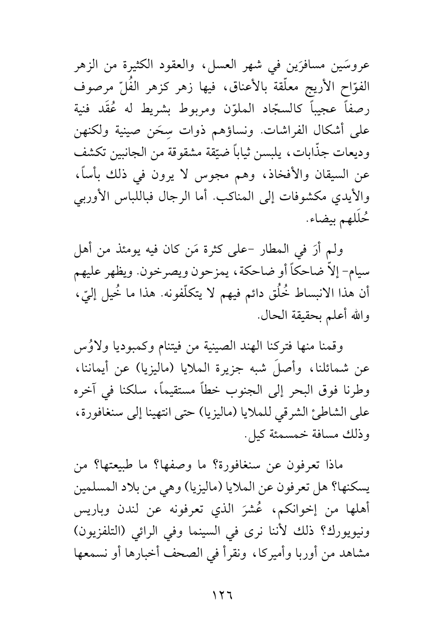 ماذا تعرفون عن سنغافورة؟ ما وصفها؟ ما طبيعتها؟ من يسكنها؟ هل تعرفون عن الملايا (ماليزيا) وهي من بلاد المسلمين أهلها من إخوانكم، عُشرَ الذي تعرفونه عن لندن وباريس ونيويورك؟ ذلك لأننا نرى في السينما وفي الرائي (التلفزيون) مشاهد من أوربا وأميركا، ونقرأ في الصحف أخبارها أو نسمعها