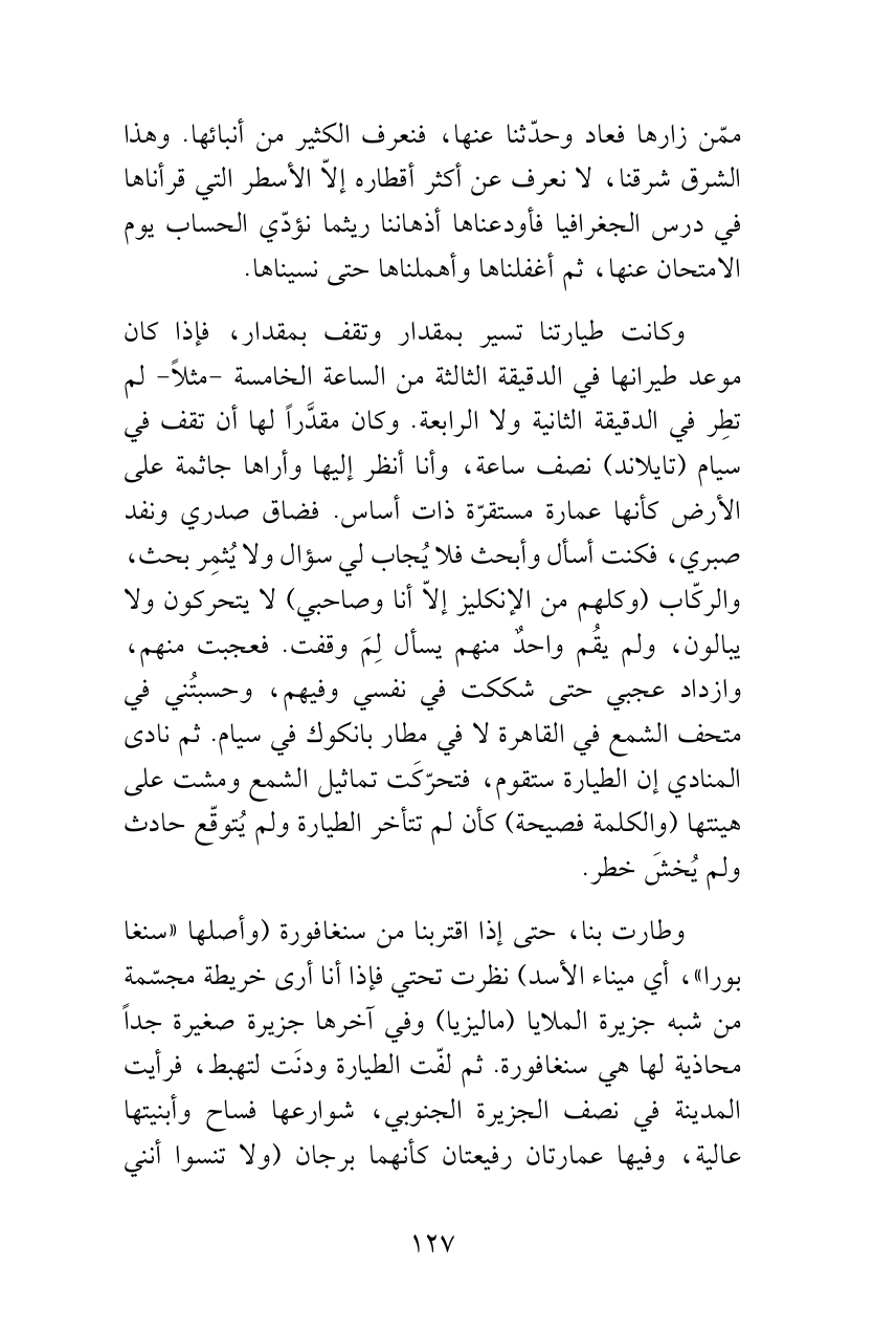 وطارت بنا، حتى إذا اقتربنا من سنغافورة (وأصلها «سنغا بورا»، أي ميناء الأسد) نظرت تحتي فإذا أنا أرى خريطة مجسّمة من شبه جزيرة الملايا (ماليزيا) وفي آخرها جزيرة صغيرة جداً محاذية لها هي سنغافورة. ثم لفّت الطيارة ودنَت لتهبط، فرأيت المدينة في نصف الجزيرة الجنوبي، شوارعها فساح وأبنيتها عالية، وفيها عمارتان رفيعتان كأنهما برجان (ولا تنسوا أنني
