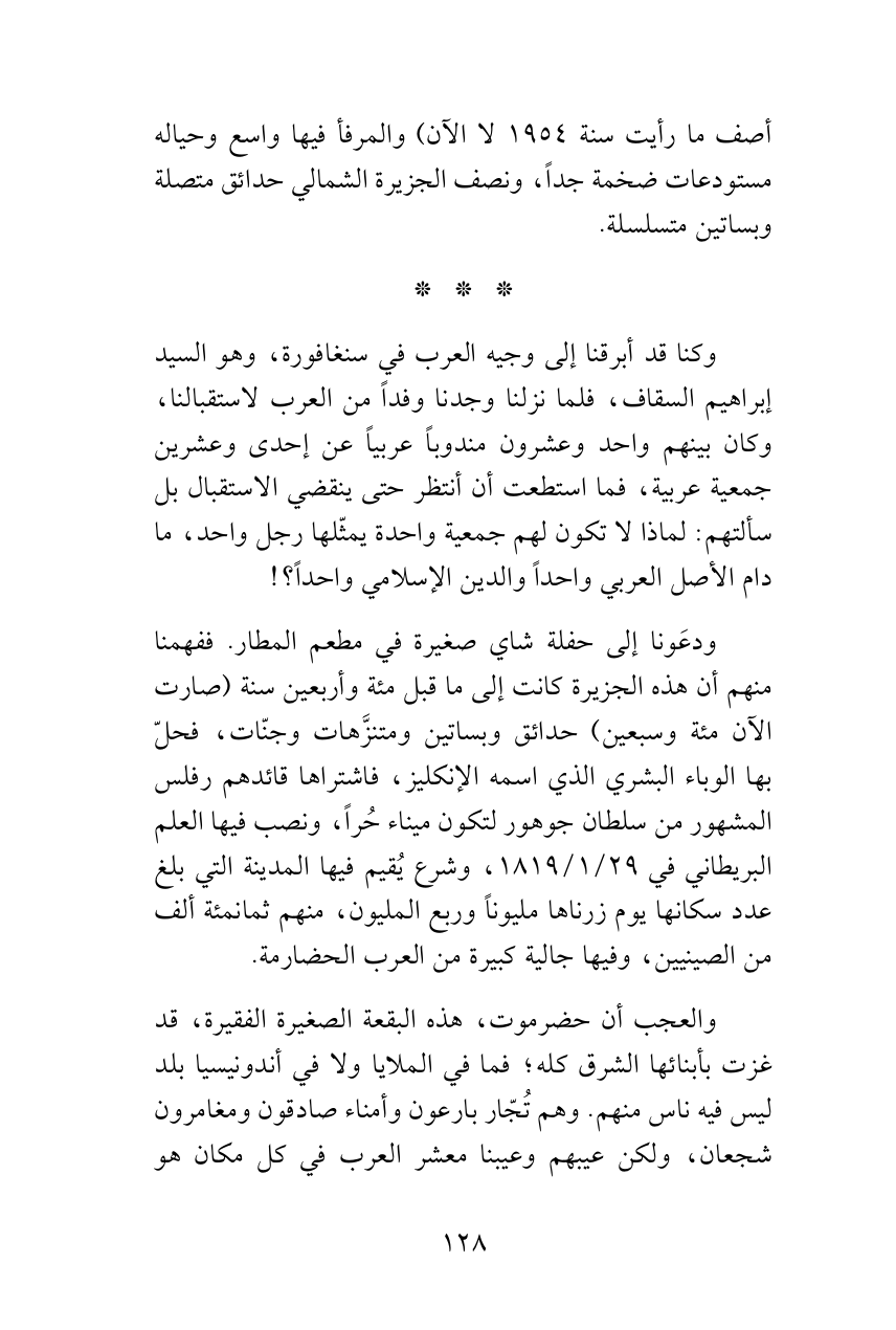 ودعَونا إلى حفلة شاي صغيرة في مطعم المطار. ففهمنا منهم أن هذه الجزيرة كانت إلى ما قبل مئة وأربعين سنة (صارت الآن مئة وسبعين) حدائق وبساتين ومتنزَّهات وجنّات، فحلّ بها الوباء البشري الذي اسمه الإنكليز، فاشتراها قائدهم رفلس المشهور من سلطان جوهور لتكون ميناء حُراً، ونصب فيها العلم البريطاني في 29/ 1/1819، وشرع يُقيم فيها المدينة التي بلغ عدد سكانها يوم زرناها مليوناً وربع المليون، منهم ثمانمئة ألف من الصينيين، وفيها جالية كبيرة من العرب الحضارمة.