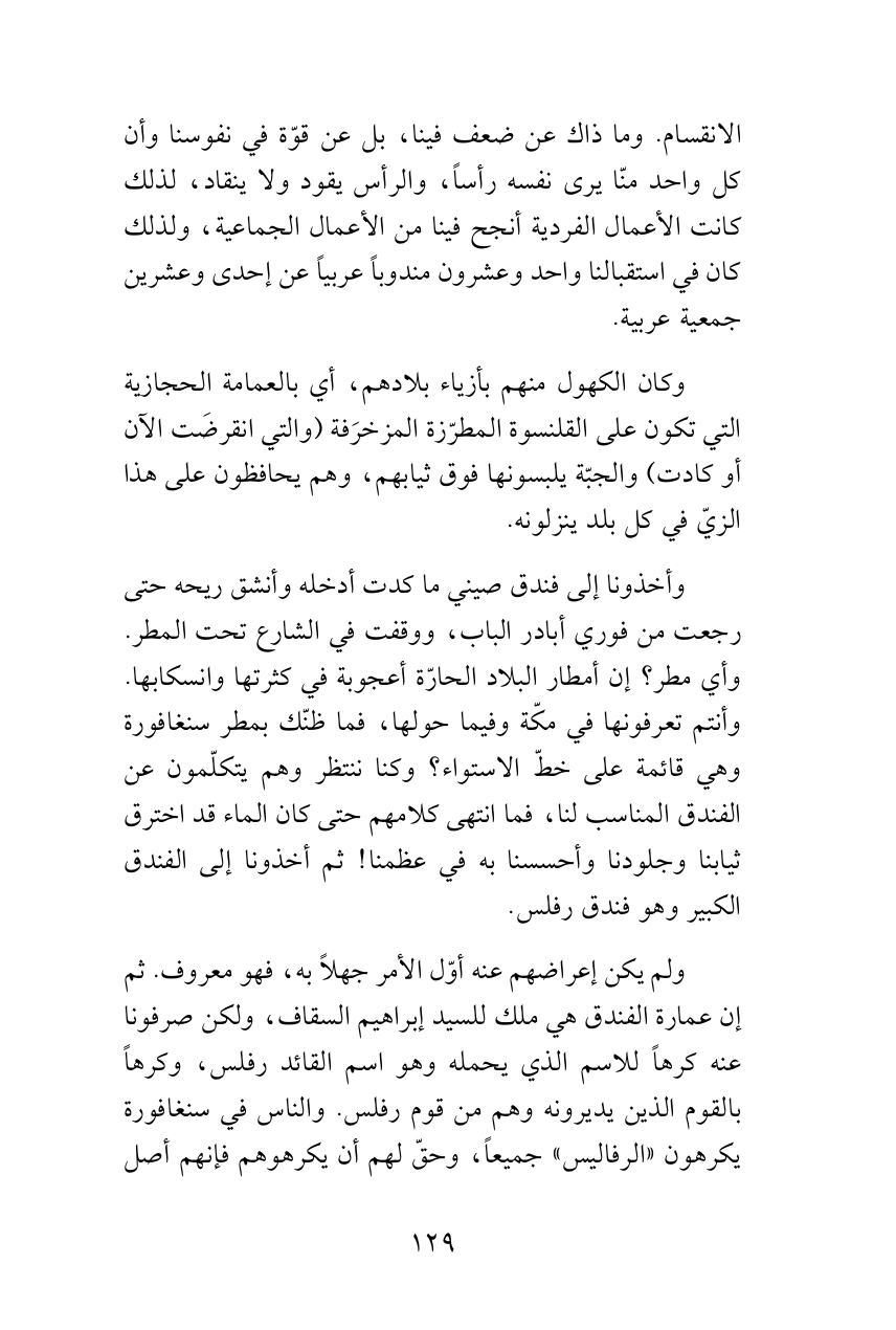 ولم يكن إعراضهم عنه أوّل الأمر جهلاً به، فهو معروف. ثم إن عمارة الفندق هي ملك للسيد إبراهيم السقاف، ولكن صرفونا عنه كرهاً للاسم الذي يحمله وهو اسم القائد رفلس، وكرهاً بالقوم الذين يديرونه وهم من قوم رفلس. والناس في سنغافورة يكرهون «الرفاليس» جميعاً، وحقّ لهم أن يكرهوهم فإنهم أصل