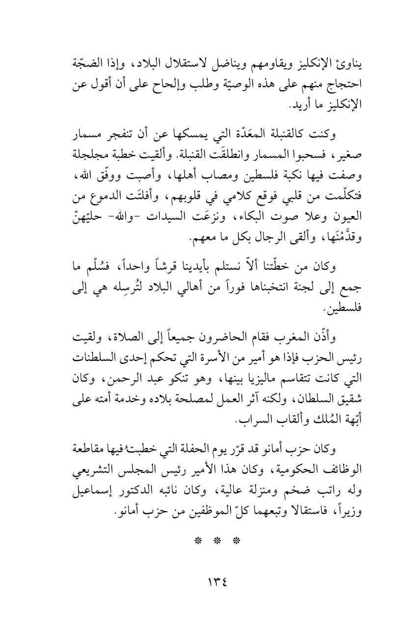 وكان حزب أمانو قد قرّر يوم الحفلة التي خطبتُ فيها مقاطعة الوظائف الحكومية، وكان هذا الأمير رئيس المجلس التشريعي وله راتب ضخم ومنزلة عالية، وكان نائبه الدكتور إسماعيل وزيراً، فاستقالا وتبعهما كلّ الموظفين من حزب أمانو.