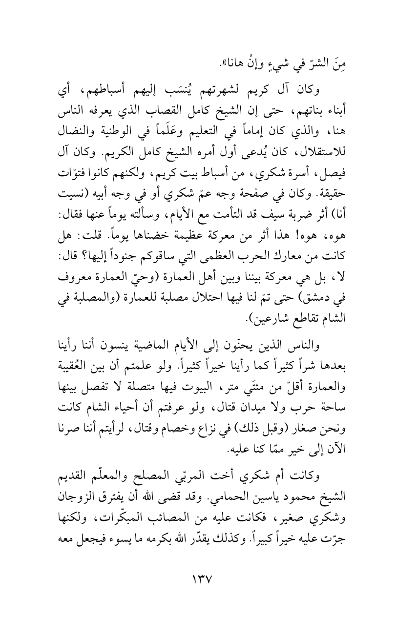 وكان آل كريم لشهرتهم يُنسَب إليهم أسباطهم، أي أبناء بناتهم، حتى إن الشيخ كامل القصاب الذي يعرفه الناس هنا، والذي كان إماماً في التعليم وعَلَماً في الوطنية والنضال للاستقلال، كان يُدعى أول أمره الشيخ كامل الكريم. وكان آل فيصل، أسرة شكري، من أسباط بيت كريم، ولكنهم كانوا فتوّات حقيقة. وكان في صفحة وجه عمّ شكري أو في وجه أبيه (نسيت أنا) أثر ضربة سيف قد التأمت مع الأيام، وسألته يوماً عنها فقال: هوه، هوه! هذا أثر من معركة عظيمة خضناها يوماً. قلت: هل كانت من معارك الحرب العظمى التي ساقوكم جنوداً إليها؟ قال: لا، بل هي معركة بيننا وبين أهل العمارة (وحيّ العمارة معروف في دمشق) حتى تمّ لنا فيها احتلال مصلبة للعمارة (والمصلبة في الشام تقاطع شارعين).