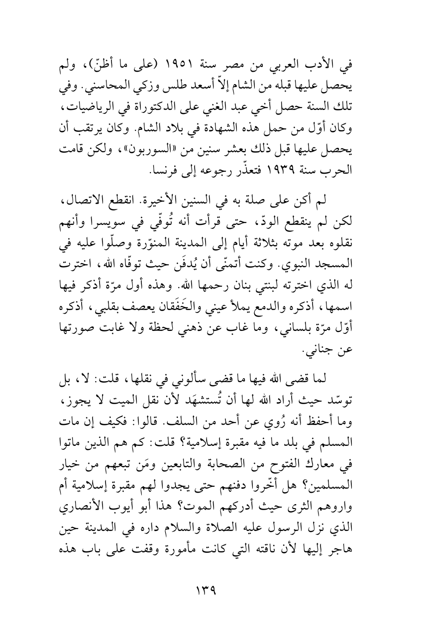 لم أكن على صلة به في السنين الأخيرة. انقطع الاتصال، لكن لم ينقطع الودّ، حتى قرأت أنه تُوفّي في سويسرا وأنهم نقلوه بعد موته بثلاثة أيام إلى المدينة المنوّرة وصلّوا عليه في المسجد النبوي. وكنت أتمنّى أن يُدفَن حيث توفّاه الله، اخترت له الذي اخترته لبنتي بنان رحمها الله. وهذه أول مرّة أذكر فيها اسمها، أذكره والدمع يملأ عيني والخَفَقان يعصف بقلبي، أذكره أوّل مرّة بلساني، وما غاب عن ذهني لحظة ولا غابت صورتها عن جناني.