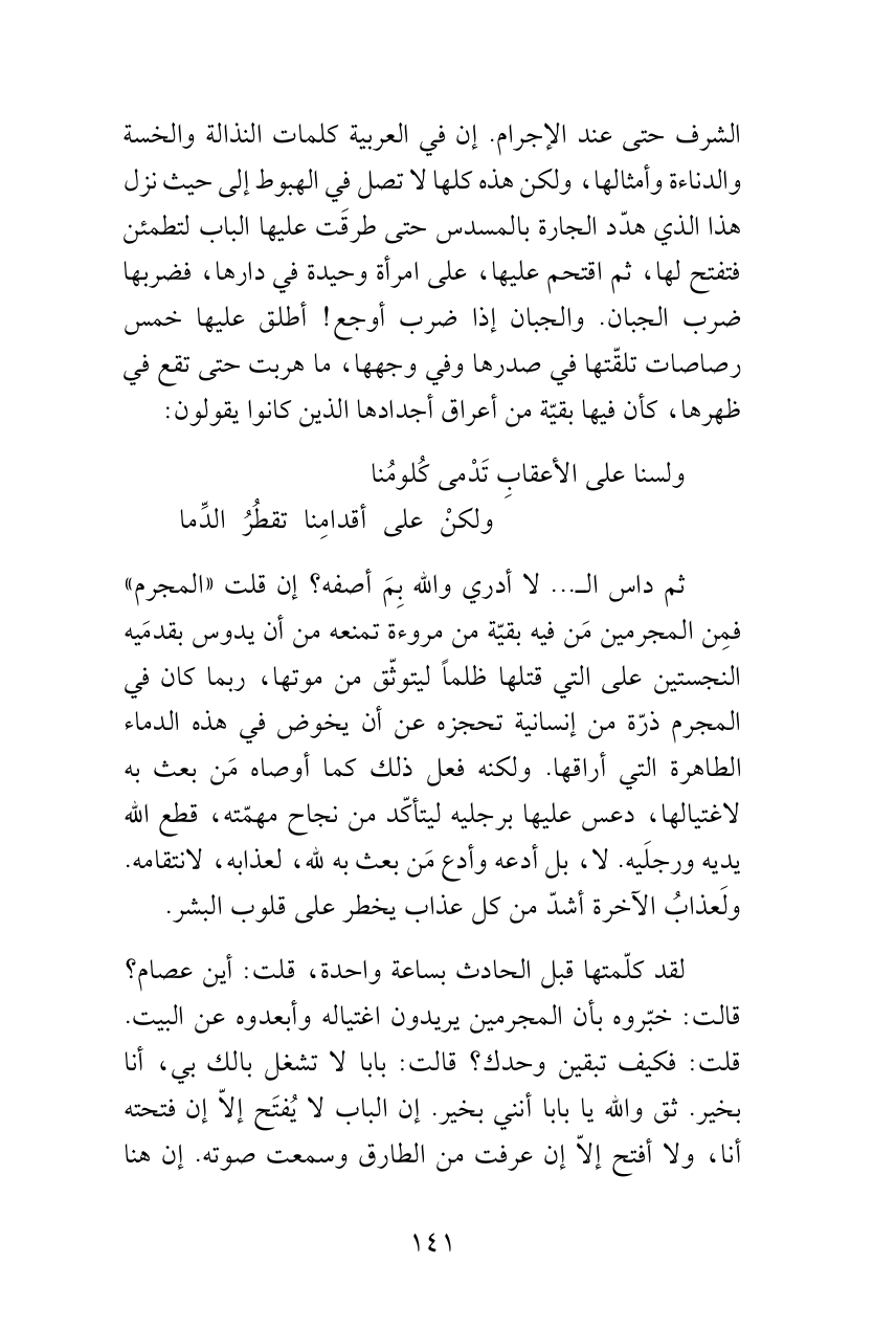 ثم داس الـ ... لا أدري والله بِمَ أصفه؟ إن قلت «المجرم» فمِن المجرمين مَن فيه بقيّة من مروءة تمنعه من أن يدوس بقدمَيه النجستين على التي قتلها ظلماً ليتوثّق من موتها، ربما كان في المجرم ذرّة من إنسانية تحجزه عن أن يخوض في هذه الدماء الطاهرة التي أراقها. ولكنه فعل ذلك كما أوصاه مَن بعث به لاغتيالها، دعس عليها برجليه ليتأكّد من نجاح مهمّته، قطع الله يديه ورجلَيه. لا، بل أدعه وأدع مَن بعث به لله، لعذابه، لانتقامه. ولَعذابُ الآخرة أشدّ من كل عذاب يخطر على قلوب البشر.