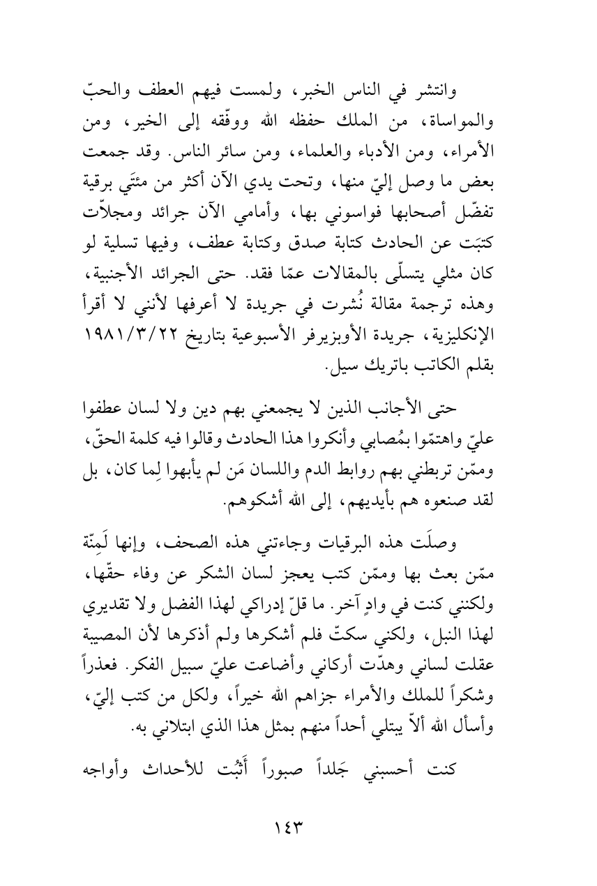 وانتشر في الناس الخبر، ولمست فيهم العطف والحبّ والمواساة، من الملك حفظه الله ووفّقه إلى الخير، ومن الأمراء، ومن الأدباء والعلماء، ومن سائر الناس. وقد جمعت بعض ما وصل إليّ منها، وتحت يدي الآن أكثر من مئتَي برقية تفضّل أصحابها فواسوني بها، وأمامي الآن جرائد ومجلاّت كتبَت عن الحادث كتابة صدق وكتابة عطف، وفيها تسلية لو كان مثلي يتسلّى بالمقالات عمّا فقد. حتى الجرائد الأجنبية، وهذه ترجمة مقالة نُشرت في جريدة لا أعرفها لأنني لا أقرأ الإنكليزية، جريدة الأوبزيرفر الأسبوعية بتاريخ 22/ 3/1981 بقلم الكاتب باتريك سيل.