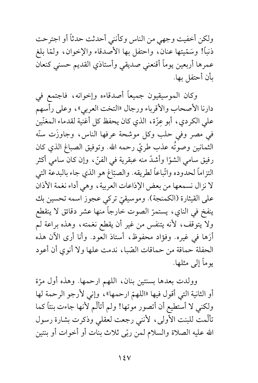 وكان الموسيقيون جميعاً أصدقاءه وإخوانه، فاجتمع في دارنا الأصحاب والأقرباء ورجال «التخت العربي»، وعلى رأسهم علي الكردي، أبو عِزّة، الذي كان يحفظ كل أغنية لقدماء المغنّين في مصر وفي حلب وكل موشحة عرفها الناس، وجاوزَت سنّه الثمانين وصوتُه عذب طريّ رحمه الله. وتوفيق الصباغ الذي كان رفيق سامي الشوّا وأشدّ منه عبقرية في الفنّ، وإن كان سامي أكثر التزاماً لحدوده واتّباعاً لطريقه. والصبّاغ هو الذي جاء بالبدعة التي لا نزال نسمعها من بعض الإذاعات العربية، وهي أداء نغمة الأذان على القيثارة (الكمنجة). وموسيقيّ تركي عجوز اسمه تحسين بك ينفخ في الناي، يستمرّ الصوت خارجاً منها عشر دقائق لا ينقطع ولا يتوقف، لأنه يتنفس من غير أن يقطع نغمته، وهذه براعة لم أرَها في غيره. وفؤاد محفوظ، أستاذ العود. وأنا أرى الآن هذه الحفلة حماقة من حماقات الصّبا، ندمت علها ولا أنوي أن أعود يوماً إلى مثلها.