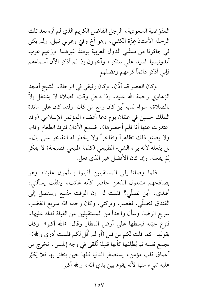 وكان العصر قد أذّن، وكان رفيقي في الرحلة، الشيخ أمجد الزهاوي رحمة الله عليه، إذا دخل وقت الصلاة لا يشتغل إلاّ بالصلاة، سواء لديه أين كان ومع مَن كان. ولقد كان على مائدة الملك حسين في عمّان يوم دعا أعضاء المؤتمر الإسلامي (وقد اعتذرت عنها أنا فلم أحضرها)، فسمع الأذان فترك الطعام وقام. ولا يصنع ذلك تظاهراً وتفاخراً ولا يخطر له التفاخر على بال، بل يفعله لأنه يراه الشيء الطبيعي (كلمة طبيعي فصيحة) لا يفكّر لِمَ يفعله. وإن كان الأفضل غير الذي فعل.