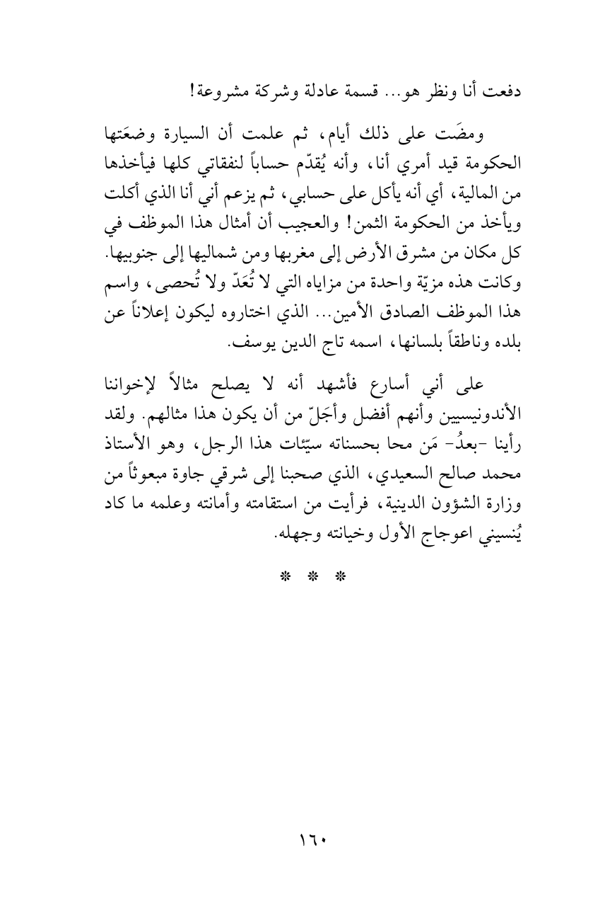 على أني أسارع فأشهد أنه لا يصلح مثالاً لإخواننا الأندونيسيين وأنهم أفضل وأجَلّ من أن يكون هذا مثالهم. ولقد رأينا -بعدُ- مَن محا بحسناته سيّئات هذا الرجل، وهو الأستاذ محمد صالح السعيدي، الذي صحبنا إلى شرقي جاوة مبعوثاً من وزارة الشؤون الدينية، فرأيت من استقامته وأمانته وعلمه ما كاد يُنسيني اعوجاج الأول وخيانته وجهله.
