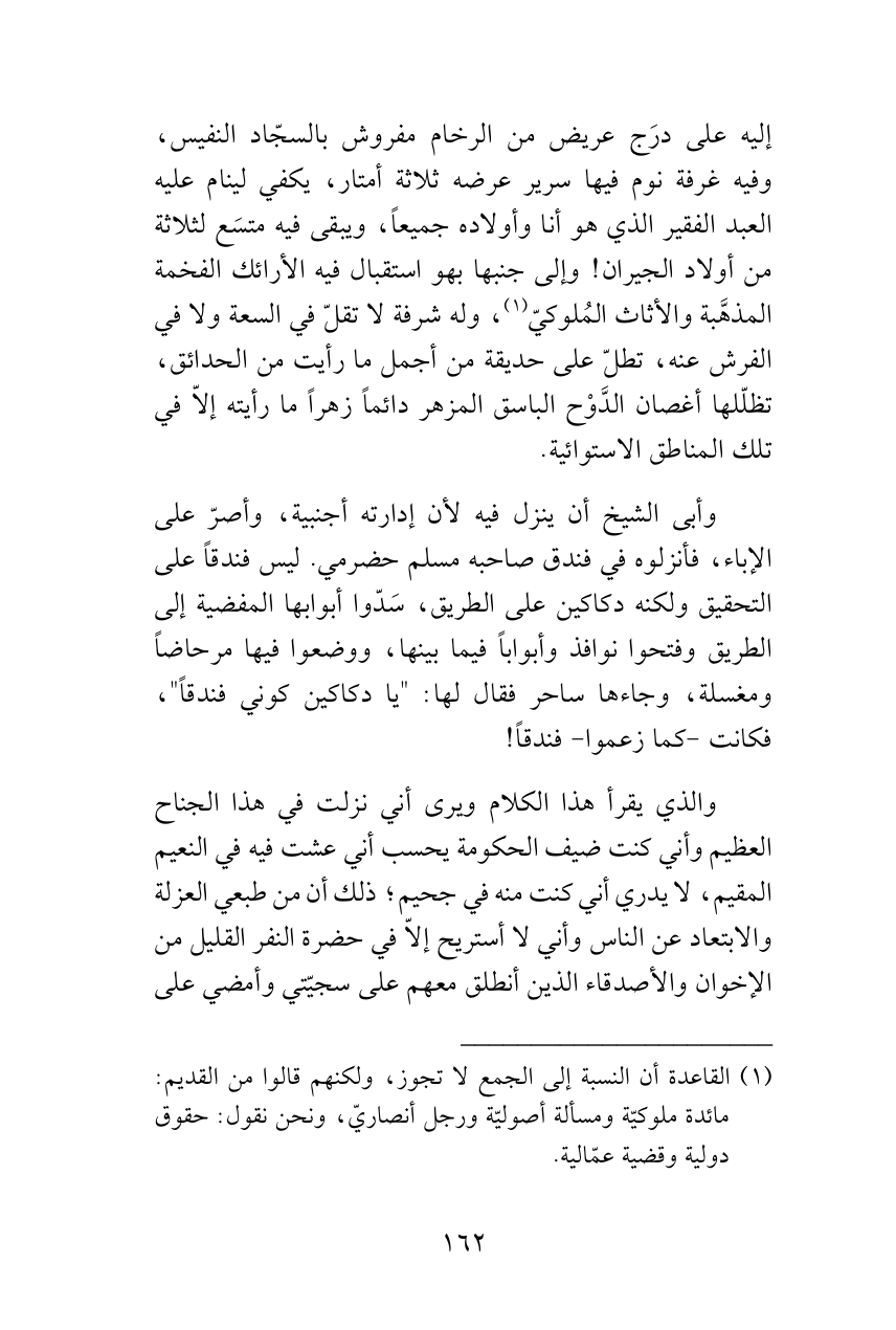 والذي يقرأ هذا الكلام ويرى أني نزلت في هذا الجناح العظيم وأني كنت ضيف الحكومة يحسب أني عشت فيه في النعيم المقيم، لا يدري أني كنت منه في جحيم؛ ذلك أن من طبعي العزلة والابتعاد عن الناس وأني لا أستريح إلاّ في حضرة النفر القليل من الإخوان والأصدقاء الذين أنطلق معهم على سجيّتي وأمضي على