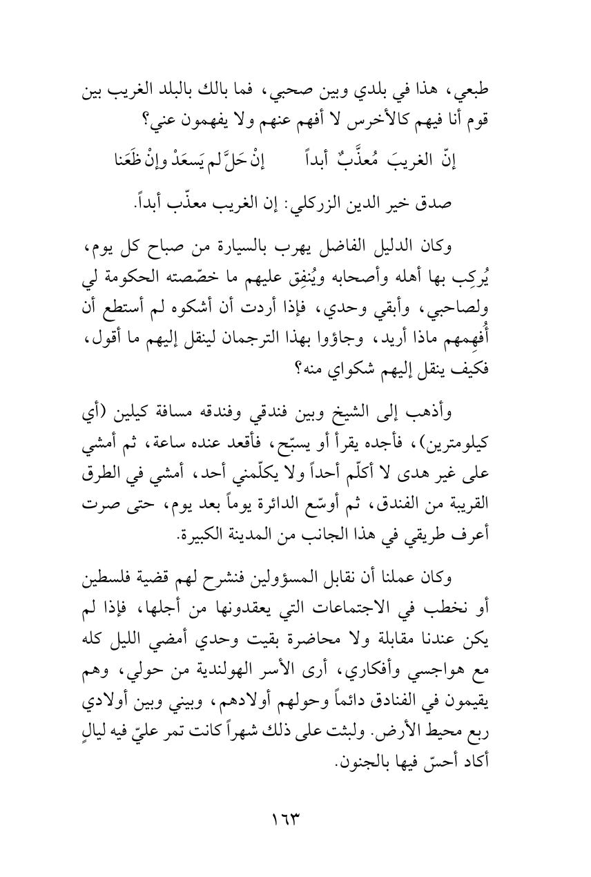 وكان عملنا أن نقابل المسؤولين فنشرح لهم قضية فلسطين أو نخطب في الاجتماعات التي يعقدونها من أجلها، فإذا لم يكن عندنا مقابلة ولا محاضرة بقيت وحدي أمضي الليل كله مع هواجسي وأفكاري، أرى الأسر الهولندية من حولي، وهم يقيمون في الفنادق دائماً وحولهم أولادهم، وبيني وبين أولادي ربع محيط الأرض. ولبثت على ذلك شهراً كانت تمر عليّ فيه ليالٍ أكاد أحسّ فيها بالجنون.